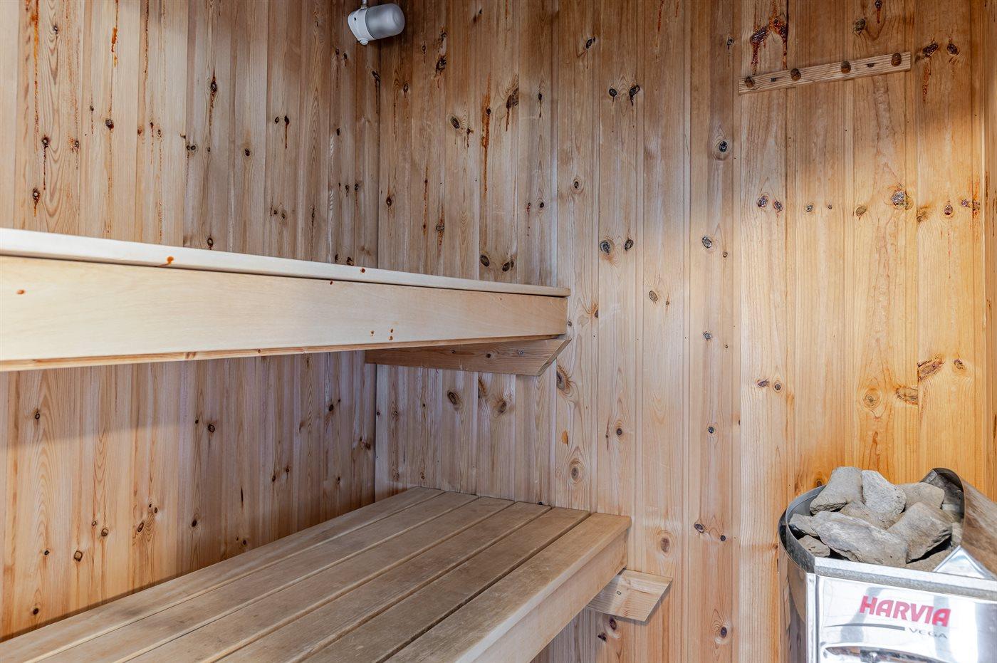 Der er 1 badeværelse med bruseniche og 2 toiletter, heraf 1 gæstetoilet. Der er gulvvarme på 1 badeværelse. I saunaen er der mulighed for afslapning.