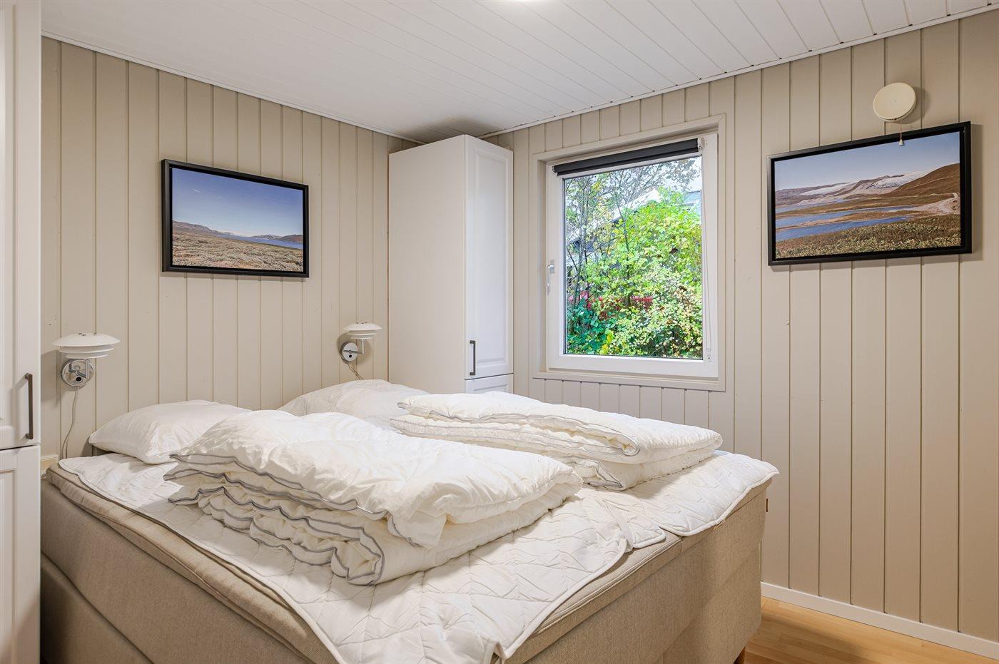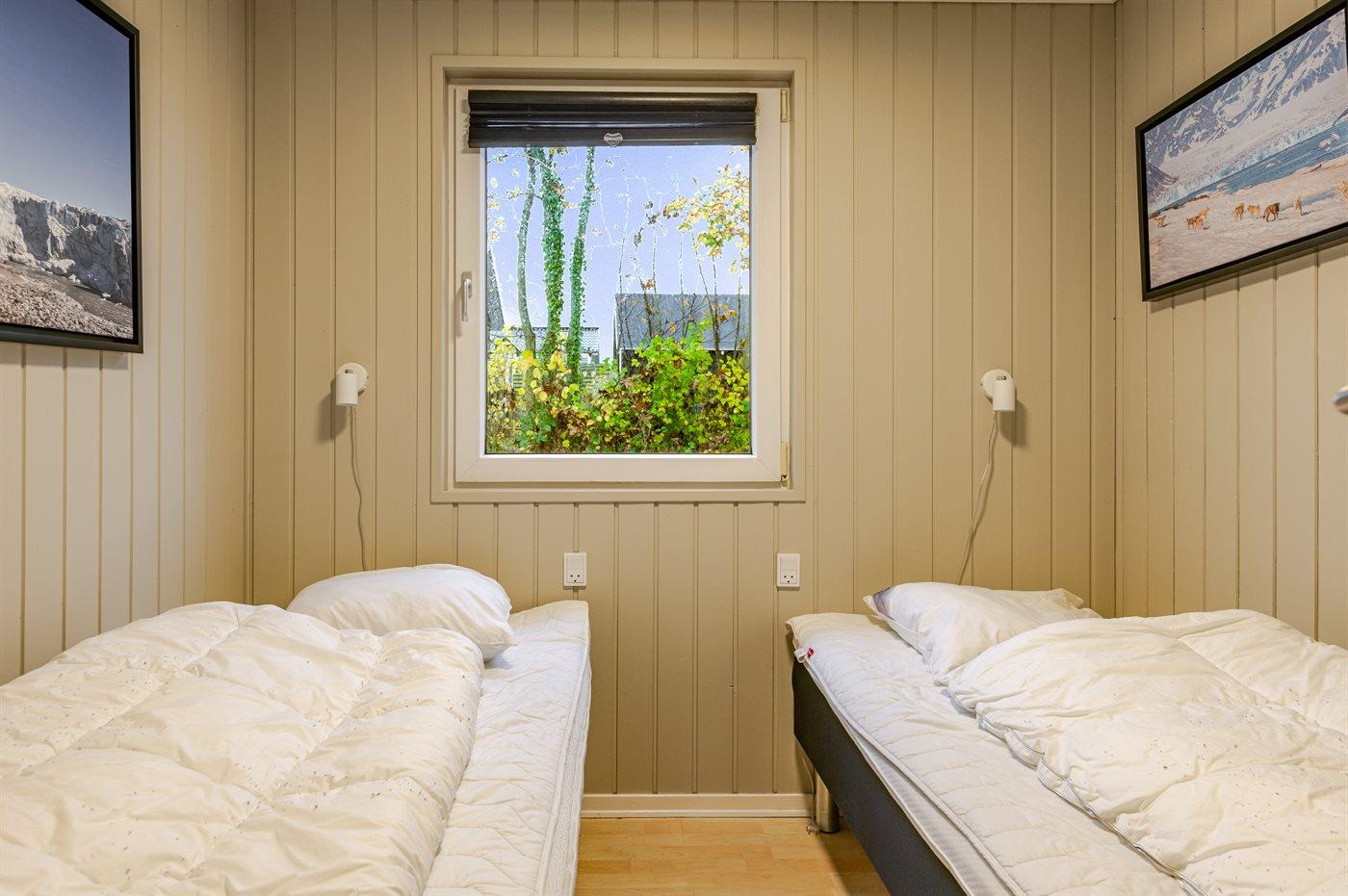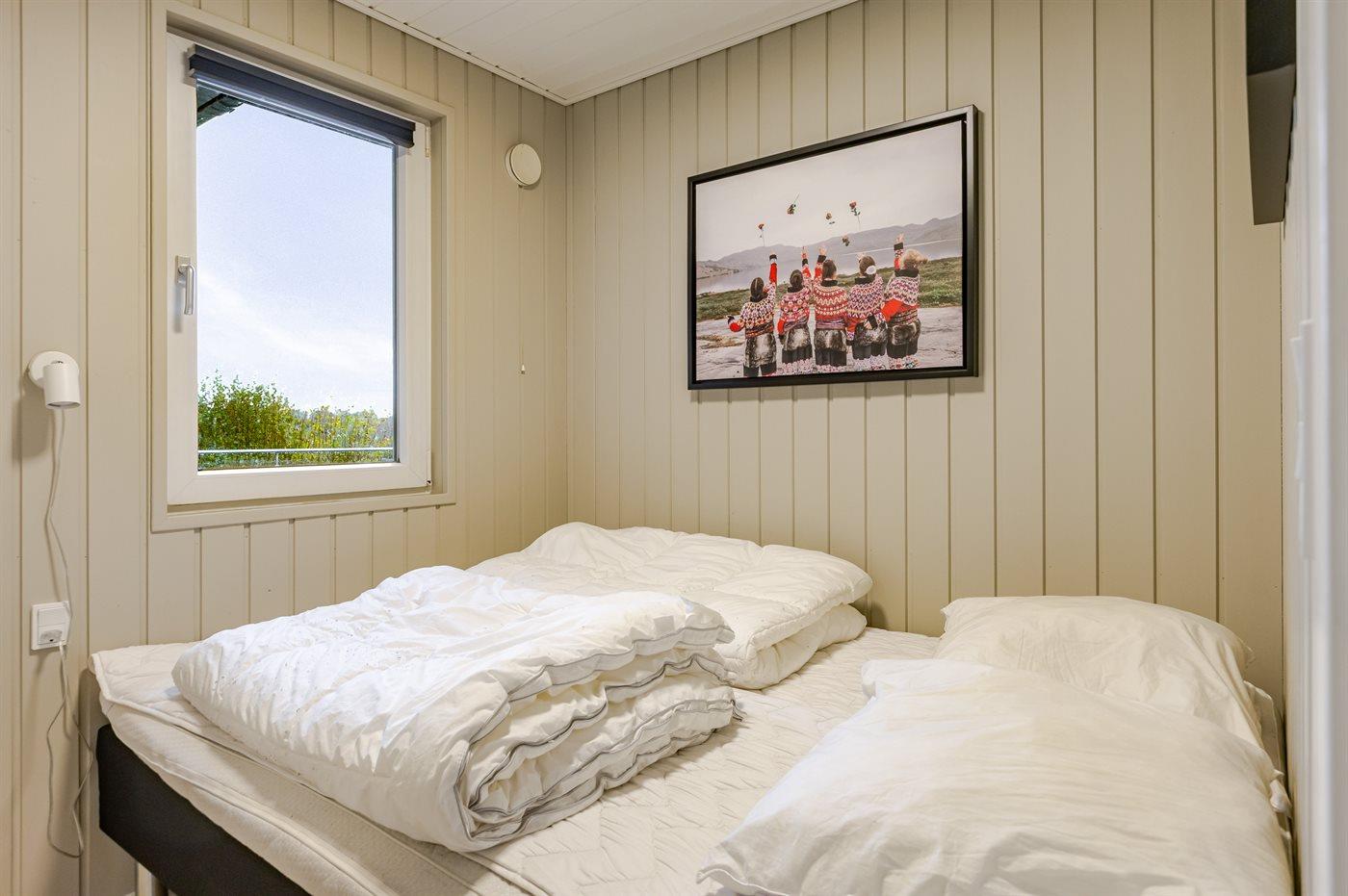 Der er i alt 3 soveværelser. Sovepladserne fordeler sig på: 4 sovepladser i dobbeltsenge. 2 sovepladser i enkeltsenge. Derudover er der 1 stk. barneseng.