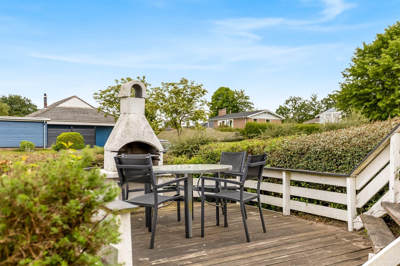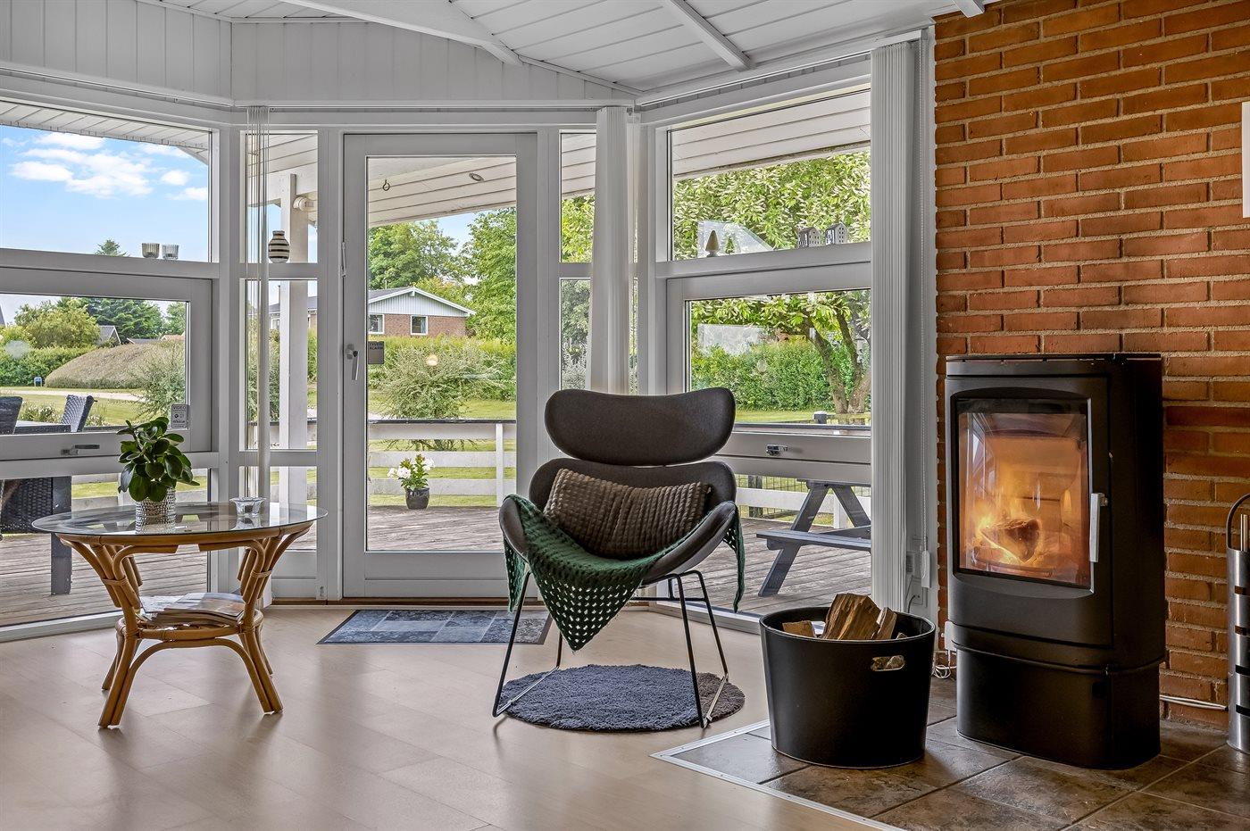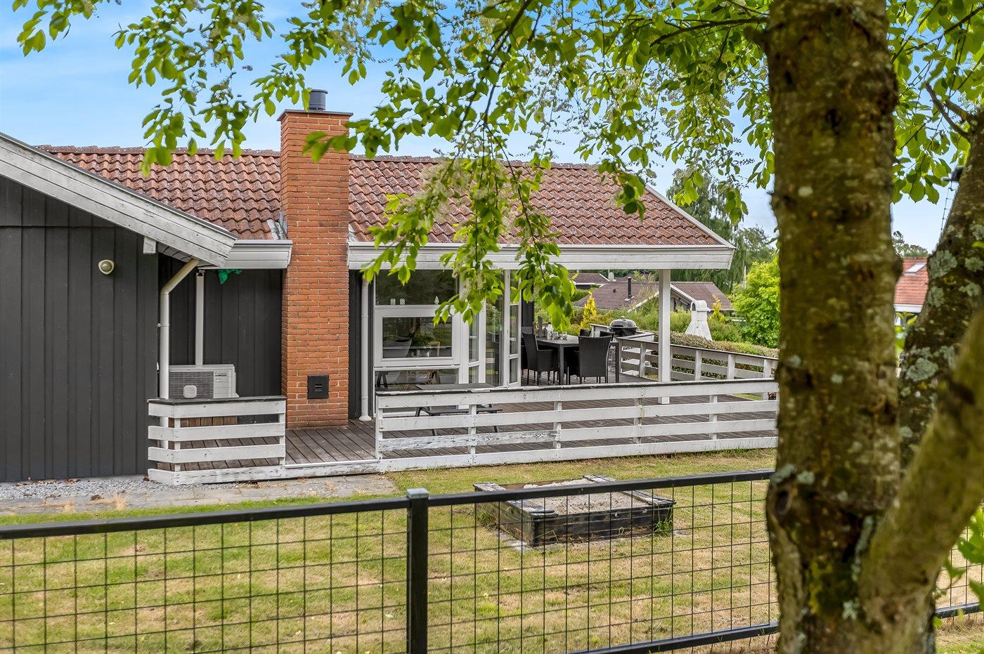 Udelivet er en oplevelse i sig selv med en dejlig overdækket terrasse og skulle du have behov for lidt ekstra varme på en sommeraften så er der mulighed for at tænde for terrassevarmeren. Desuden findes der et stort, indhegnet terrasseområde, som er vendt mod sydvest. Her kan du nyde solen dagen lang og se den gå ned om aftenen. Ønsker du lidt ekstra hygge om aftenen så kan du tænde op i den udendørs pejs, som også er at finde på terrassen. Græsplænen giver rigelig plads til boldspil og leg – som f.eks. en uformel fodboldkamp, da der også findes fodboldmål. En del af græsplænen er indhegnet – her finder du gynge og sandkasse, på denne måde kan du roligt lade børnene lege udenfor.