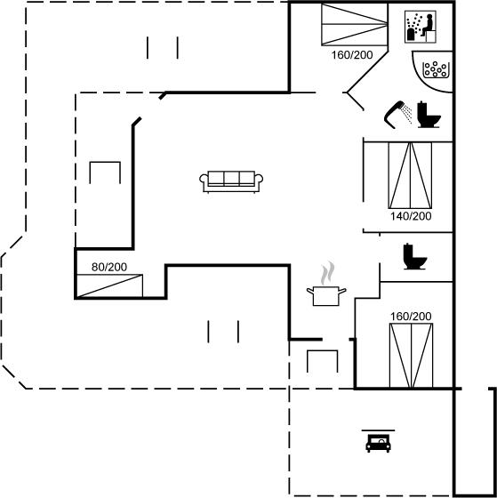 Der er i alt 3 soveværelser. Sovepladserne fordeler sig på: 6 sovepladser i dobbeltsenge. 1 soveplads i alkove. 1 af disse sovepladser befinder sig i stuen. Derudover er der 2 stk. barnesenge.
