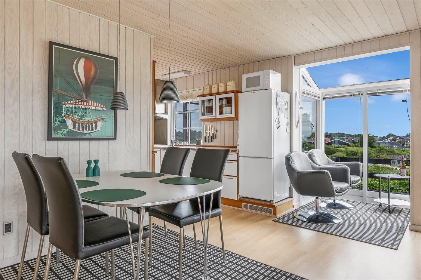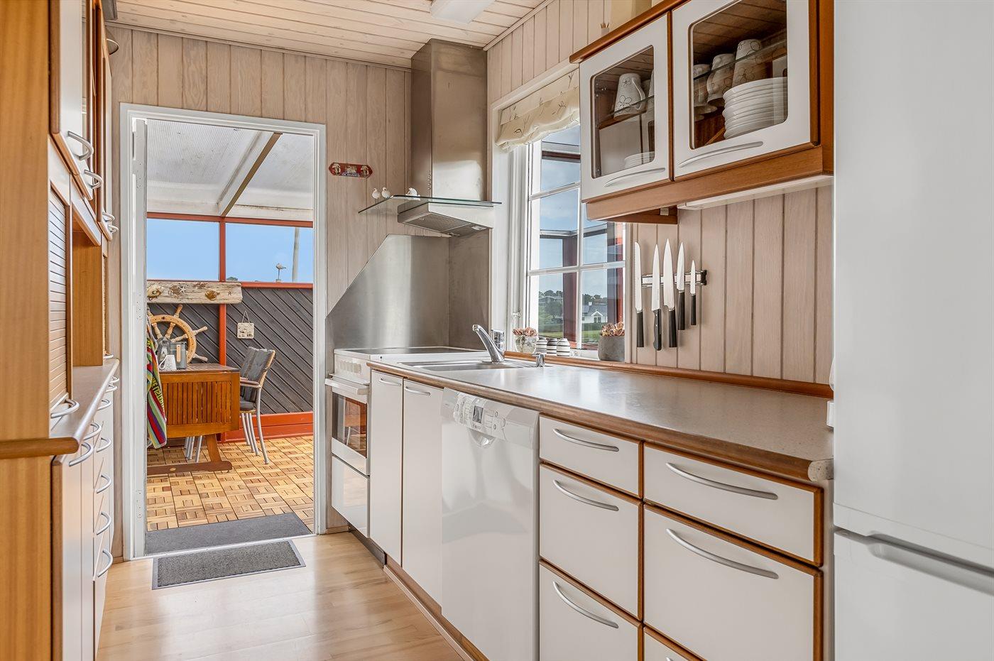 Køkkenet er udstyret med 1 køleskab. Der er 4 elkogeplader, miniovn, varmluftovn, mikrobølgeovn samt opvaskemaskine.