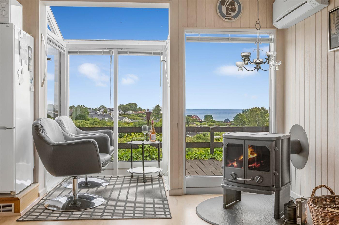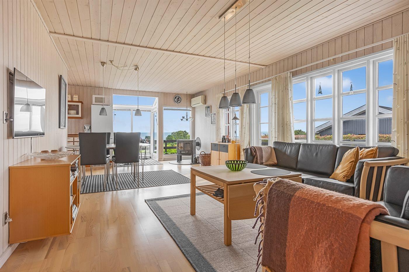 Med dette sommerhus i Hejlsminde får I en feriebolig med en af de absolut bedste udsigter til vandet, udsigten kan nydes både fra stuen og de dejlige terrasseområder ved huset. Den hyggelige stue indbyder til afslapning, og herfra kan I følge havets skiftende stemninger og alt livet på vandet, dette kan I f.eks. også gøre fra spisebordet i stuen.