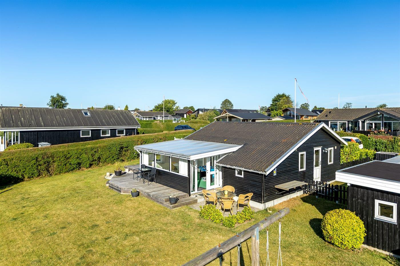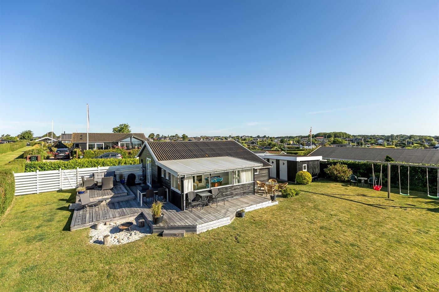Hyggeligt sommerhus i Hejlsminde med havudsigt, udestue og børnevenlig have tæt på stranden.