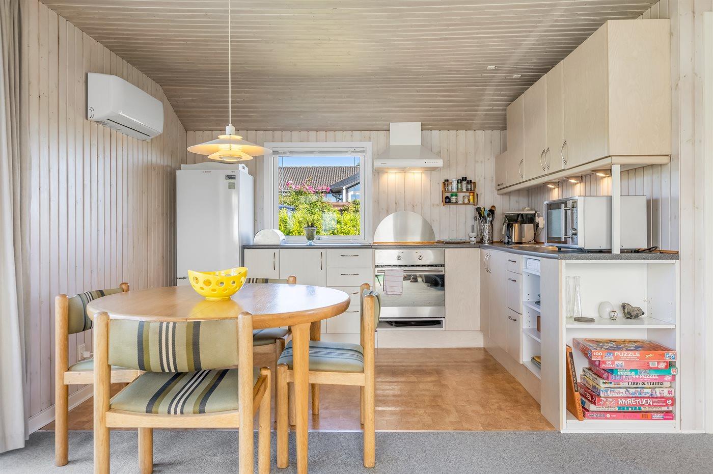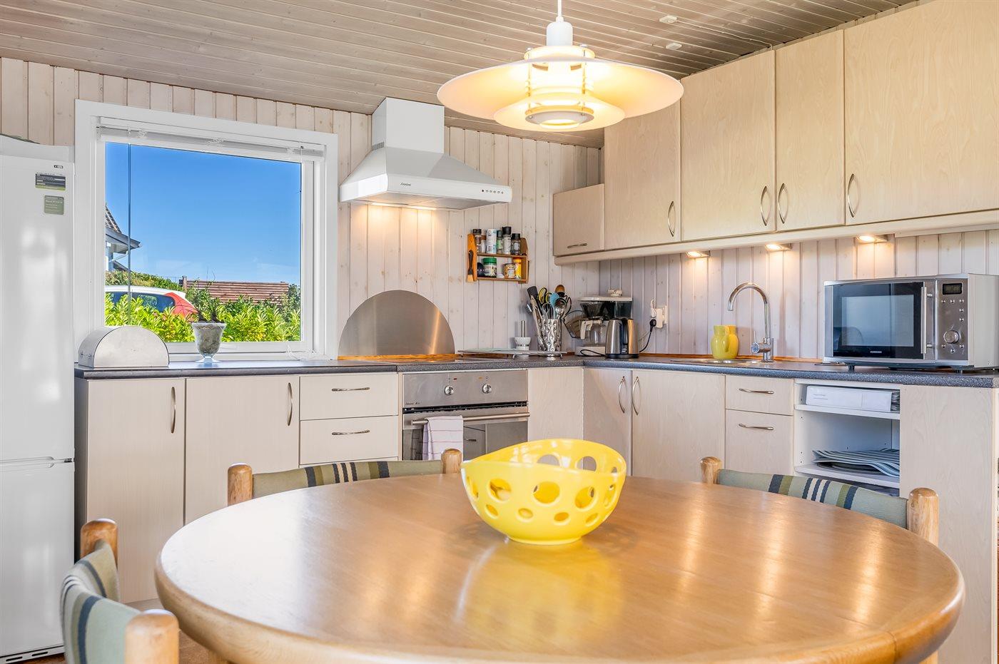 Køkkenet er udstyret med 1 køleskab. Der er 4 keramiske kogeplader, varmluftovn, mikrobølgeovn.