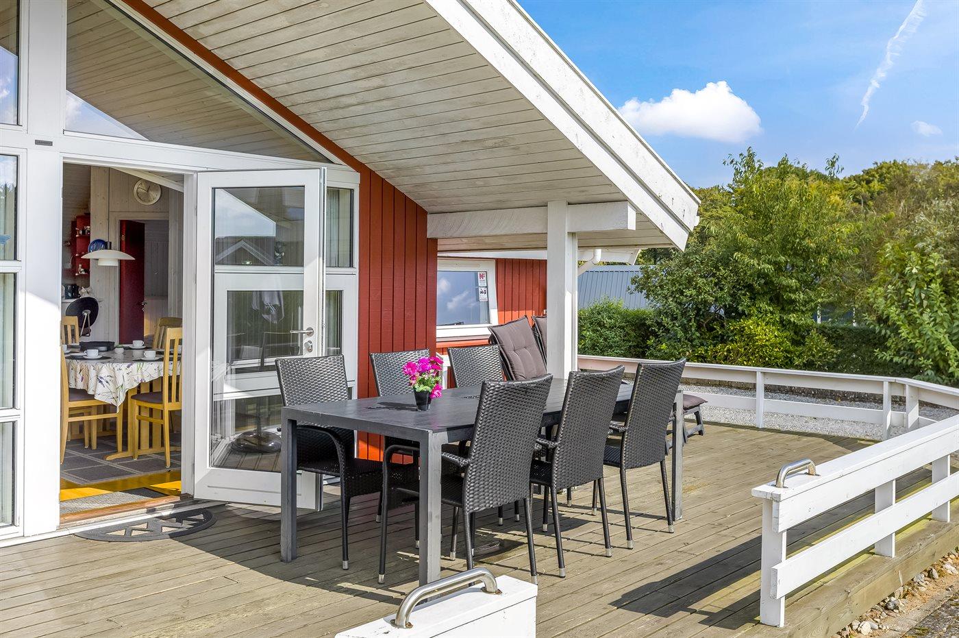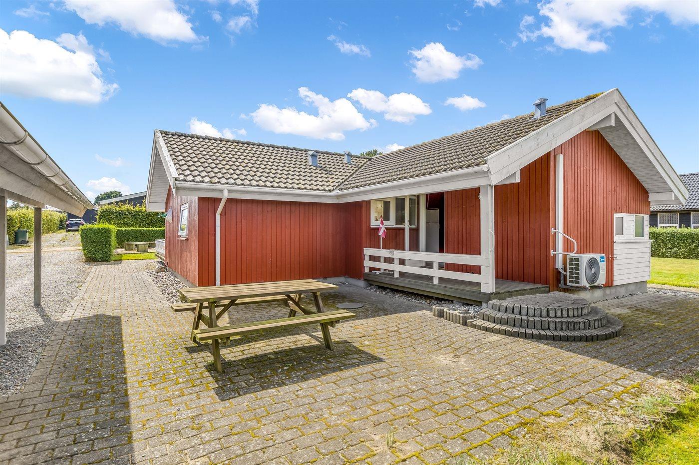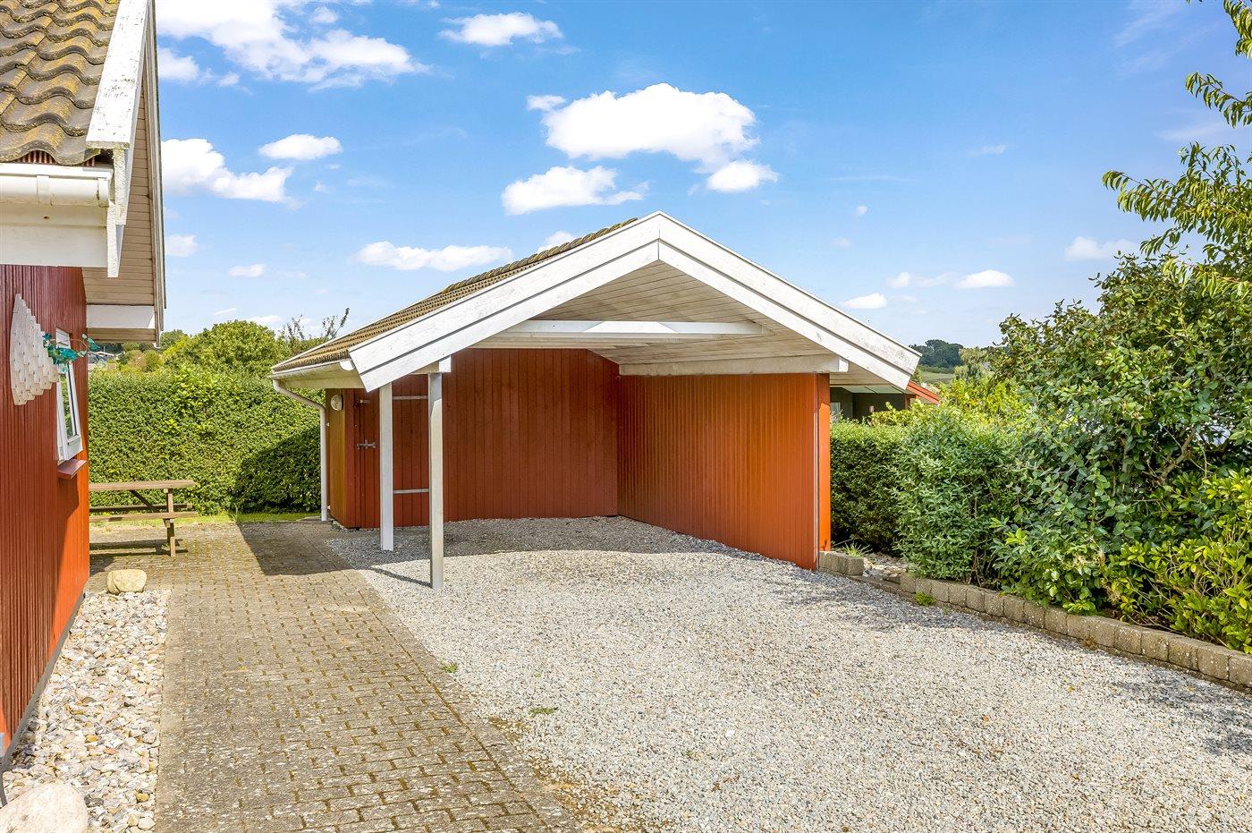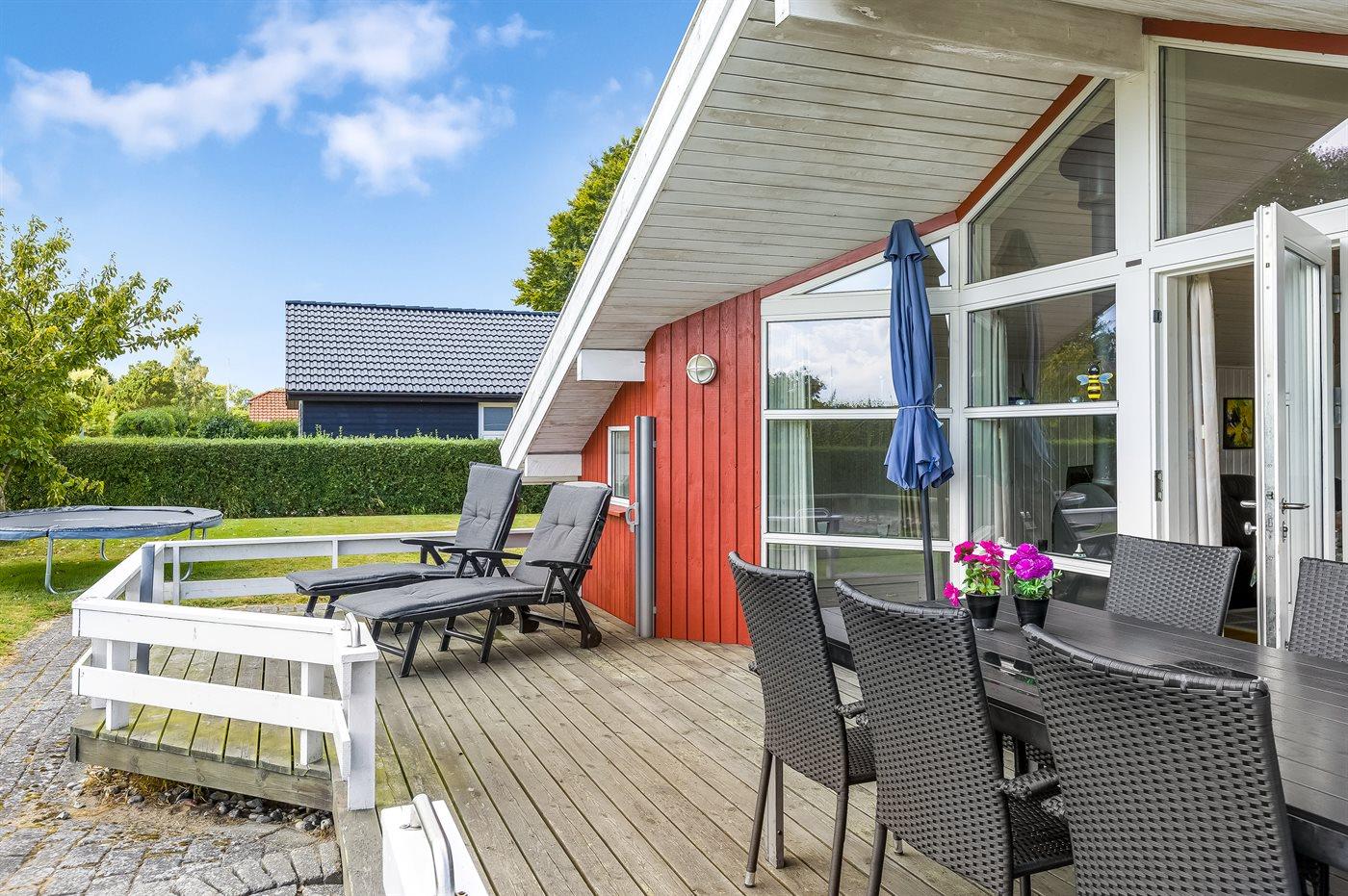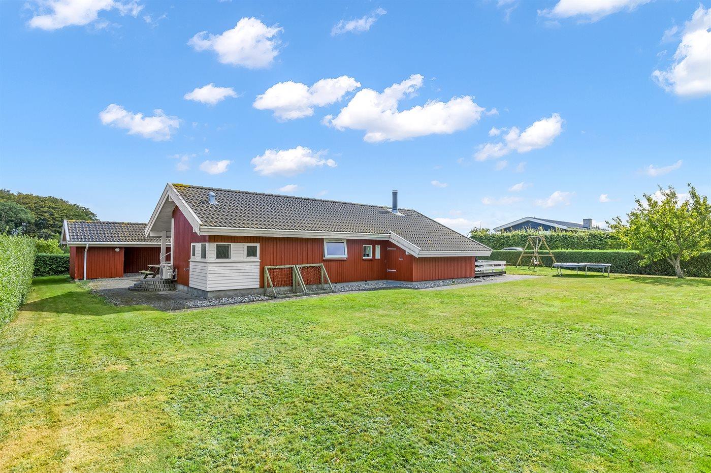 Ferieboligen er beliggende på en 832 m² stor havegrund. Der er 350 m til havet. Der er en badebro i nærheden. Nærmeste forretning er beliggende i en afstand af 3000 m. Til ferieboligen hører åbent terrasseareal. Desuden er der overdækket terrasse. Gynge. Sandkasse. Trampolin. Fodboldmål. Der ligger en legeplads i en afstand af 200 m. Grill til rådighed. Der er carport til rådighed. Parkering ved ferieboligen.