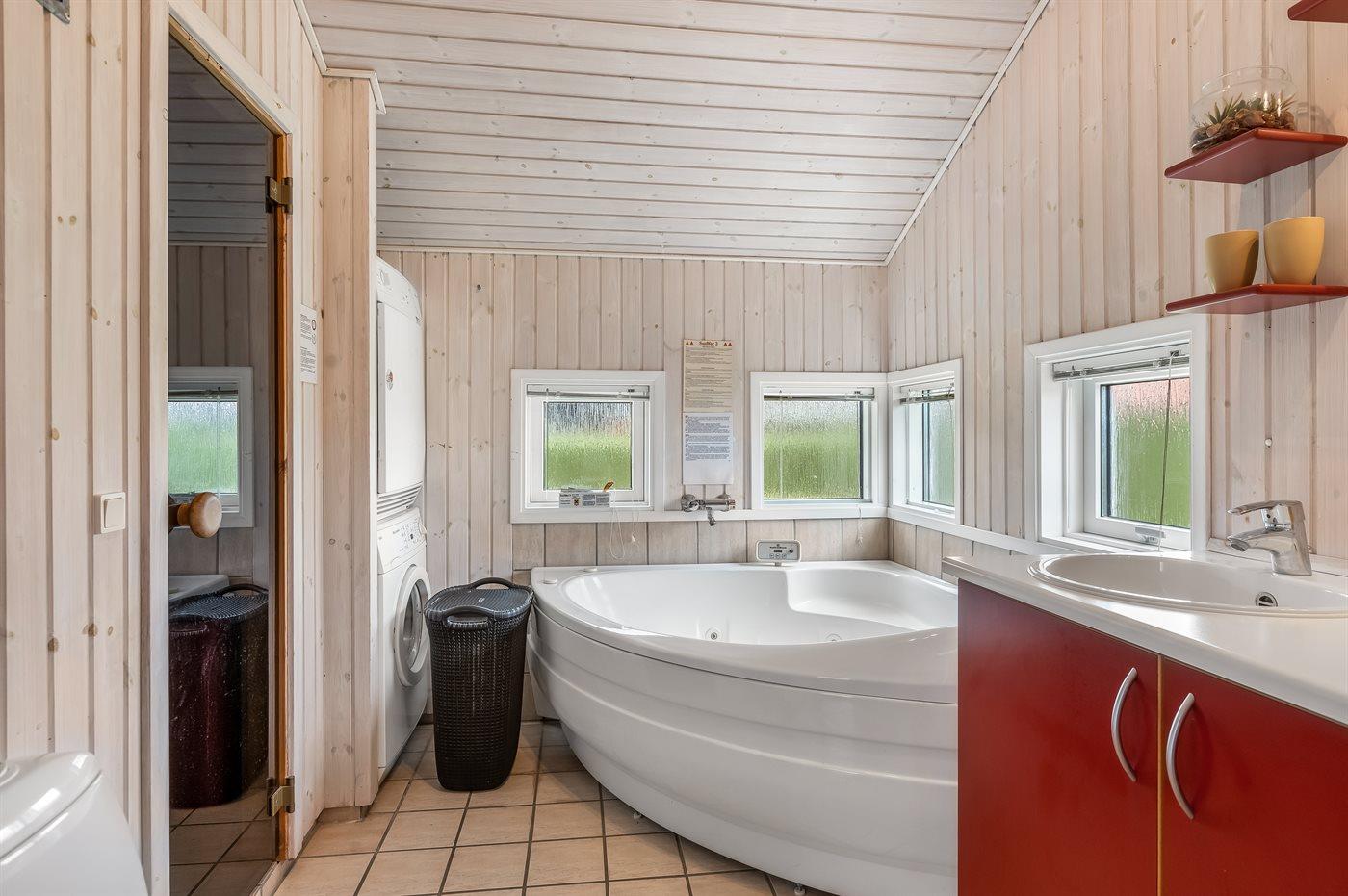 Der er 1 badeværelse med bruser og 1 toilet.. Der er gulvvarme på 1 badeværelse. I saunaen er der mulighed for afslapning.