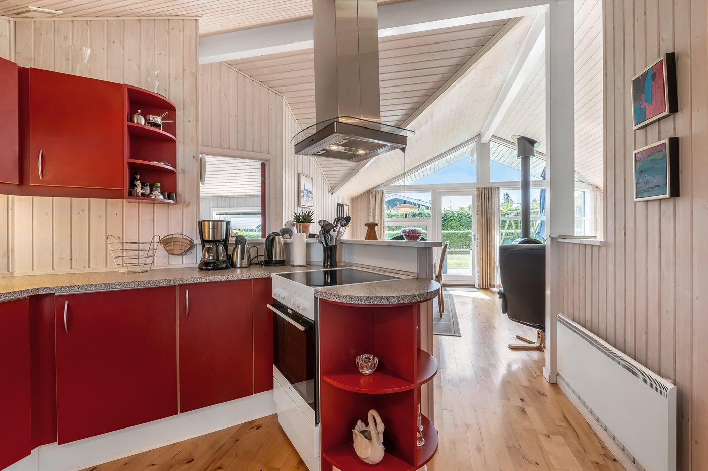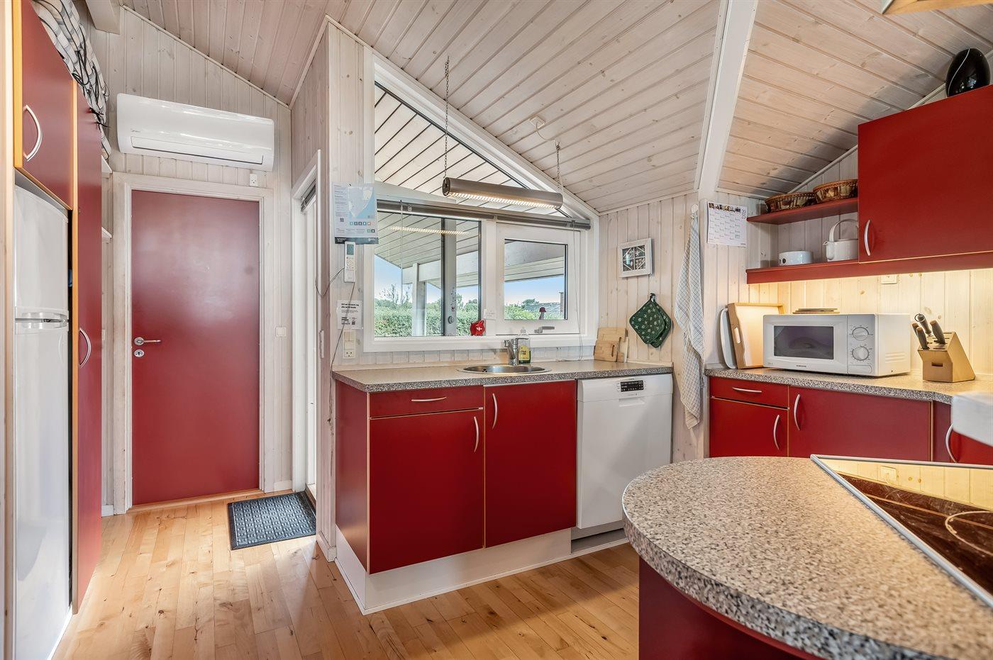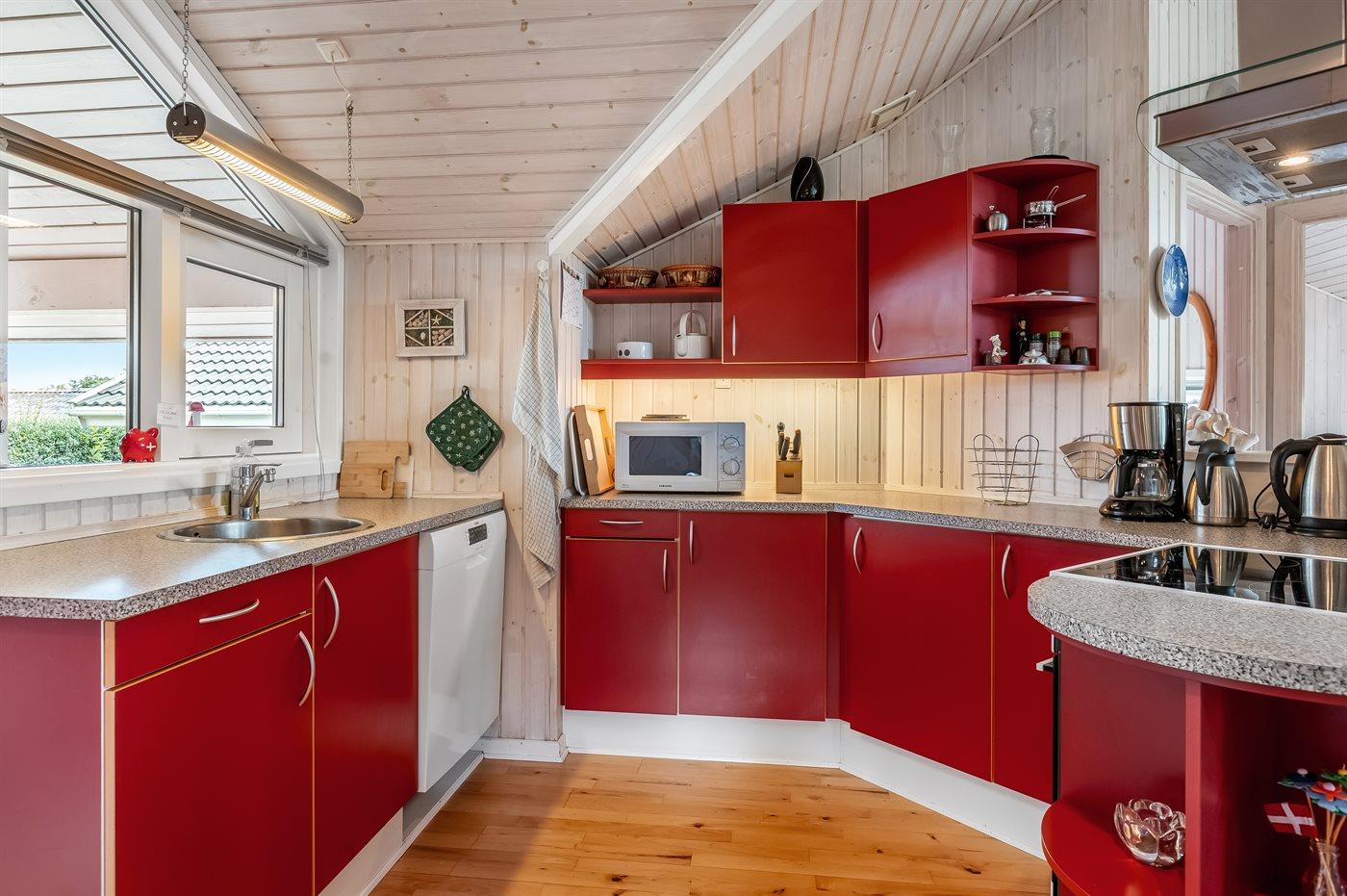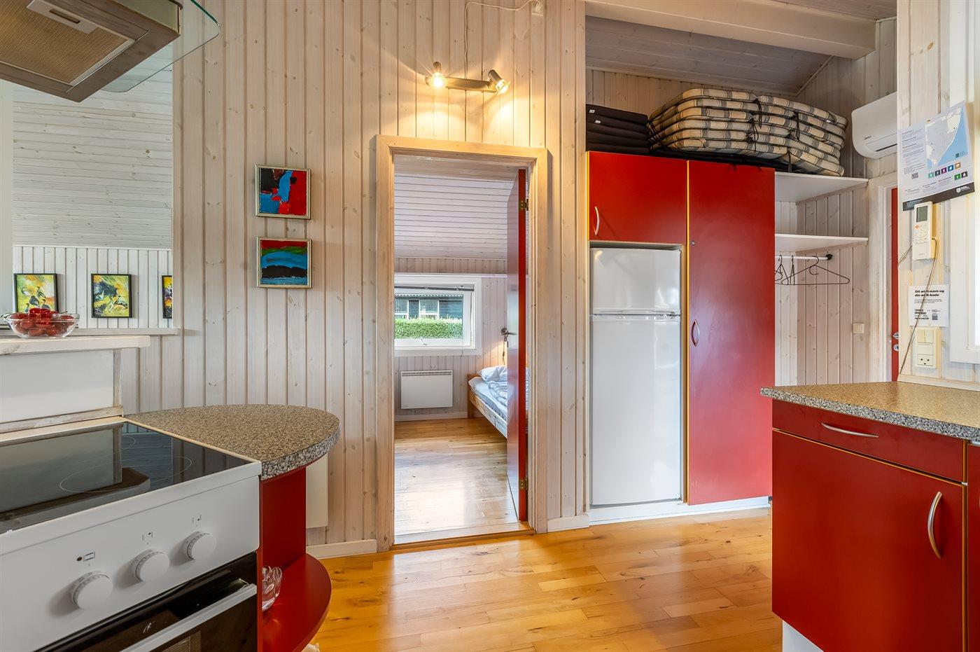 Køkkenet er udstyret med 1 køleskab. Der er 4 keramiske kogeplader, varmluftovn, mikrobølgeovn samt opvaskemaskine.