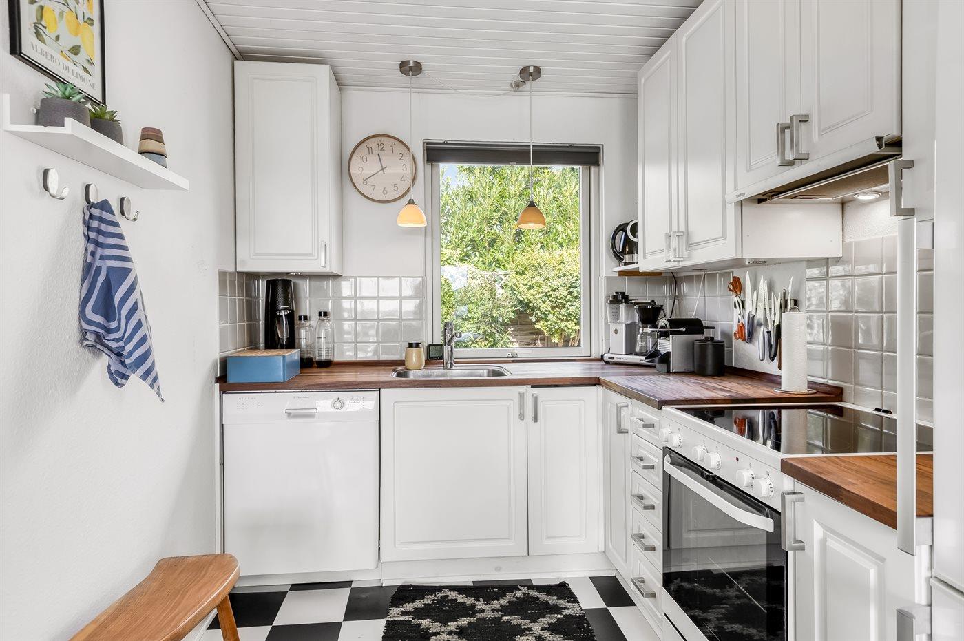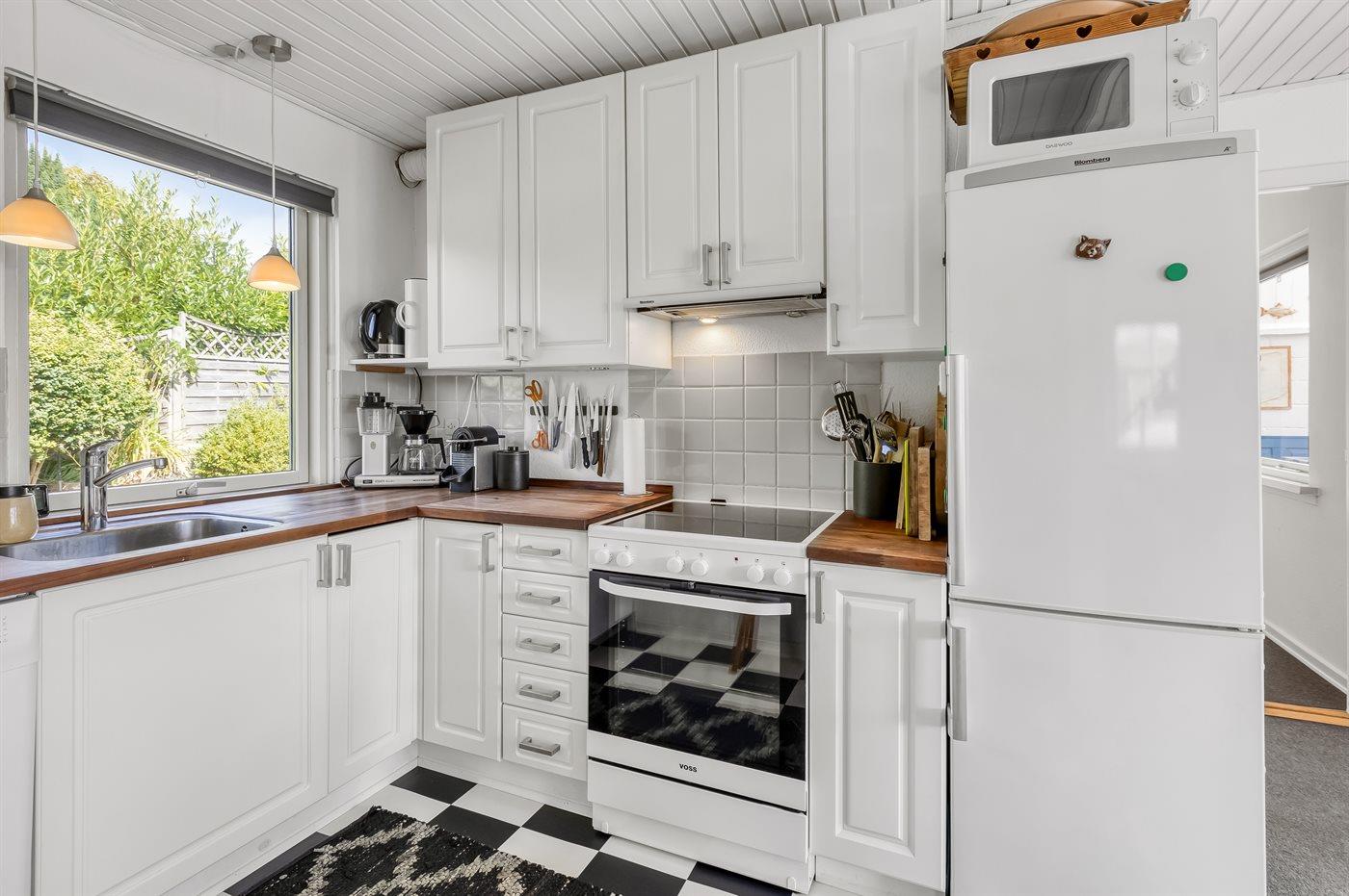 Køkkenet er udstyret med 1 køleskab. Der er 4 keramiske kogeplader, varmluftovn, mikrobølgeovn samt opvaskemaskine.