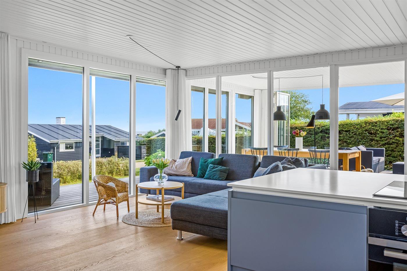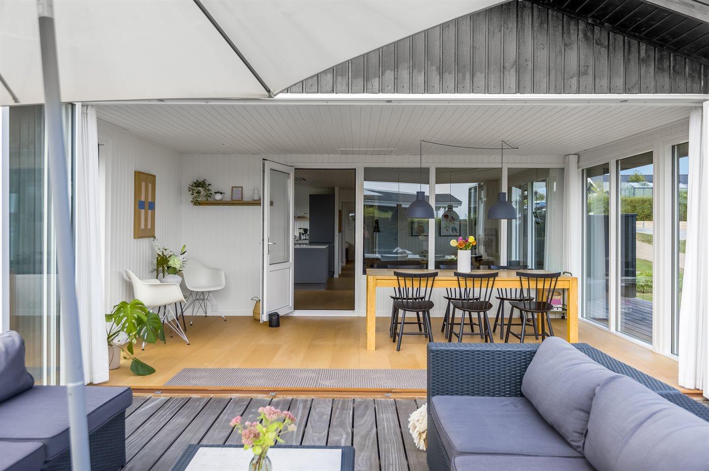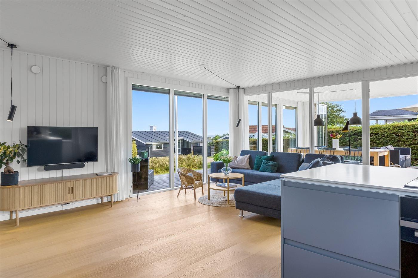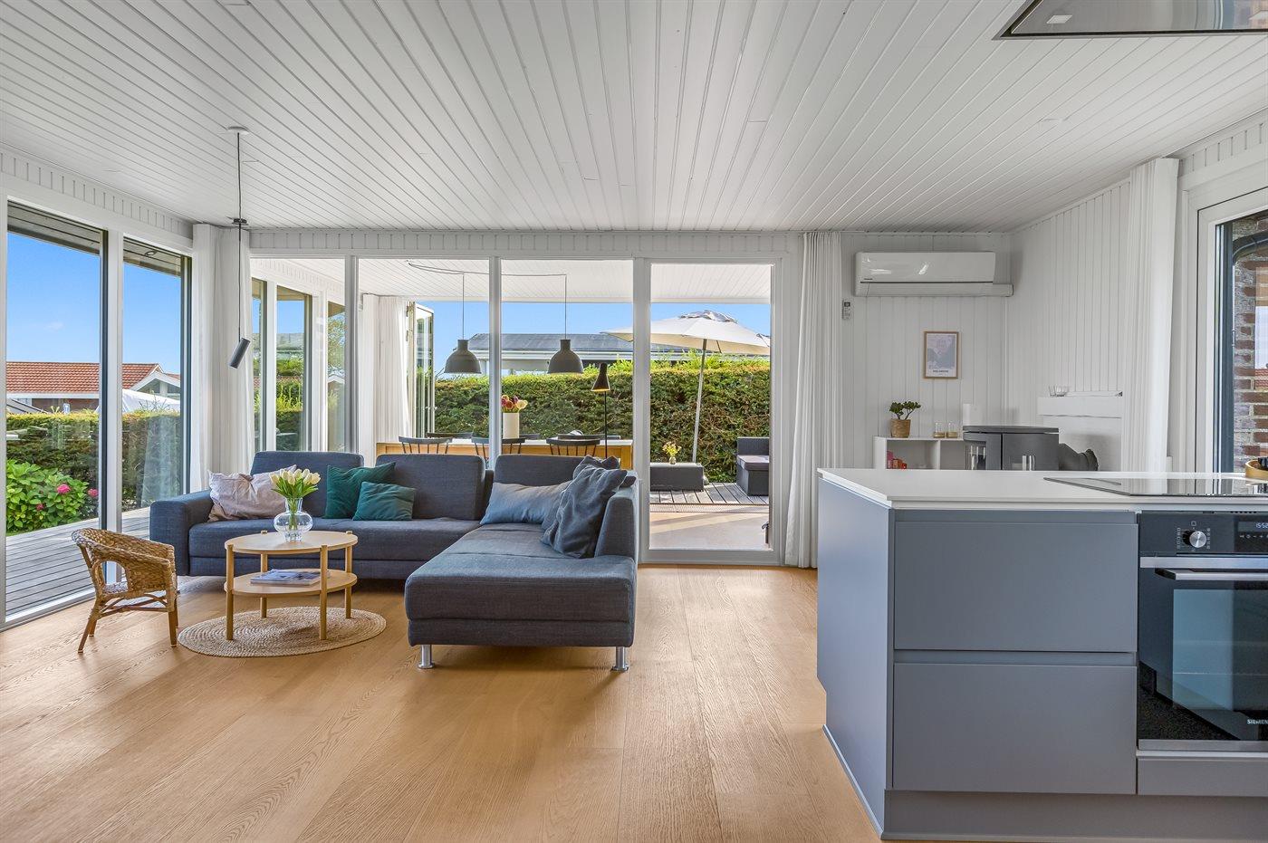 Indendørs finder I moderne bekvemmeligheder som Chromecast, der gør det let at streame jeres yndlingsindhold, mens I også har adgang til både danske og tyske tv-kanaler. Udenfor er der flere terrasser, så I kan vælge præcis det sted, hvor solen eller skyggen passer jer bedst. Lige foran udestuen står et indbydende loungesæt, hvor I kan nyde en kop kaffe eller et glas vin med udsigt til vandet.