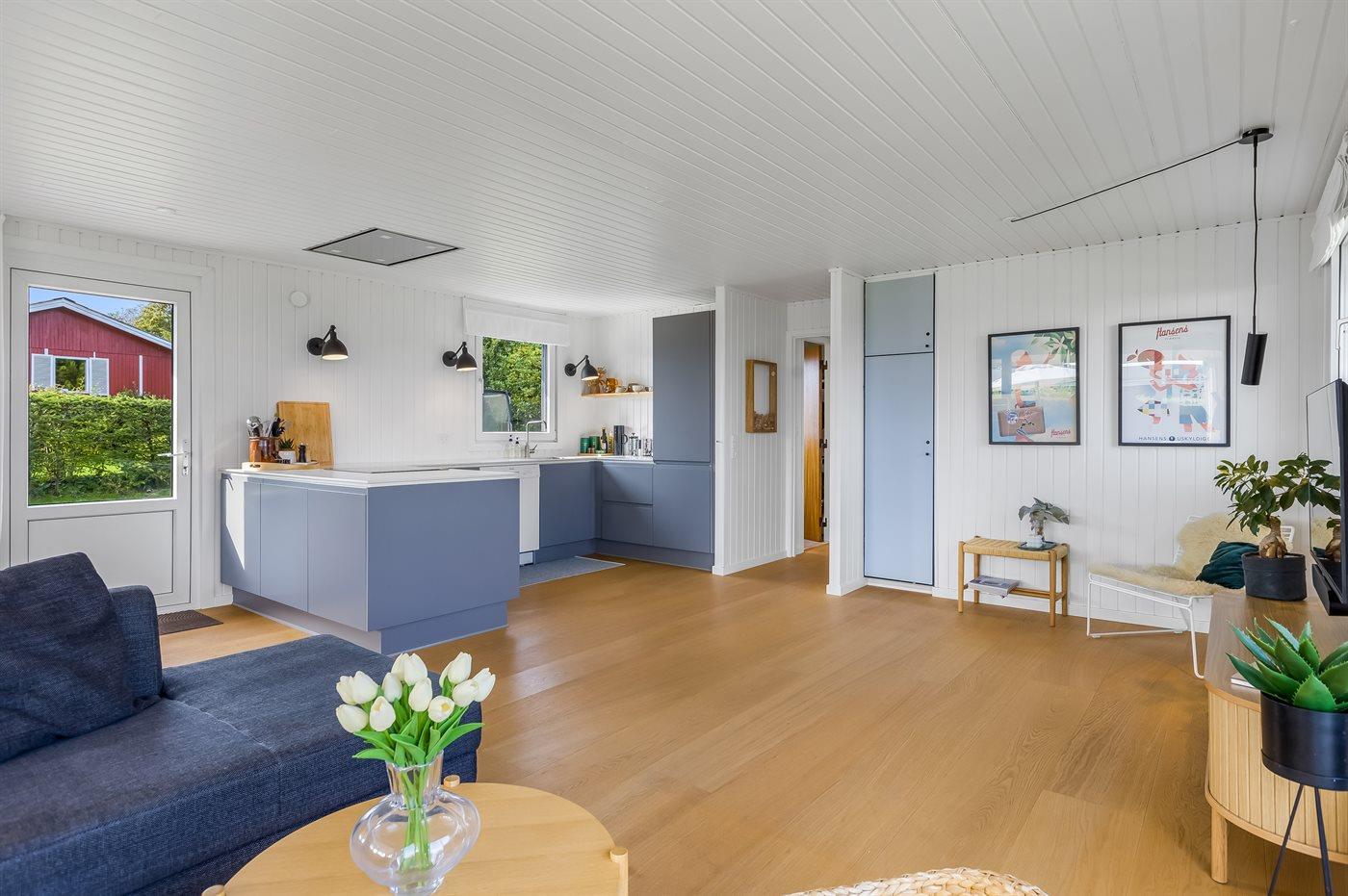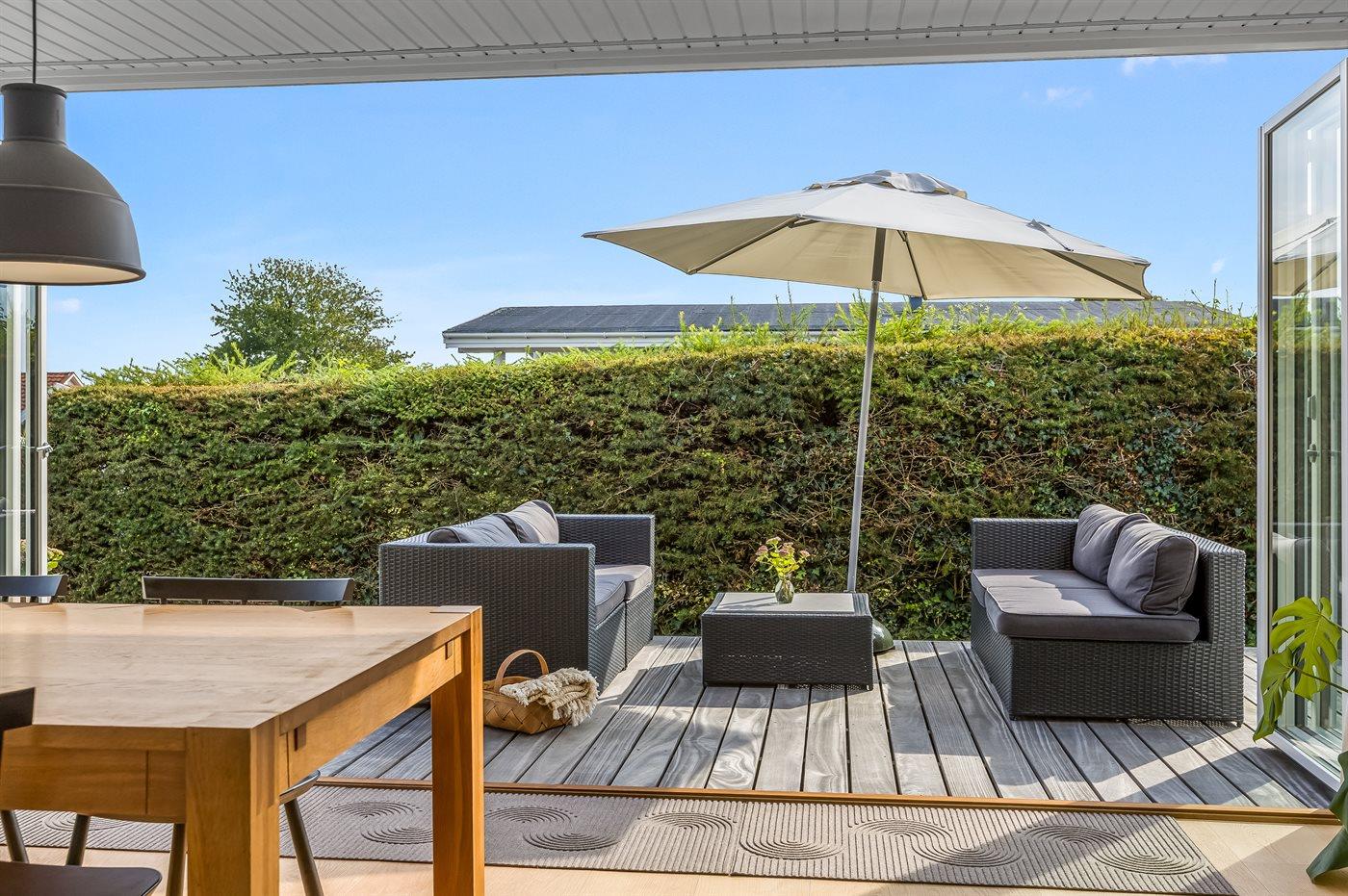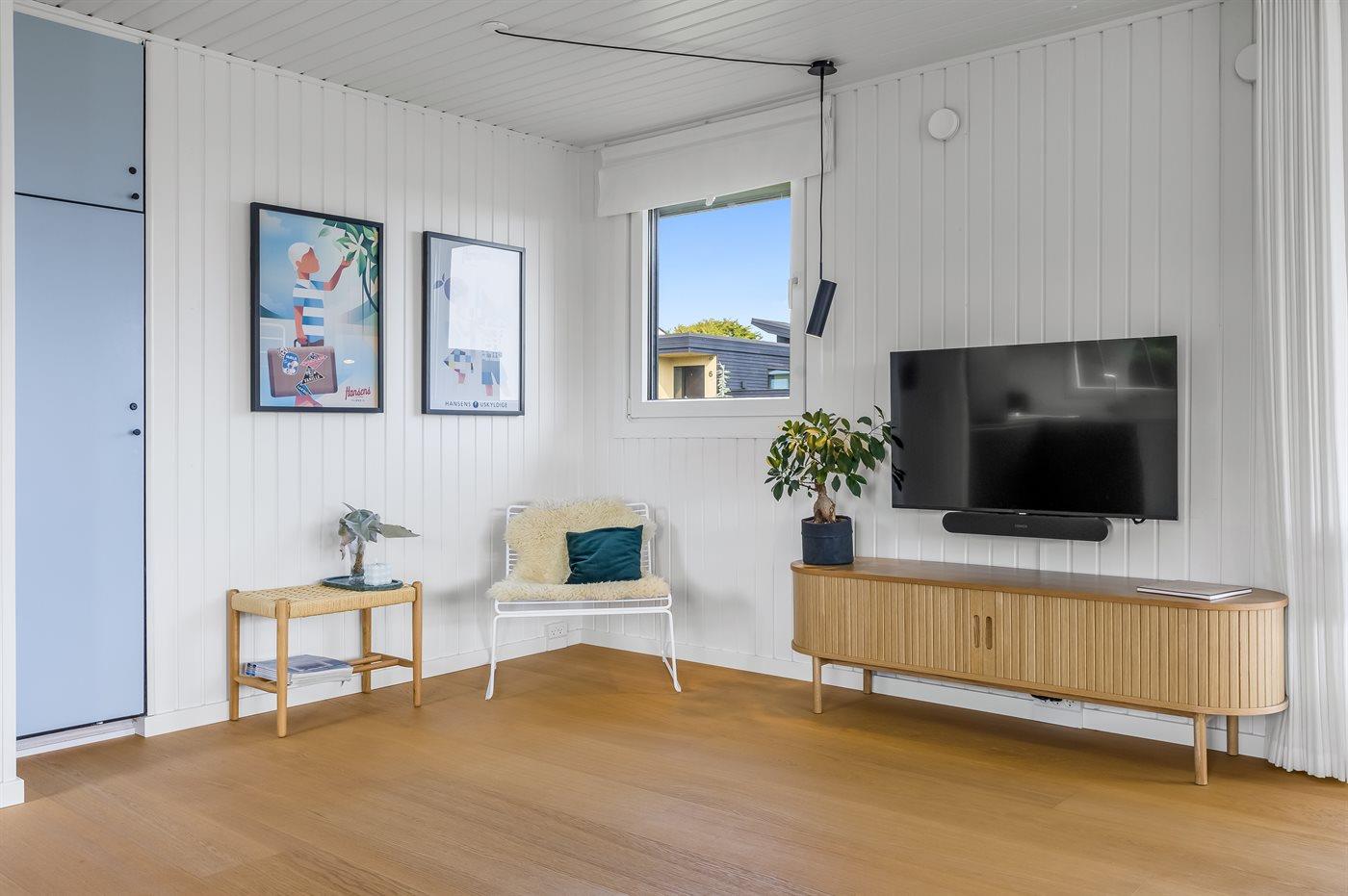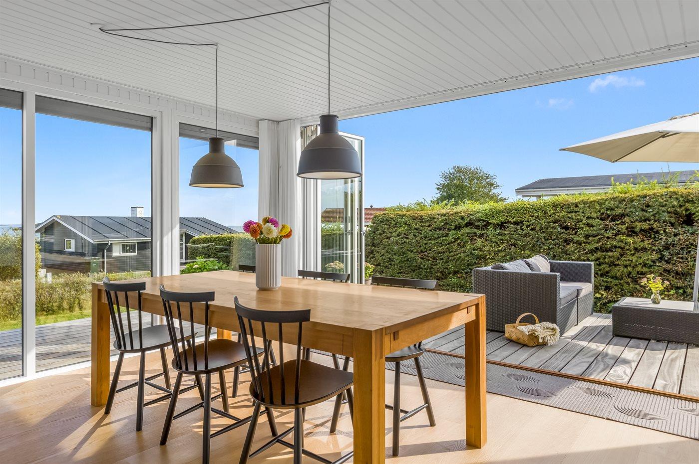 Indendørs finder I moderne bekvemmeligheder som Chromecast, der gør det let at streame jeres yndlingsindhold, mens I også har adgang til både danske og tyske tv-kanaler. Udenfor er der flere terrasser, så I kan vælge præcis det sted, hvor solen eller skyggen passer jer bedst. Lige foran udestuen står et indbydende loungesæt, hvor I kan nyde en kop kaffe eller et glas vin med udsigt til vandet.