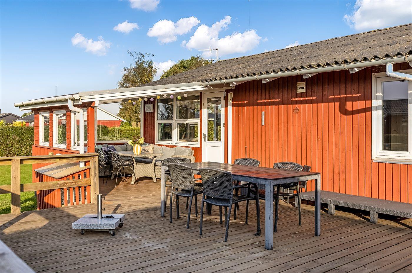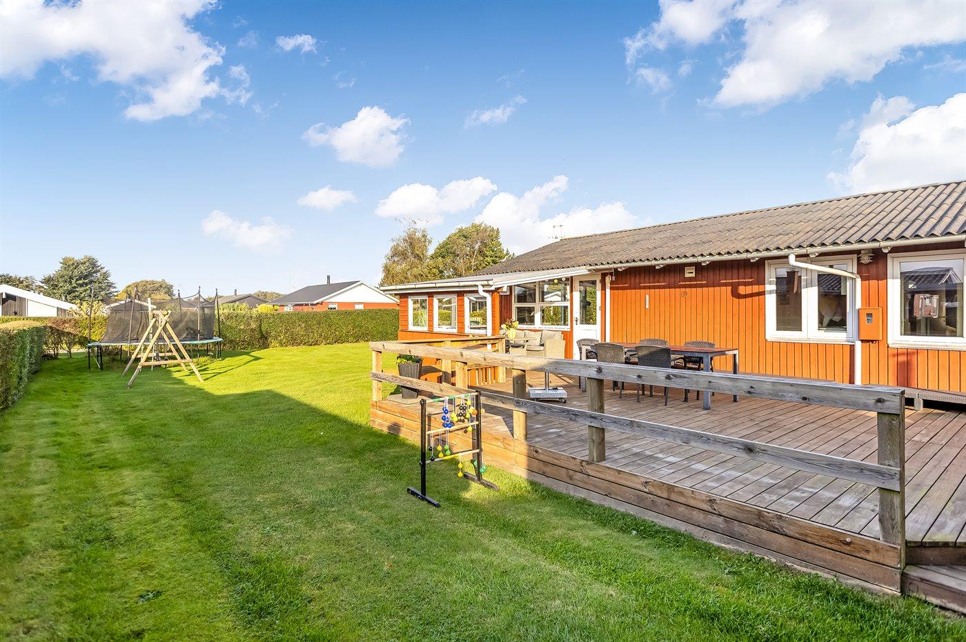 Ferieboligen er beliggende på en 682 m² stor havegrund. Der er 500 m til havet. Nærmeste forretning er beliggende i en afstand af 3400 m. Til ferieboligen hører åbent terrasseareal. Desuden er der overdækket terrasse. Gynge. Sandkasse. Trampolin. Grill til rådighed. Parkering ved ferieboligen.