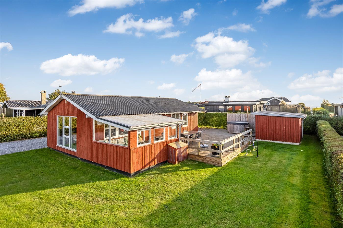 Hyggeligt sommerhus i Hejlsminde med vildmarkskar, trampolin og kort afstand til børnevenlig strand.