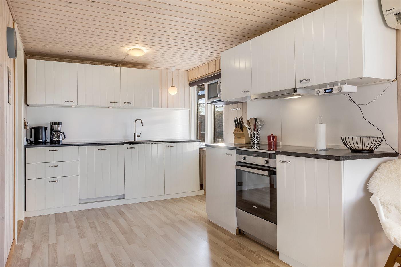 Køkkenet er udstyret med 1 køleskab. Der er 4 induktionskogeplader, varmluftovn, mikrobølgeovn samt opvaskemaskine.