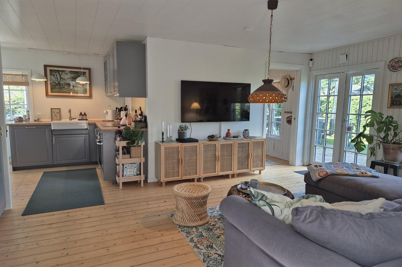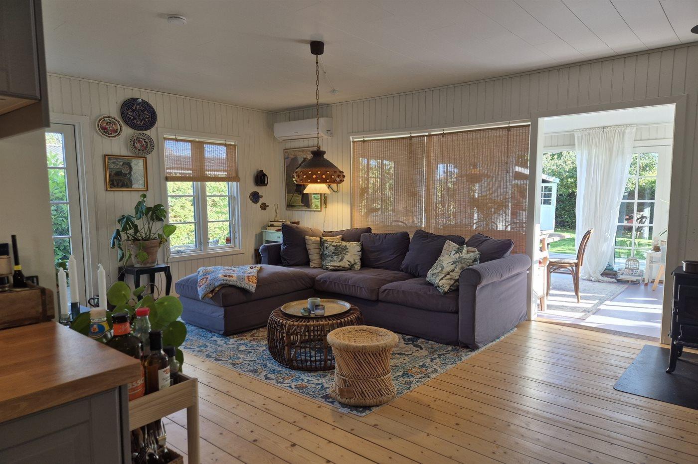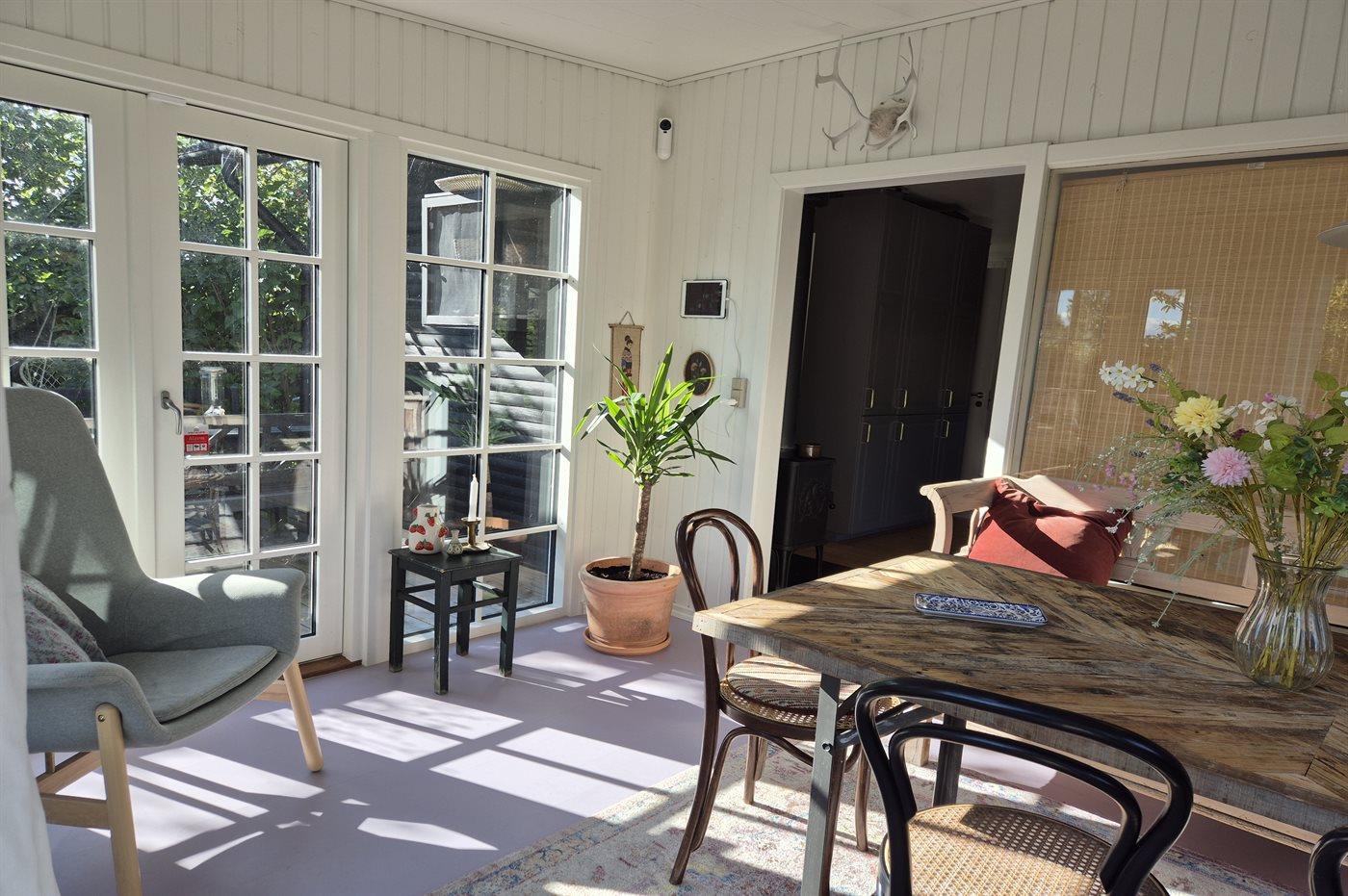 Udestuen har småsprossede vinduer, gardiner til gulvet og en stemningsfuld indretning, der indbyder til afslapning året rundt.