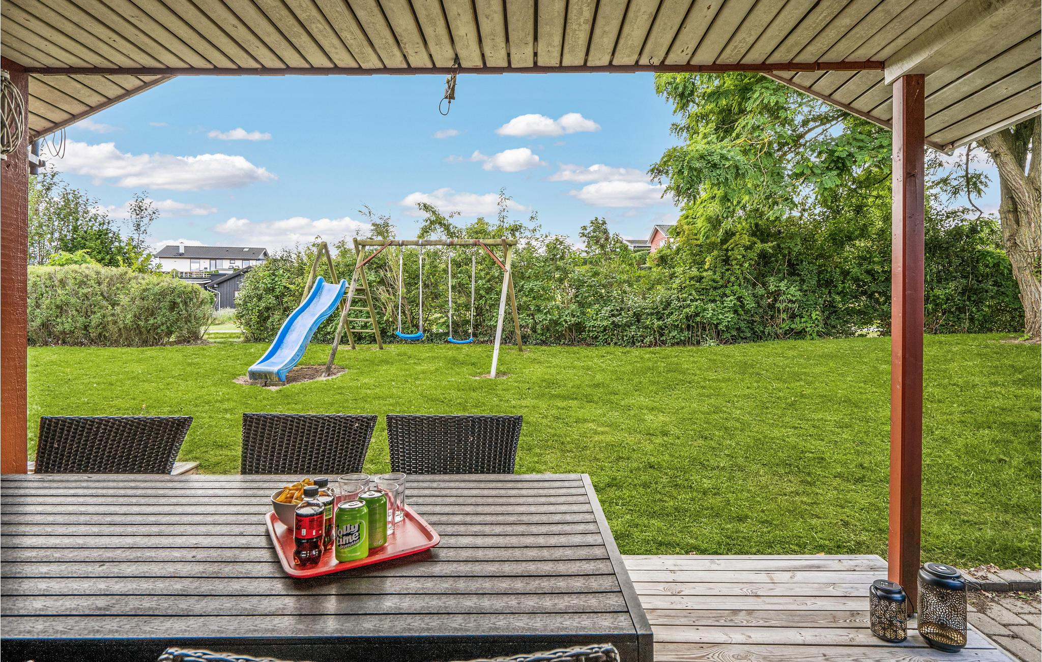 Fra stuen er der udgang til en overdækket terrasse, og lige ved siden af kan I nyde solen på den åbne terrasse, mens børnene leger i haven.