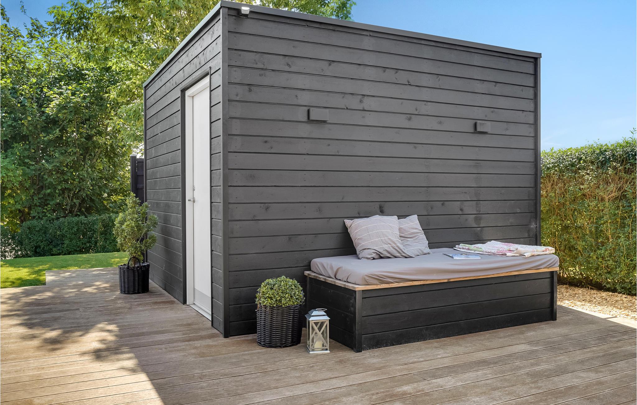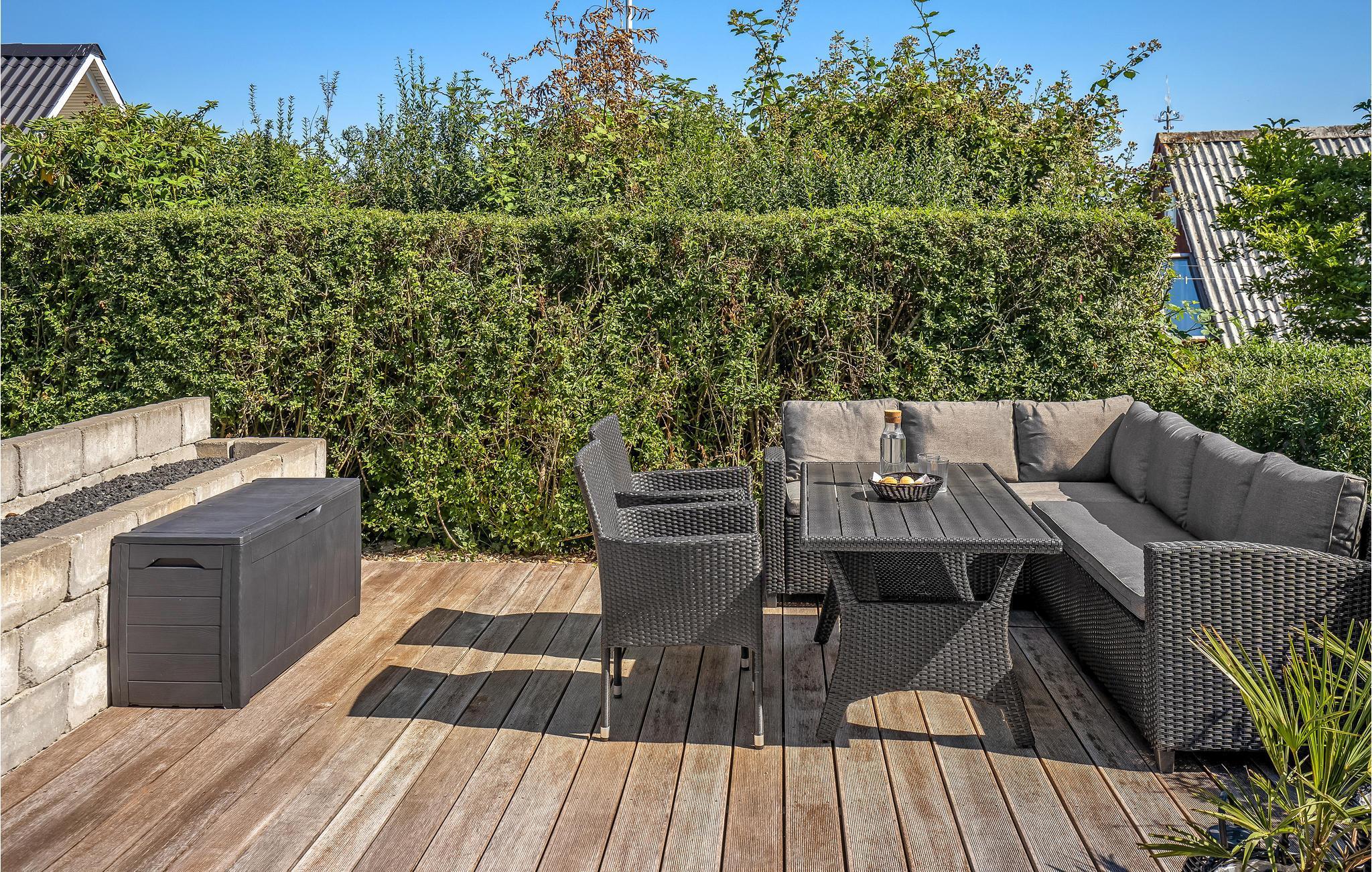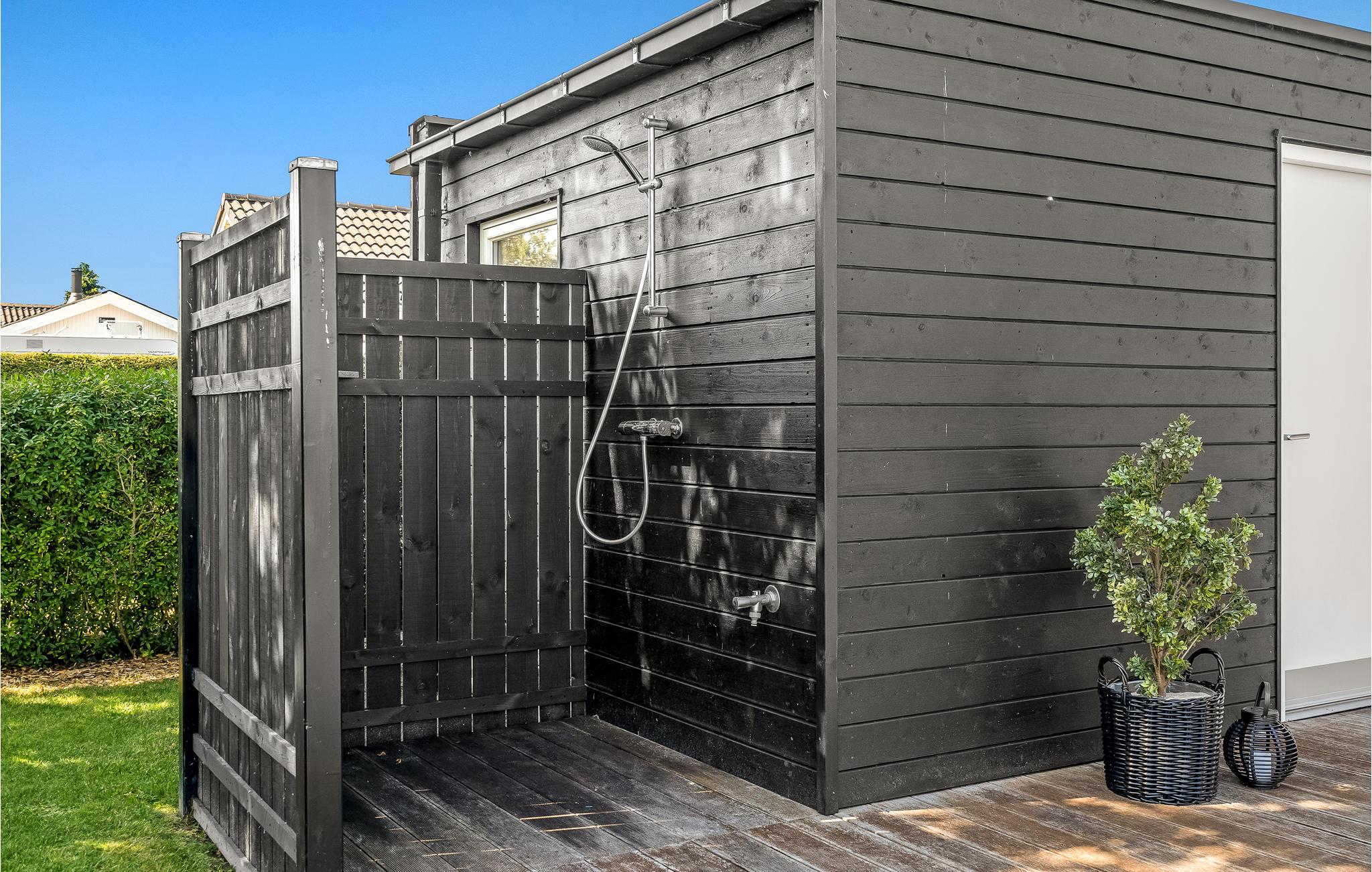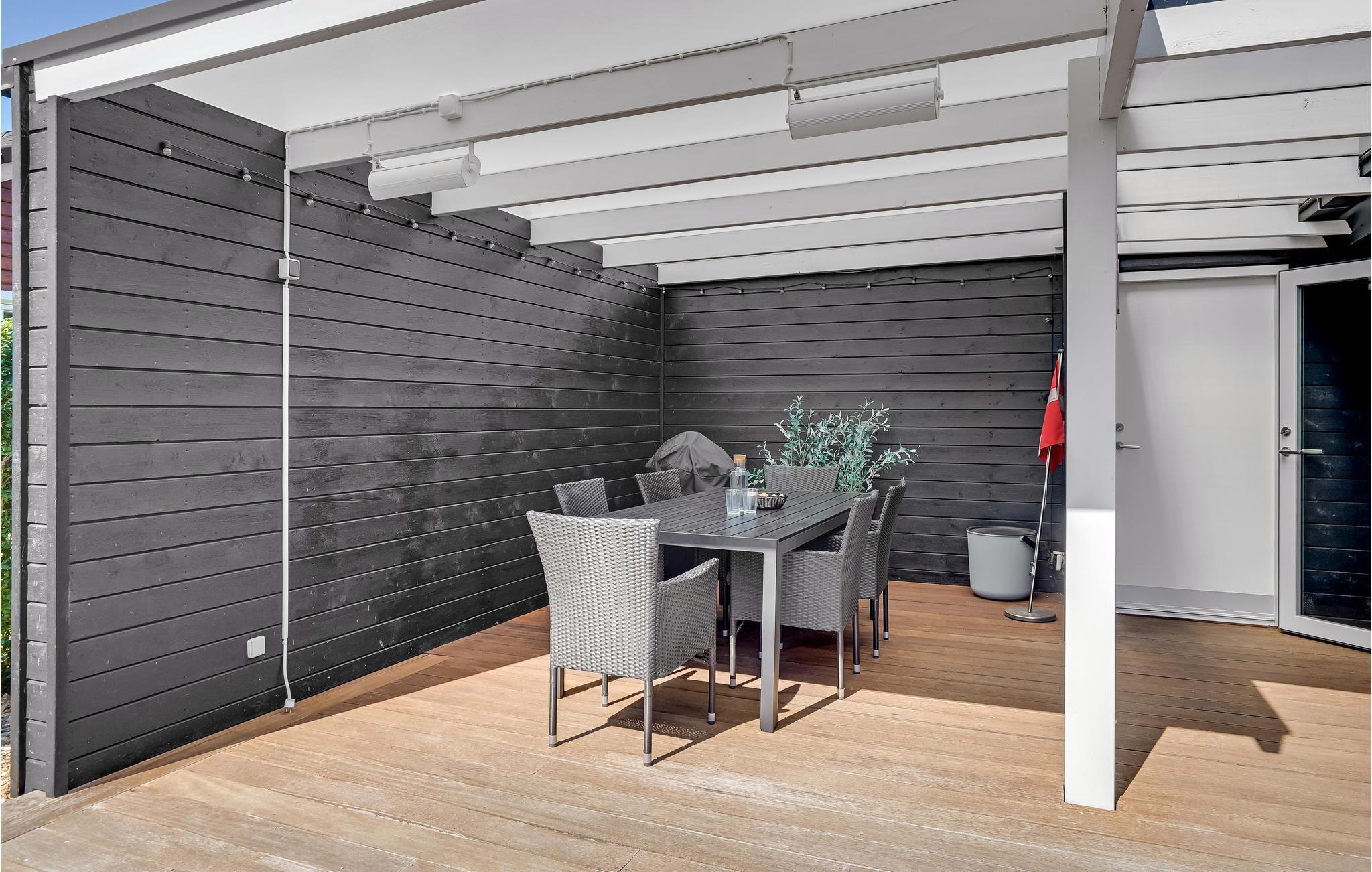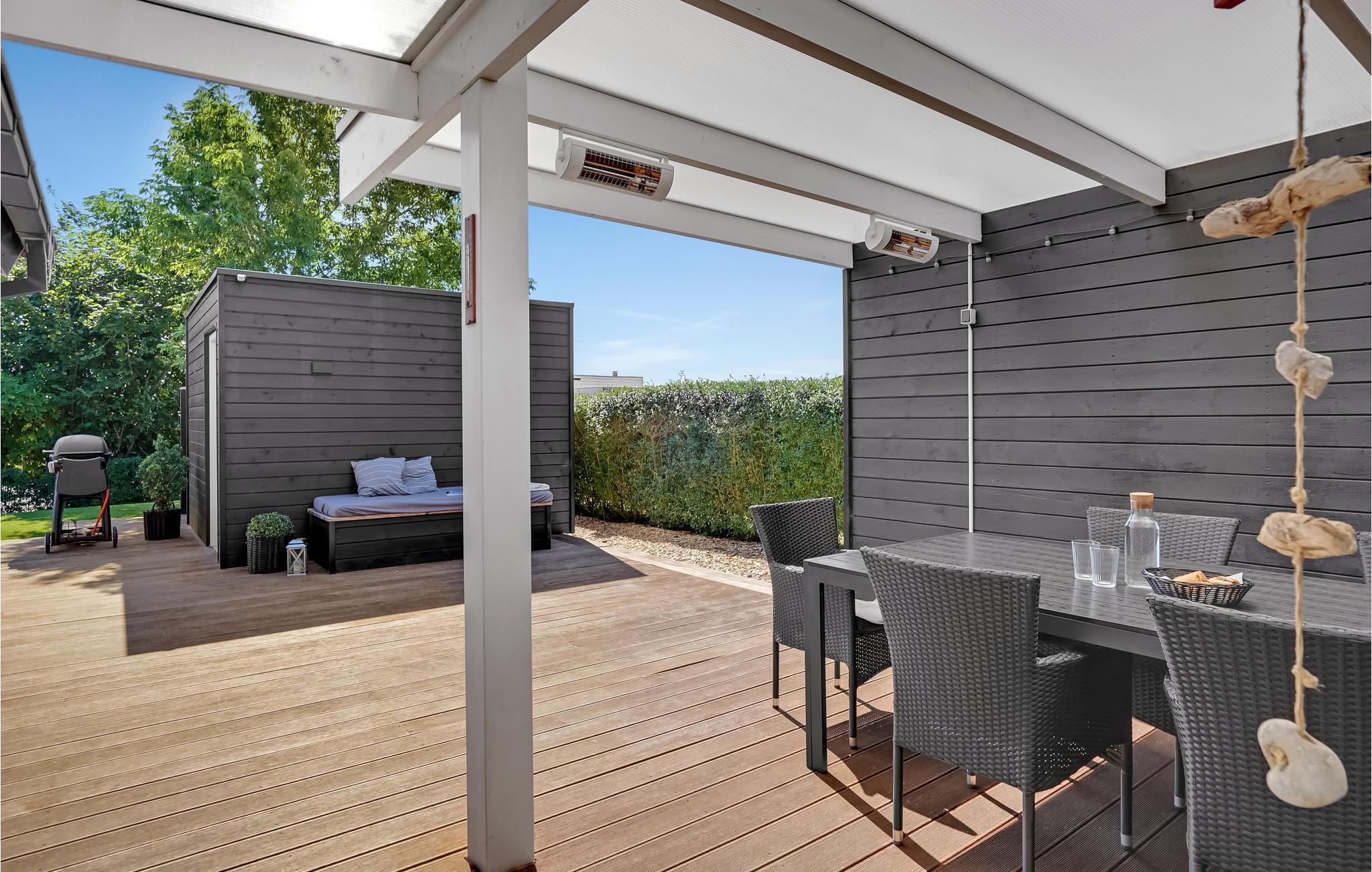Moderne feriehus i skandinavisk stil, beliggende på en rolig vej. Det er bygget i 2019, og har den skønneste, store, delvis overdækkede terrasse. Her vil I helt sikkert komme til at opholde jer mange timer i løbet af ferien. Derudover er der lavet en nedskænket terrasse (med trappe ned) på grunden, hvor I kan solbade ugenert, og lige ved huset findes en udendørs bruser, hvor I kan skylle jer efter en dejlig tur ved stranden, der ligger ganske tæt på huset.