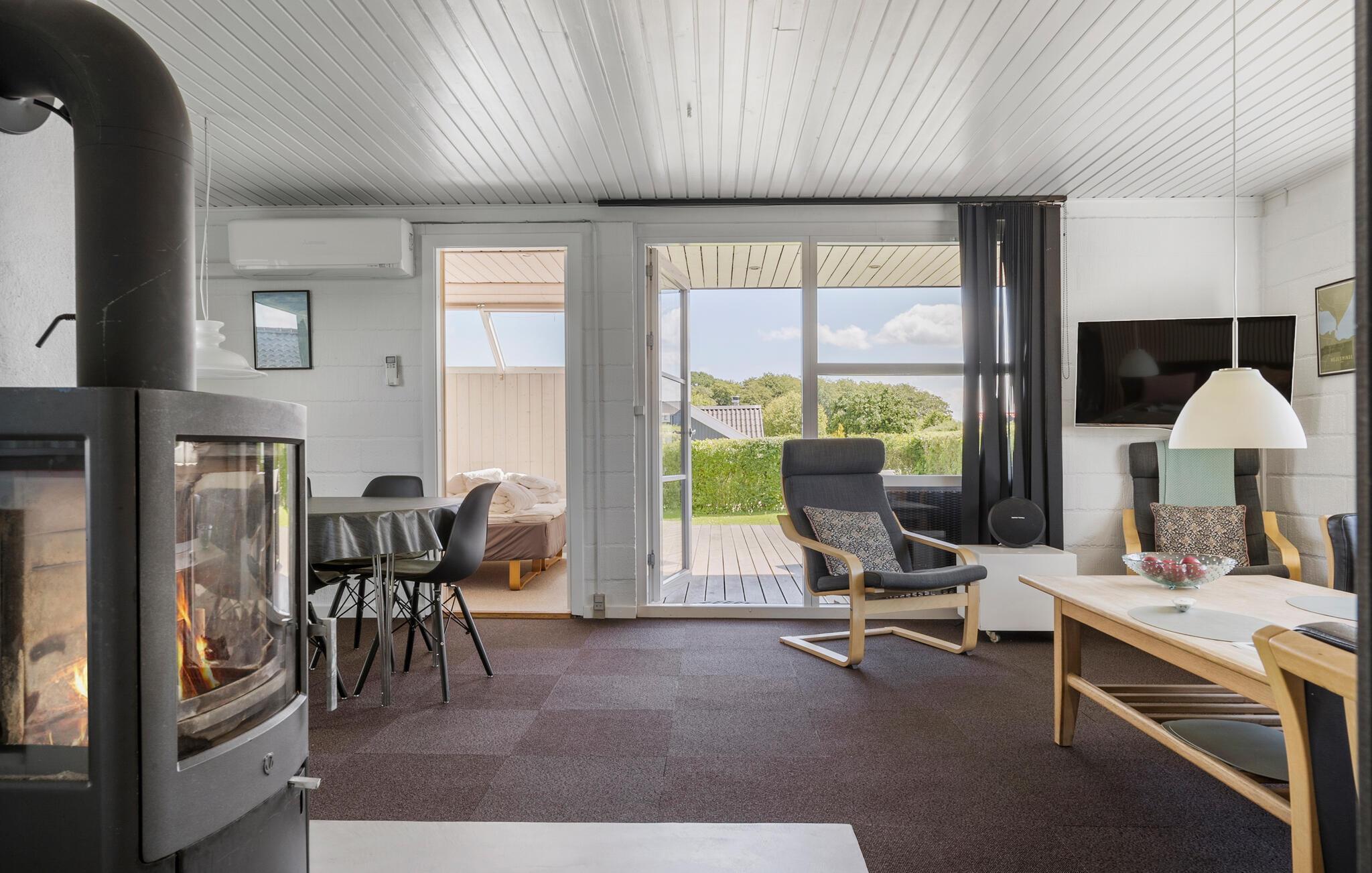 Dette sommerhus ligger på en stille vej med god plads på grunden og en delvis overdækket terrasse. Huset er pænt renoveret og der er tilbygget et stort badeværelse med spabad og sauna, samt et soveværelse med et flot lysindfald. Stuen og køkkenet er i åben forbindelse med brændeovnen som den centrale varmekilde, derudover er der også varmepumpe så opvarmningen er billig. I huset findes i alt 3 soveværelser, der giver plads til 5 voksne og 2 børn. I haven kan I hygge jer ved bålpladsen med at lave snobrød eller skumfiduser til s'mores. På grunden er der fint plads til 2 biler. Spis eller solbad på den flotte træterrasse, hvor der er masser af plads.