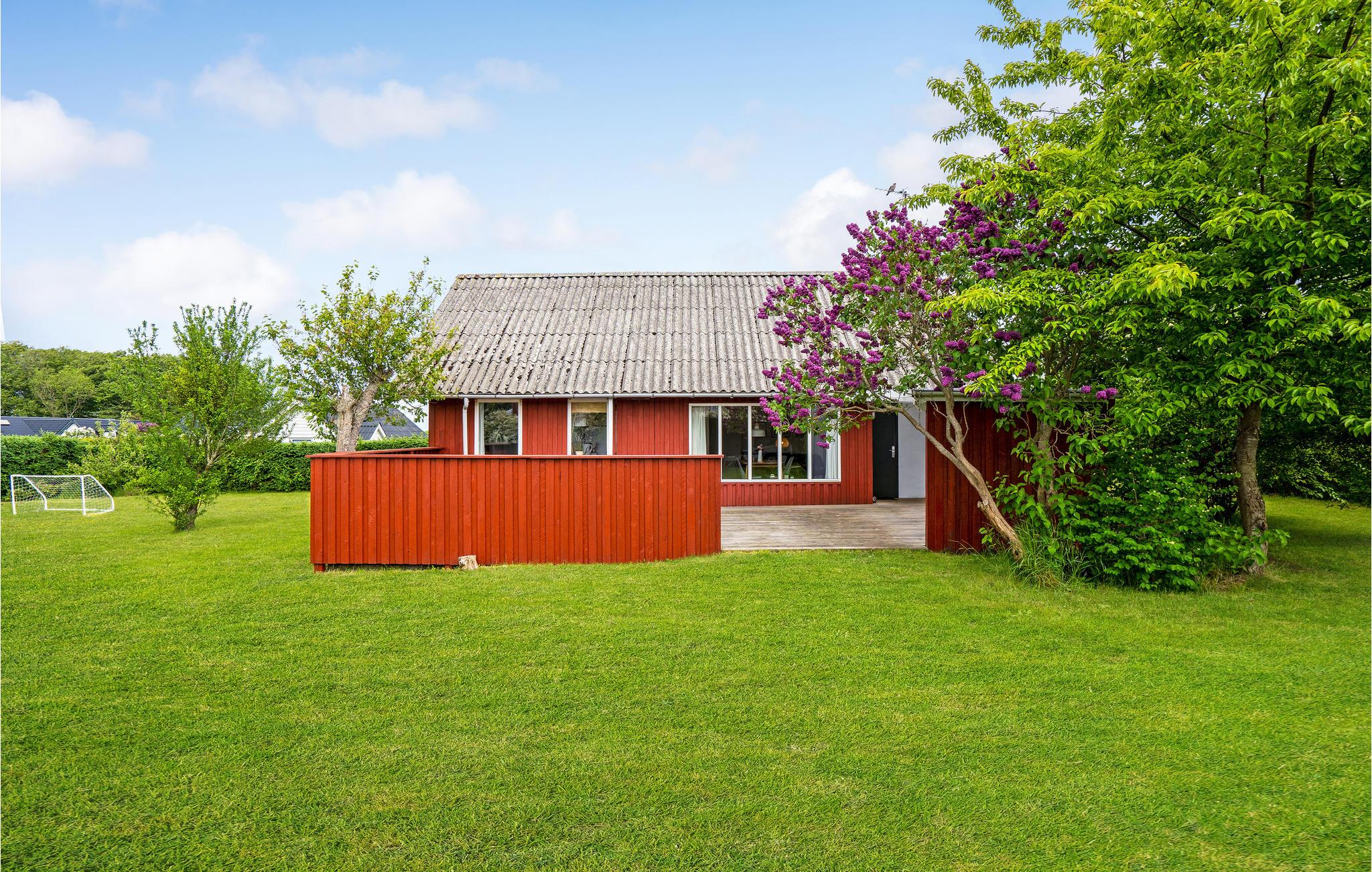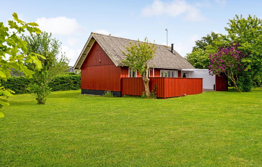 Hyggeligt rødmalet træsommerhus tæt på Lillebælts strand med brændeovn og stor have til afslapning og udendørs aktiviteter.
