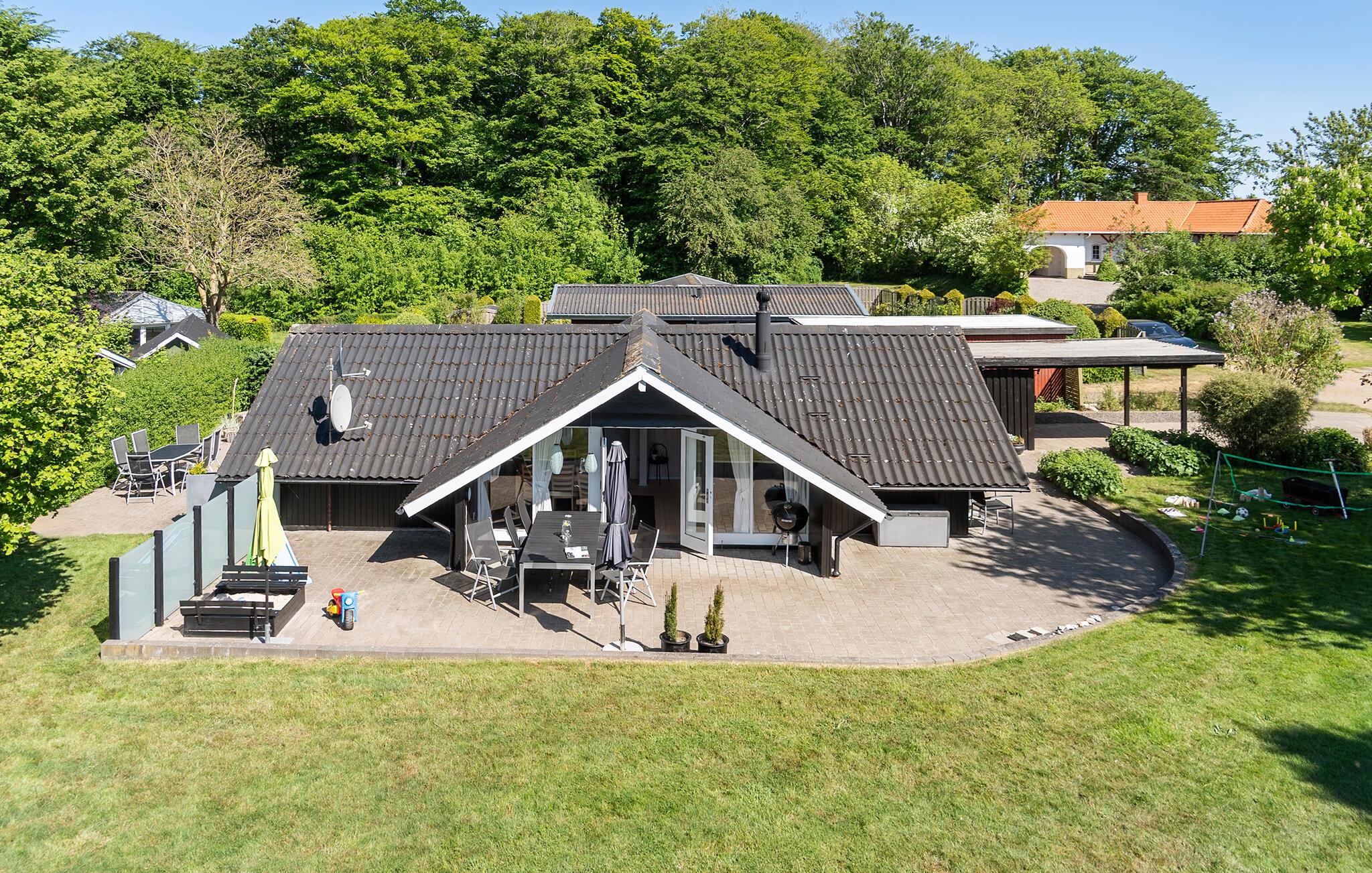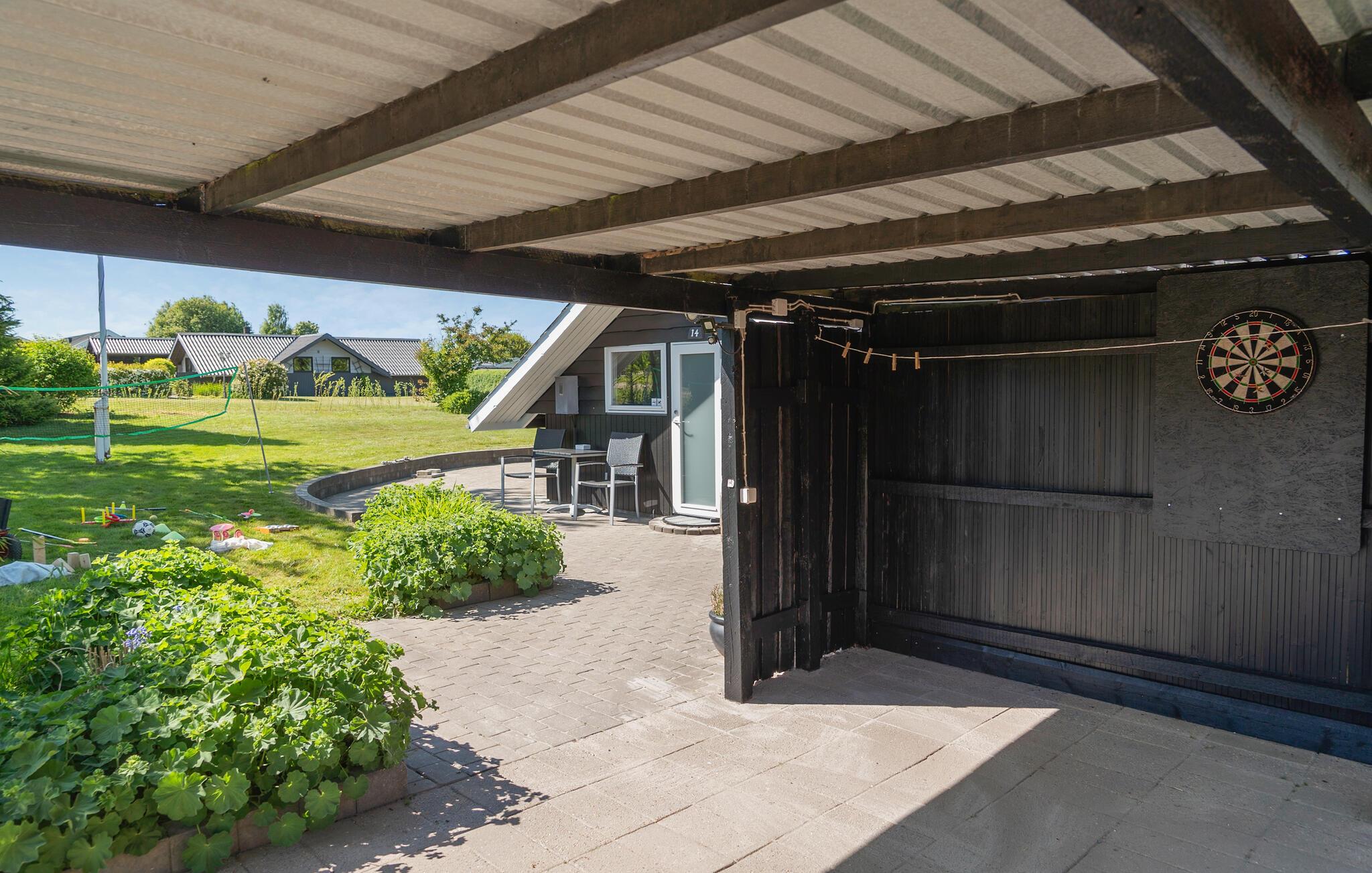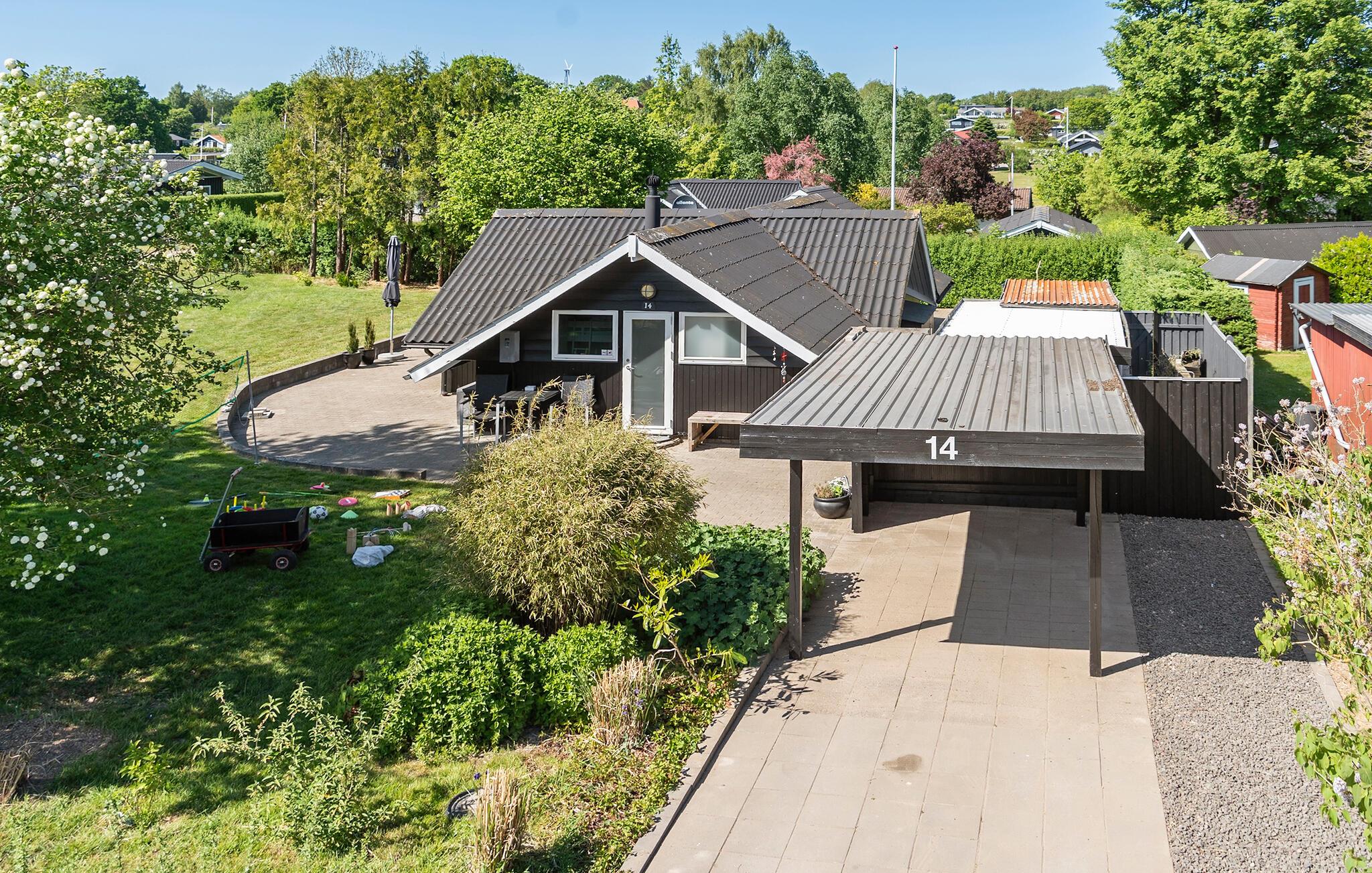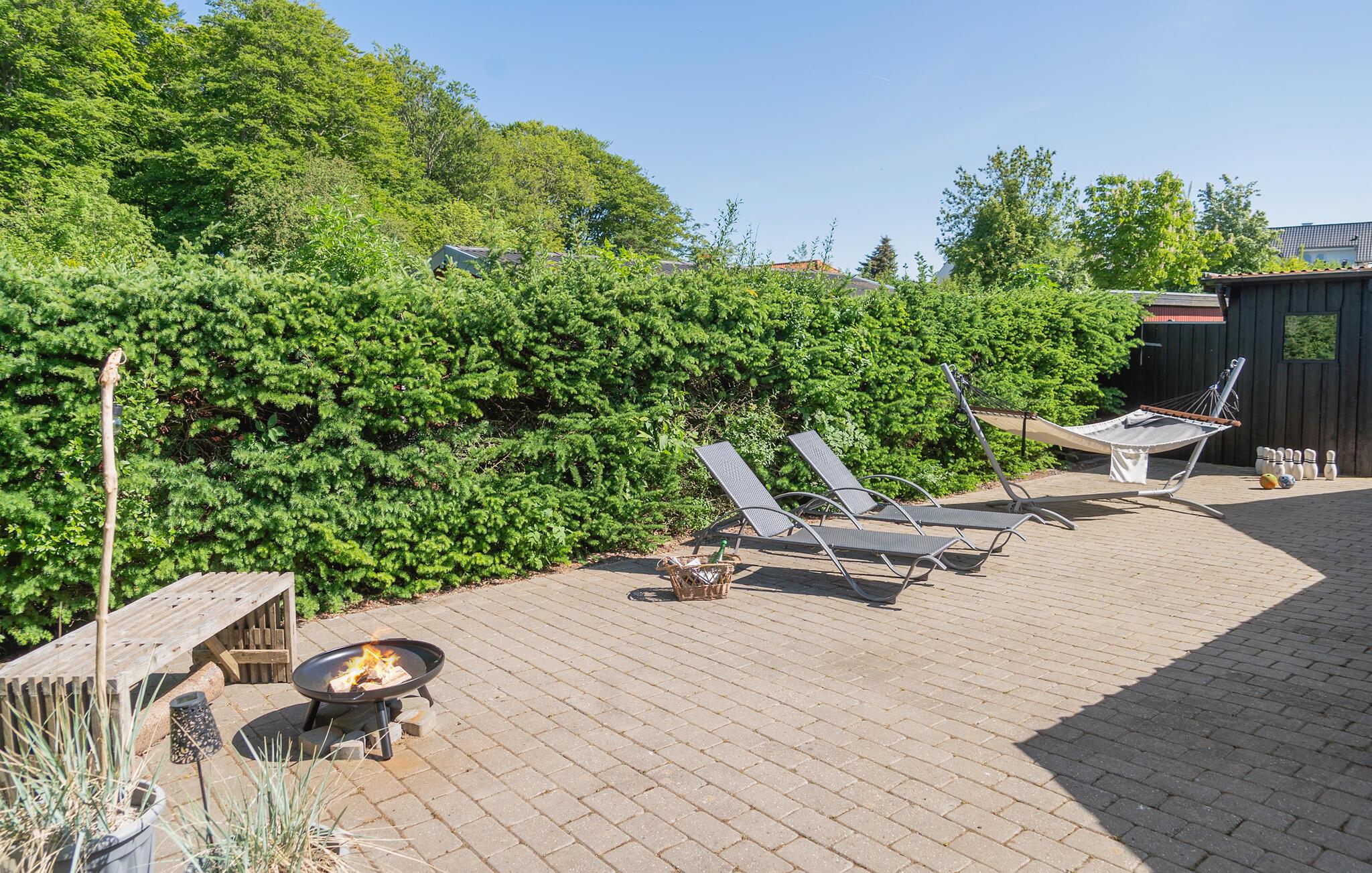 Der er god plads til at leg og afslapning på husets udearel, som både omfatter en stor græsplæne og en dejlig terrasse, hvor I kan læne jer tilbage i solen. Slut en hyggelig sommeraften af rundt om bålet med snobrød og skumfiduser.