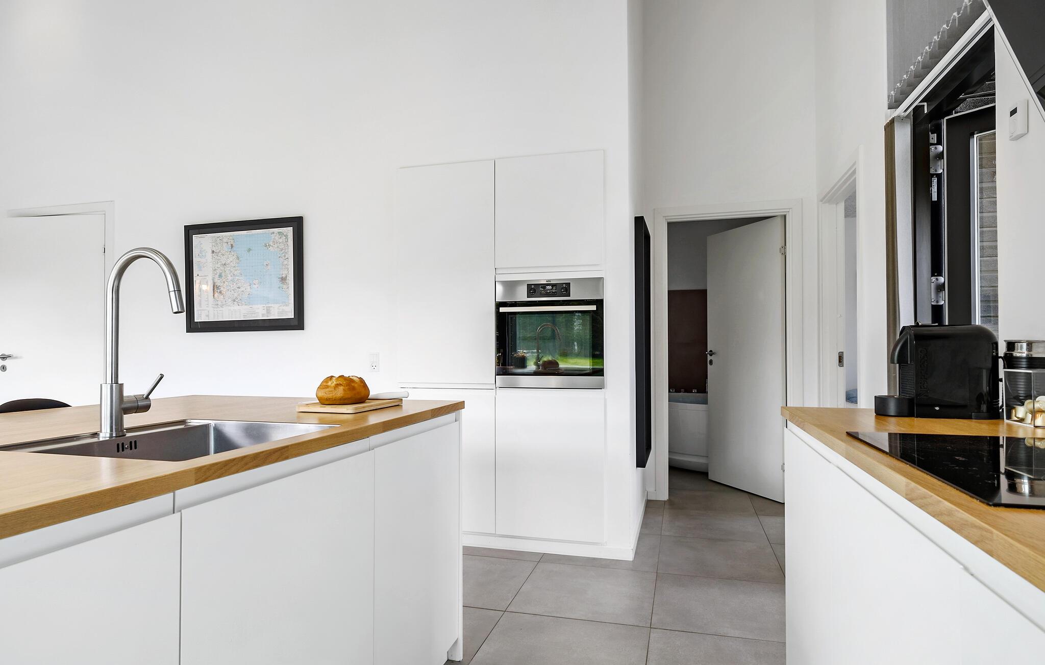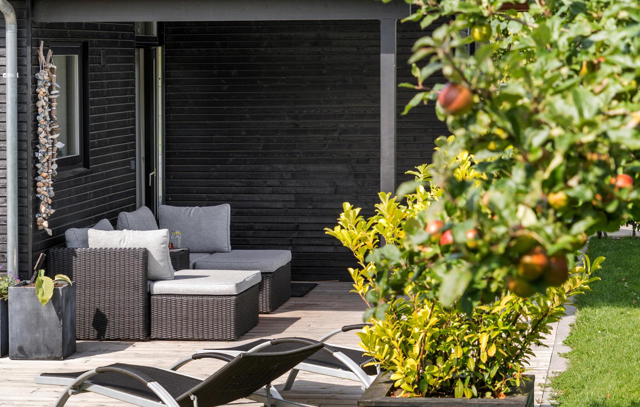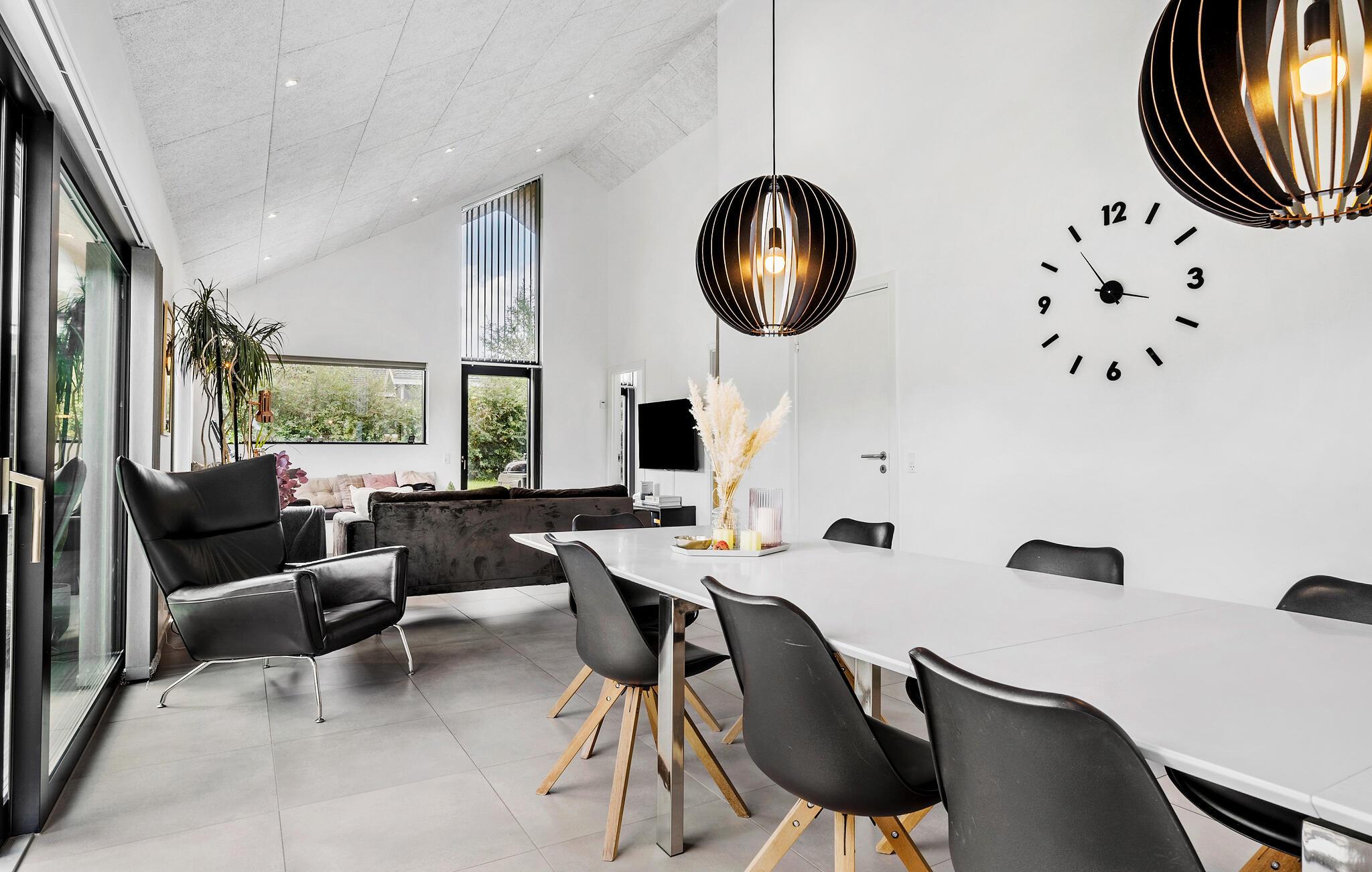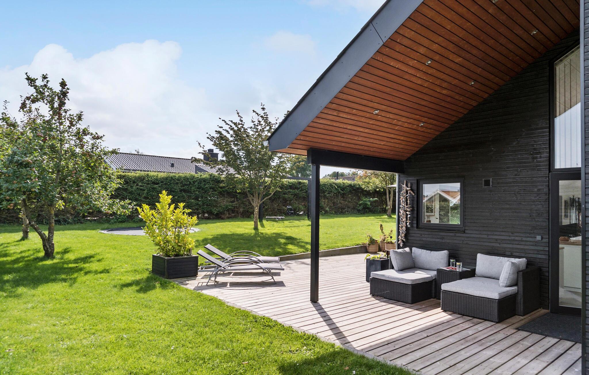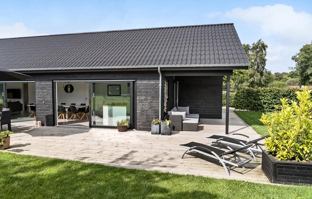Dette sommerhus nær Hejlsminde Strand ved Lillebælt kombinerer lækre kvalitetsløsninger med en herlig beliggenhed. Her er der plads til en stor familie og optimale forhold til at slappe af. I kan se frem til en skøn åben planløsning, som forener køkken, spiseplads og hyggelig opholdsstue i et stort opholdsrum. Stilen er minimalistisk i varme mørk/lyse kontrastfarver, og faciliteterne er moderne. Vinduesfronterne lukker lyset ind i boligen sammen med den grønne udsigt, så I får de dejligste rammer til at sidde med dagens måltider eller en kop kaffe og en god bog.