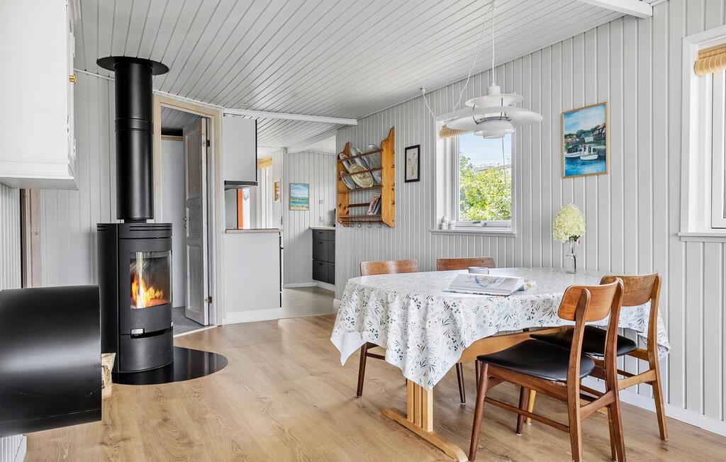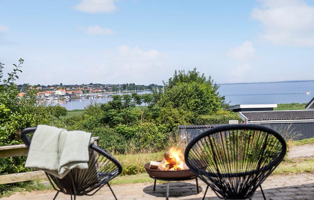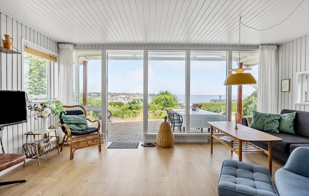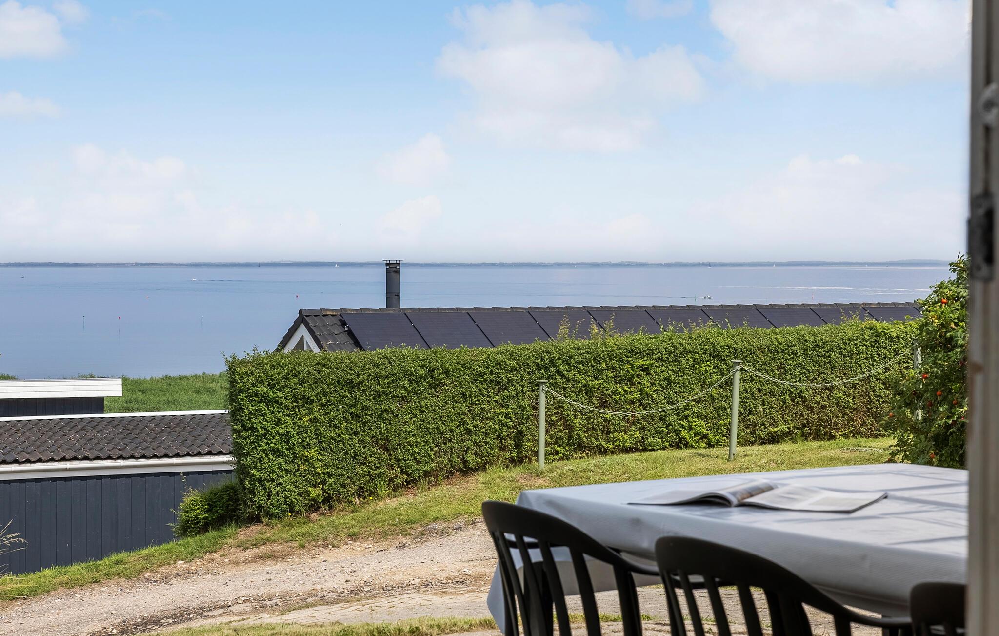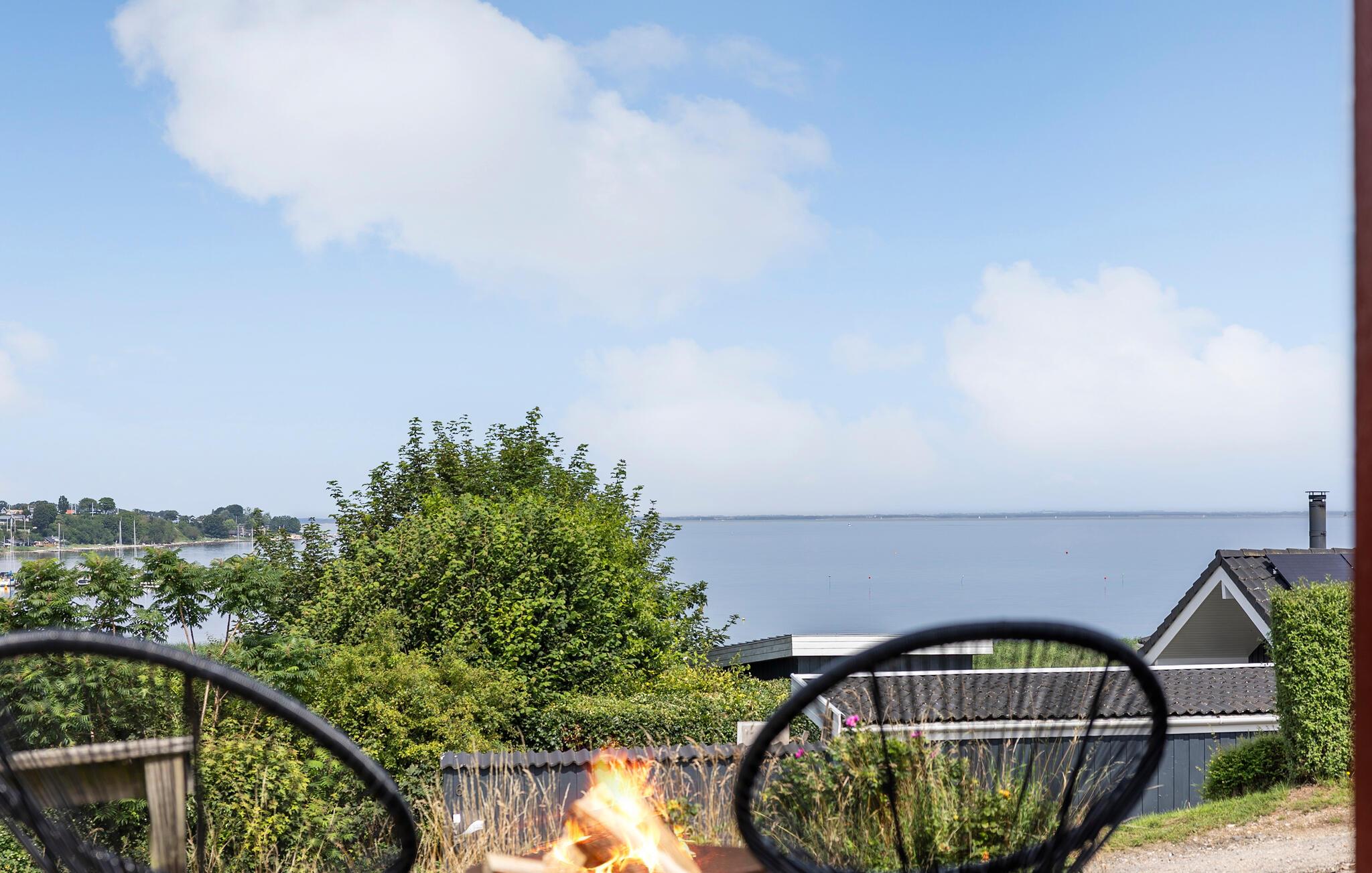 Nogle få skridt fra stranden byder dette lyse og hyggelige feriehus jer velkommen. Den store glasfacade tilbyder en storslået udsigt over Lillebælt, samtidig med at den lukker masser af naturligt dagslys ind i den smagfulde stue. Nyd lækre måltider ved spisebordet, fordyb jer i en bog i den behagelige lænestol efter en saunatur eller nyd en spilleaften med familien, mens brændeovnen bader stuen i varmt lys.