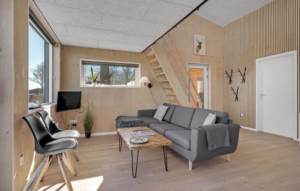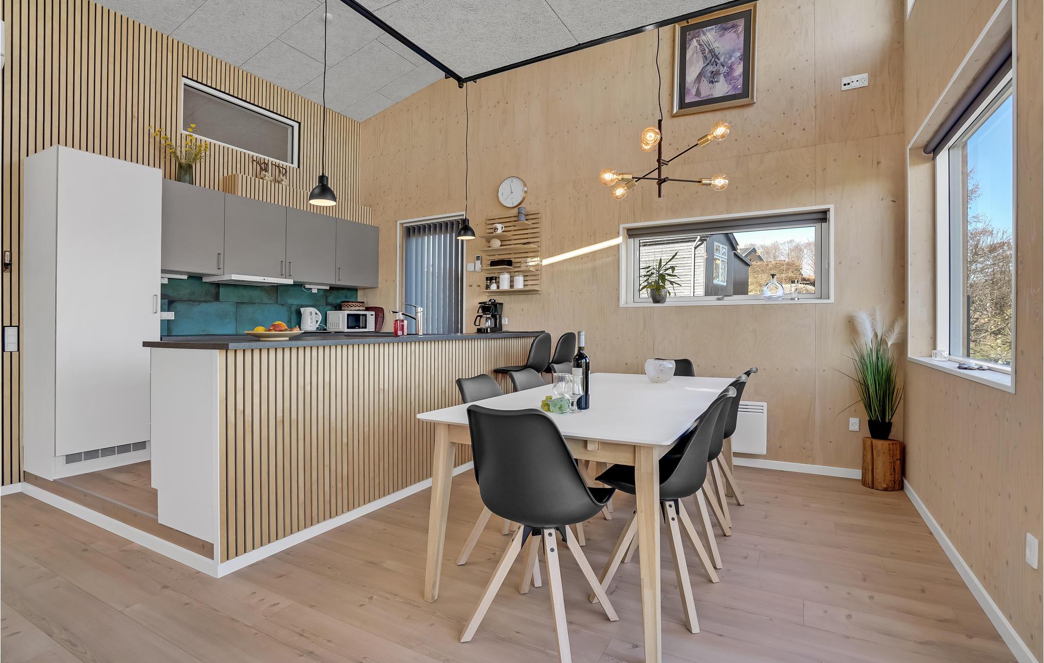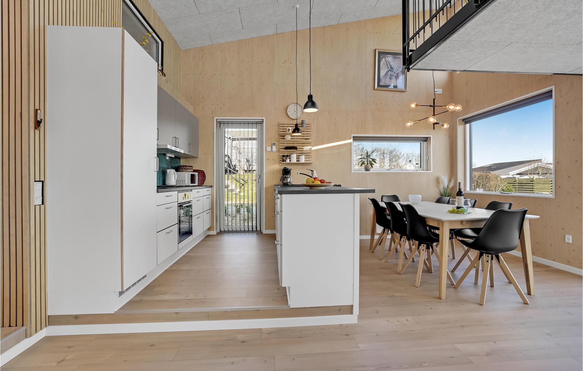Træd ind i et moderne og elegant feriehus, som er gennemført indrettet med lækre detaljer og stilfuldt design. Loftshøjden og de store vinduesflader giver boligen en rummelig og behagelig fornemmelse, så her kommer I helt automatisk til at føle jer godt tilpas. Uanset om I kommer for at slappe af eller være aktive, får I mulighed for det, for der er både udendørsspil, liggestole, bålplads og en udendørsbruser til at skylle strandsandet af. Glæd jer til hyggelige aftener på den store terrasse, hvor der er havemøbler og grill.