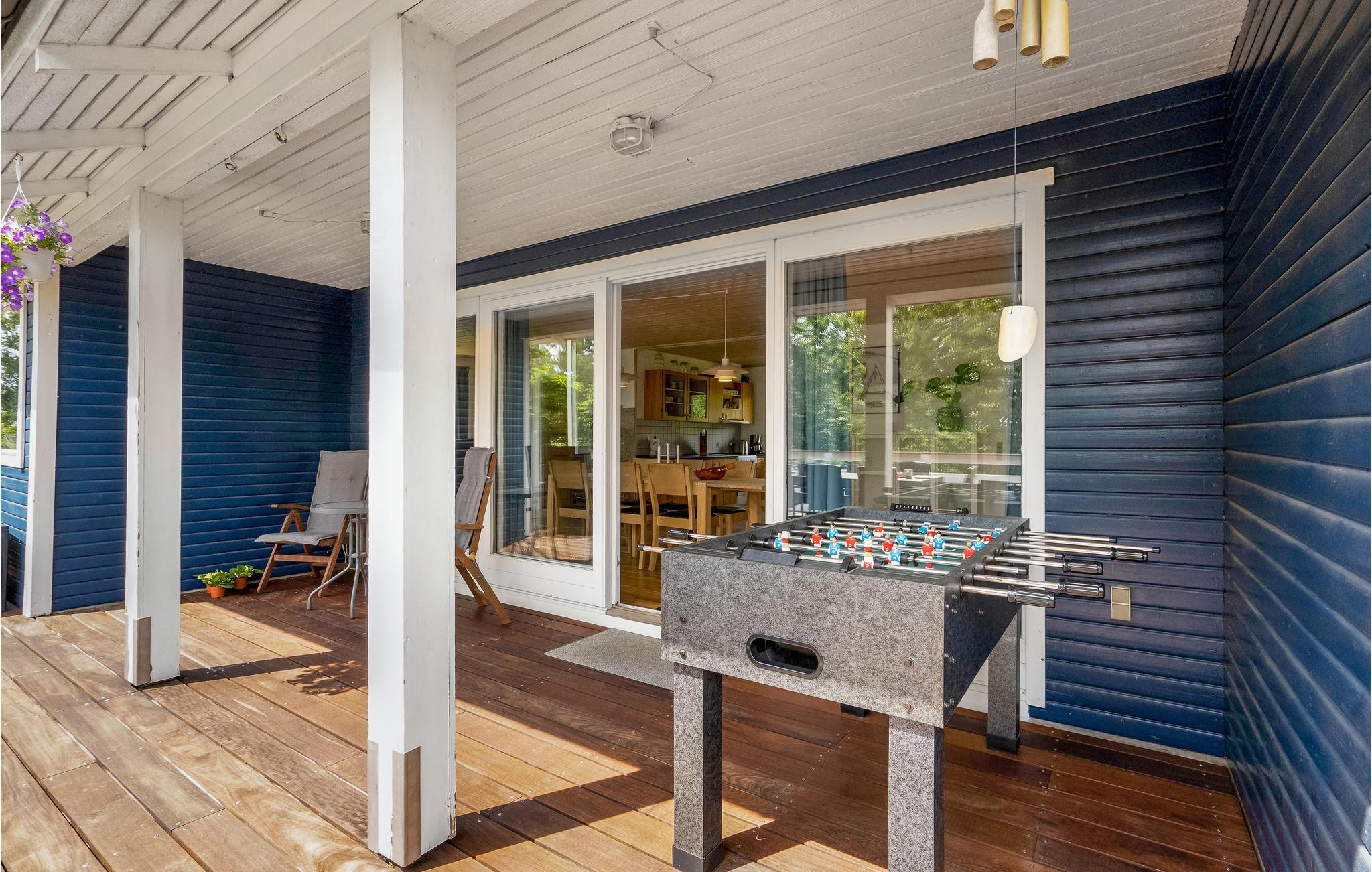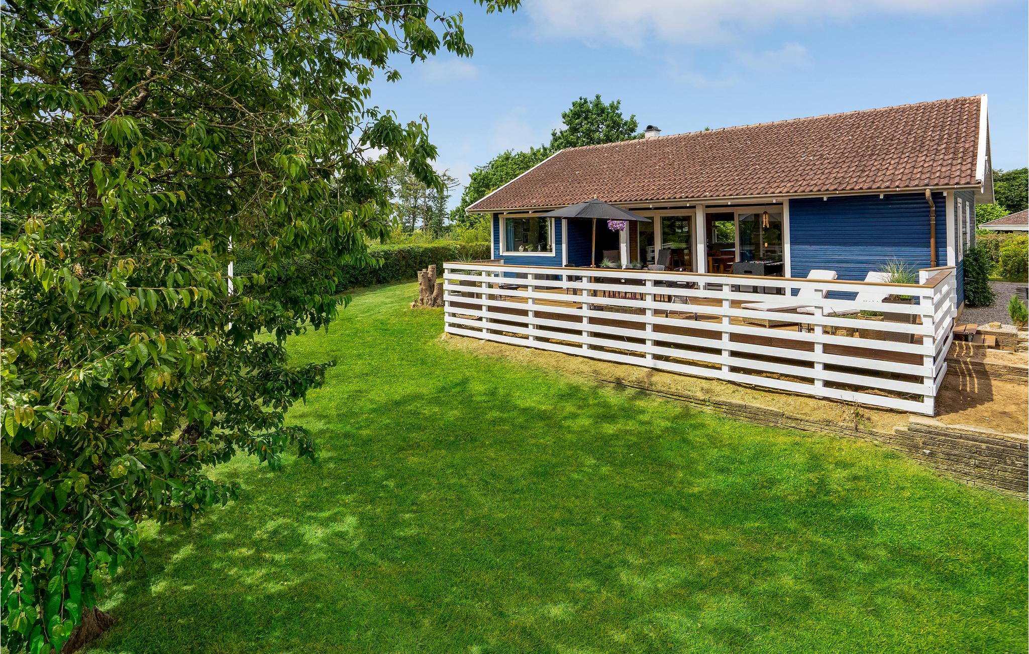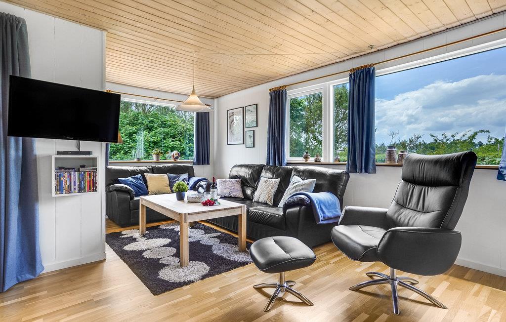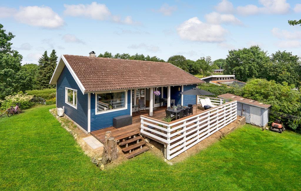 Dette rummelige, højtbeliggende feriehus er den ideelle indkvartering til familiesammenkomsten eller to familier. Indenfor er der god plads, og de mange store vinduer oplyser det store, åbne køkken-alrum. I vil hurtigt bemærke, hvordan de blå gardiner på hyggelig vis matcher træhusets blå farve. Her står fælles madlavning, sjove brætspil og filmaftener på programmet, og mens I spiser lækker, hjemmelavet feriemad kan I nyde udsigten til haven. Fra stuen kan I gå ud på en stor, delvist overdækket terrasse, der indbyder til solbadning, stemningsfulde grillaftener og en dyst i bordfodbold. Mens I griller, kan børnene rutsje og gynge på livet løs.