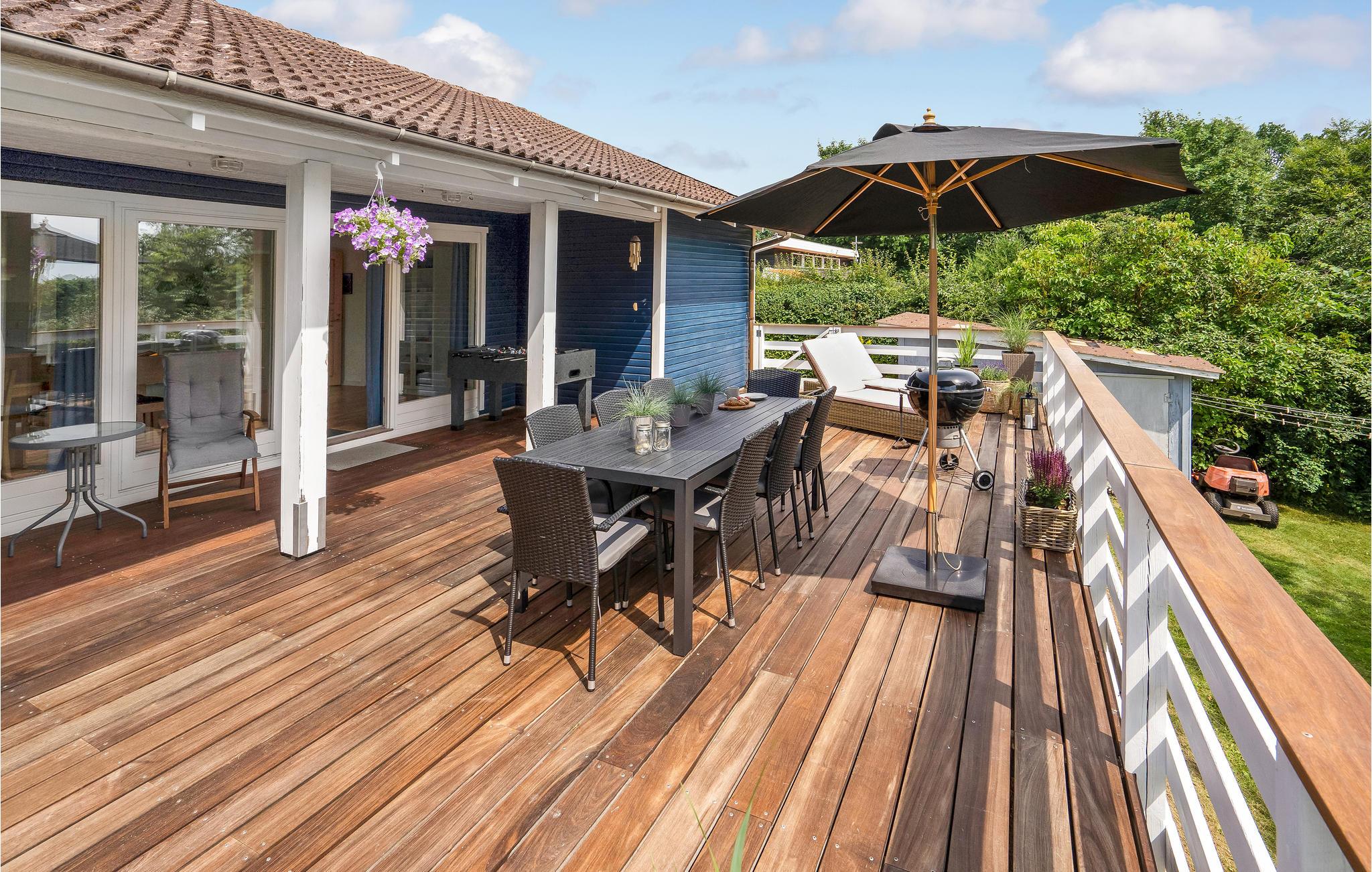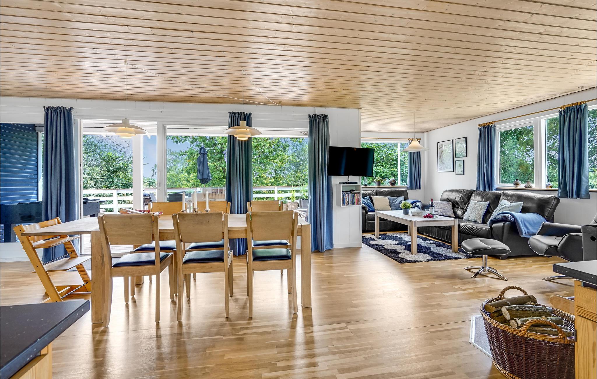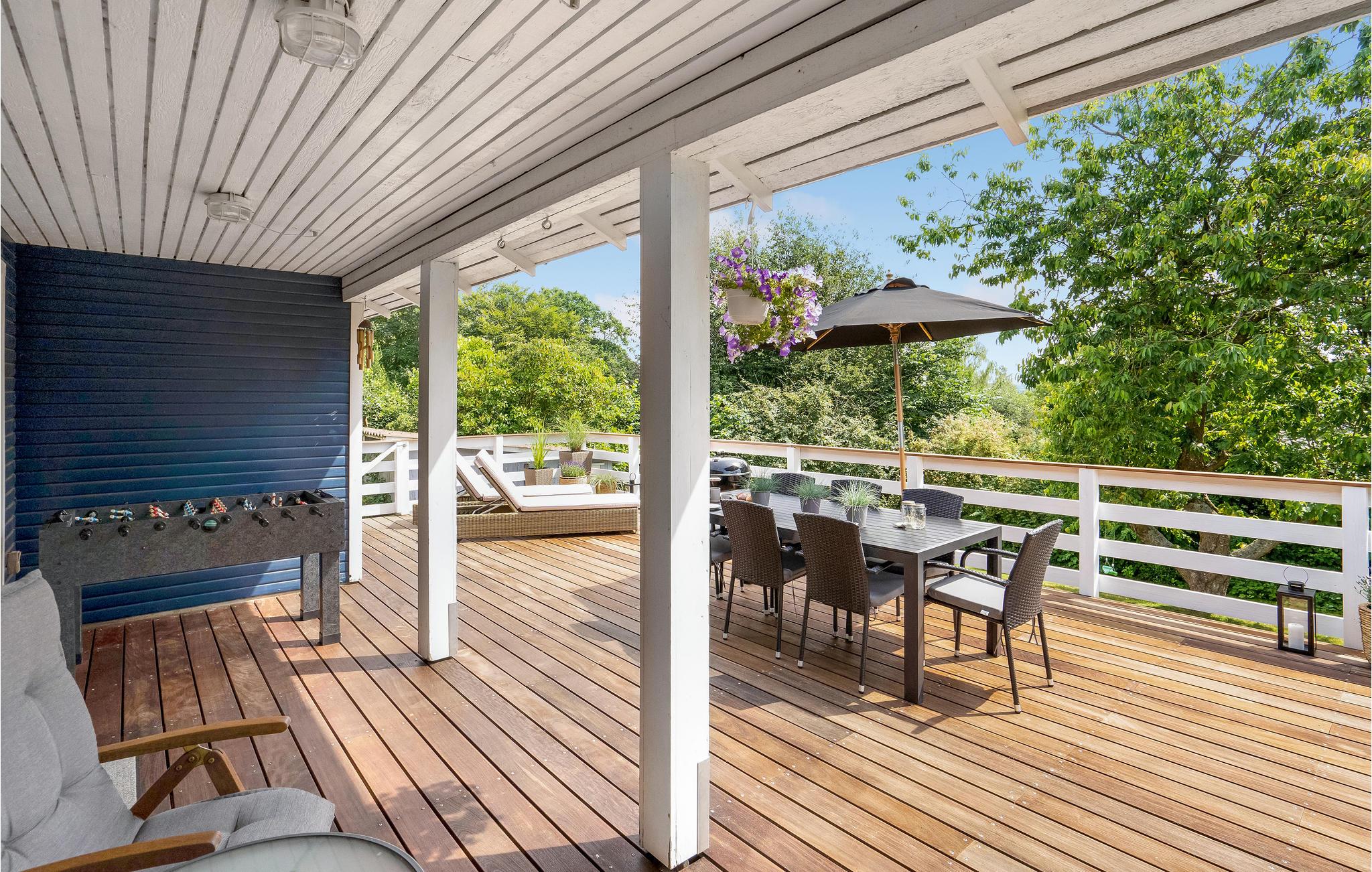 Dette rummelige, højtbeliggende feriehus er den ideelle indkvartering til familiesammenkomsten eller to familier. Indenfor er der god plads, og de mange store vinduer oplyser det store, åbne køkken-alrum. I vil hurtigt bemærke, hvordan de blå gardiner på hyggelig vis matcher træhusets blå farve. Her står fælles madlavning, sjove brætspil og filmaftener på programmet, og mens I spiser lækker, hjemmelavet feriemad kan I nyde udsigten til haven. Fra stuen kan I gå ud på en stor, delvist overdækket terrasse, der indbyder til solbadning, stemningsfulde grillaftener og en dyst i bordfodbold. Mens I griller, kan børnene rutsje og gynge på livet løs.