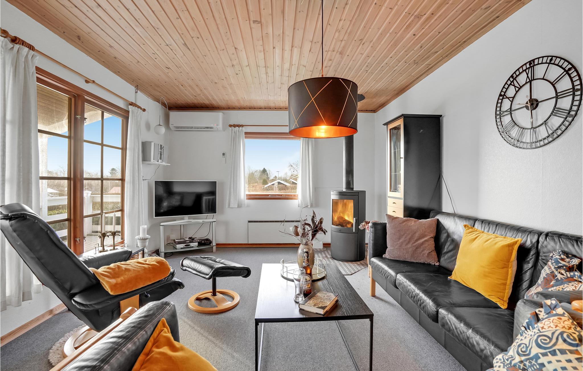 Hyggeligt træhus i Hejlsminde med overdækket terrasse, brændeovn og tæt på skov, strand og havudsigt.