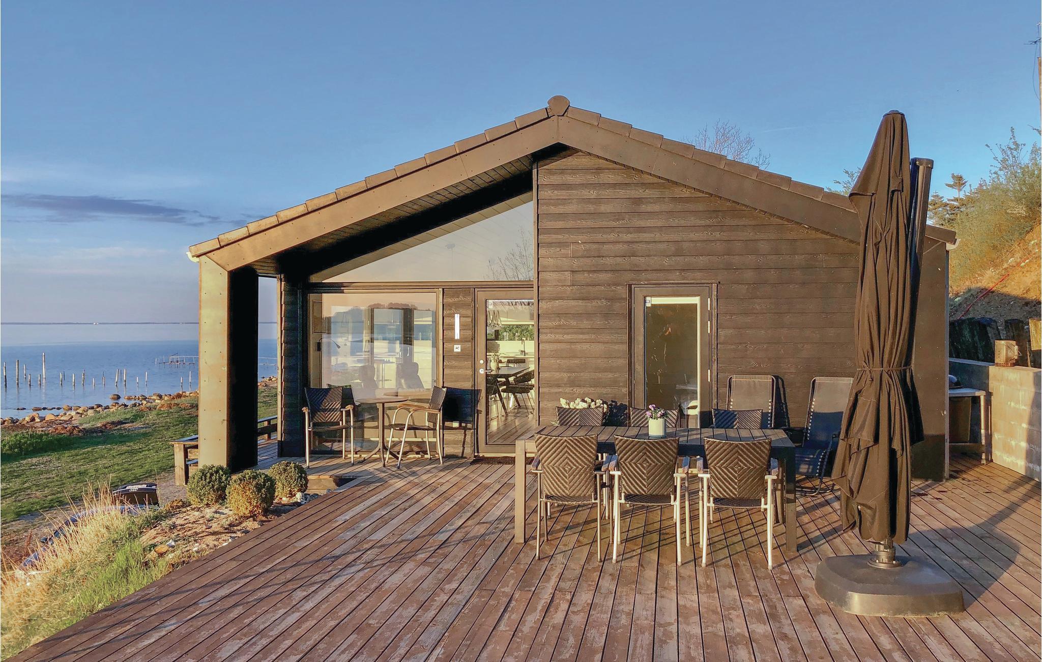 Moderne sommerhus i første række ved Anslet Strand med panoramaudsigt over Lillebælt og Hejlsminde Bugt.