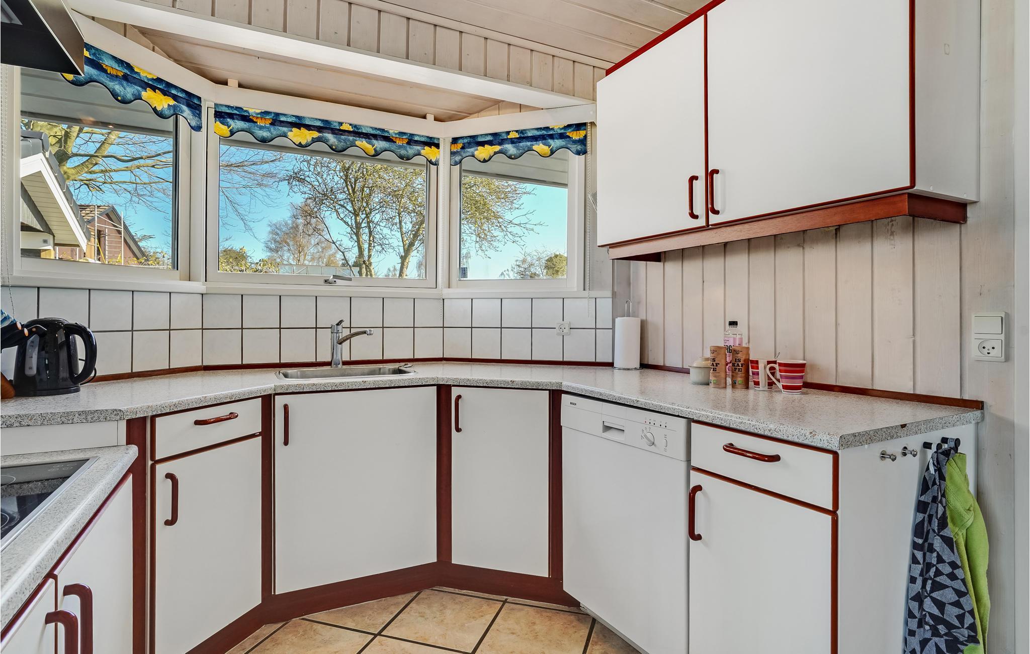Højtbeliggende sommerhus med en dejlig udsigt til indsøen. Nyd udsigten både fra den store delvis overdækkede terrasse og inde fra den lyse stue gennem de store vinduespartier. Der er to gode soveværelser samt sovepladser i alkoven og på hemsen. Endvidere findes her et stort badeværelse med spabad og adgang til sauna, og selvfølgelig et gæstetoilet. Udelivet bliver en stor del af ferien med den store terrasse, hvor I kan opholde jer forskellige steder omkring huset alt efter sol og vind.