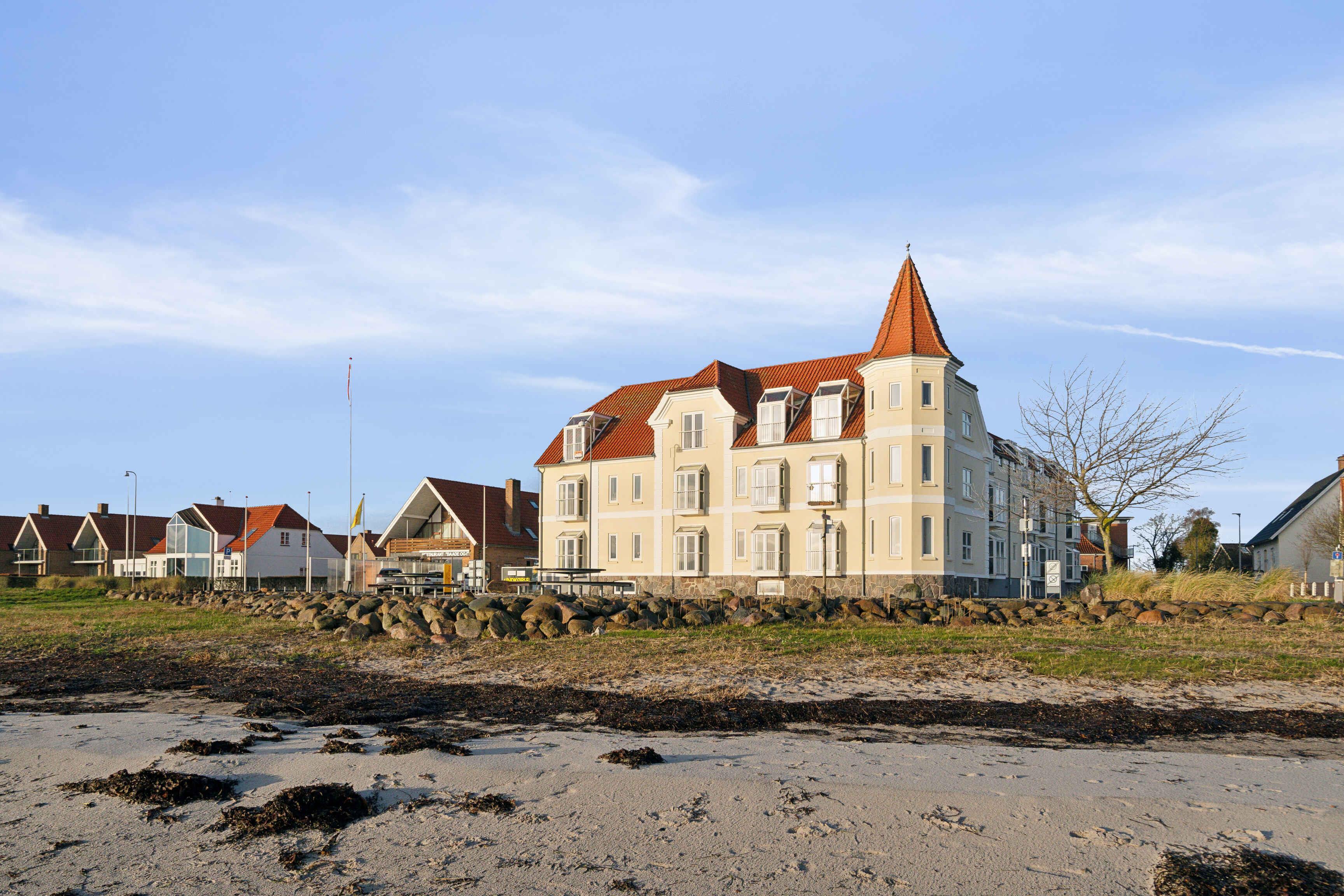 Hyggelig ferielejlighed på Hejlsminde Badehotel med havudsigt, spa og adgang til aktiviteter for hele familien.
