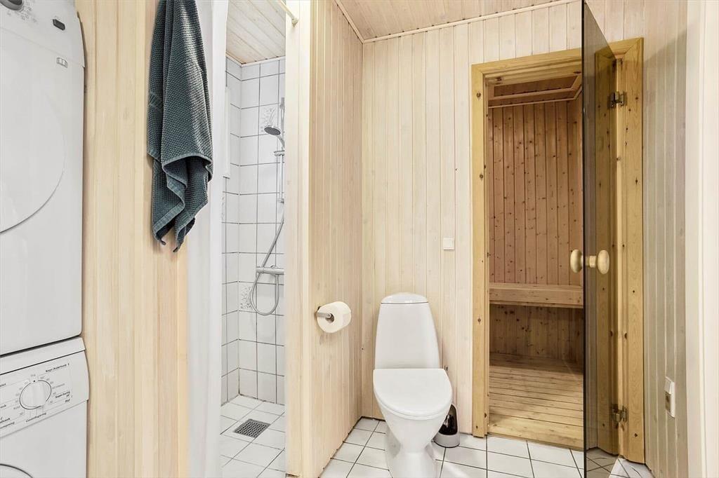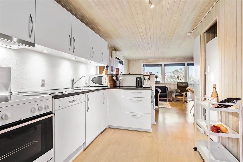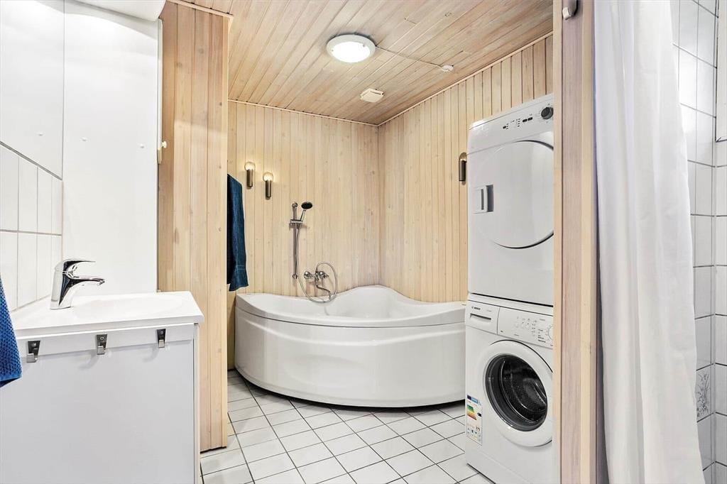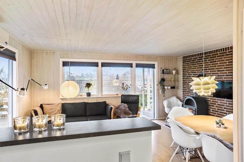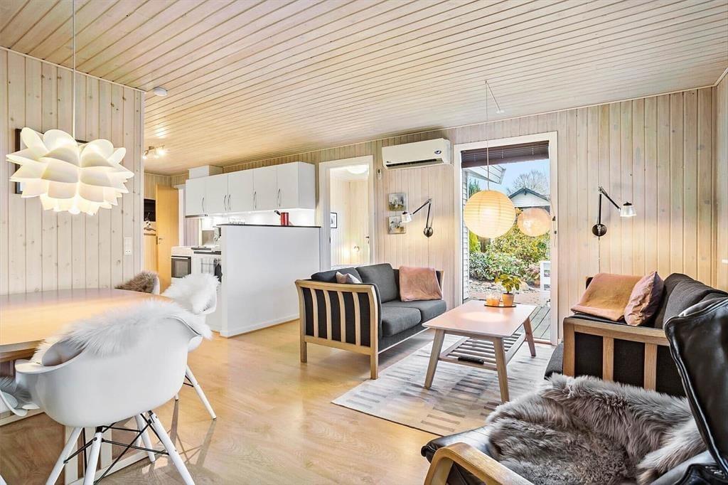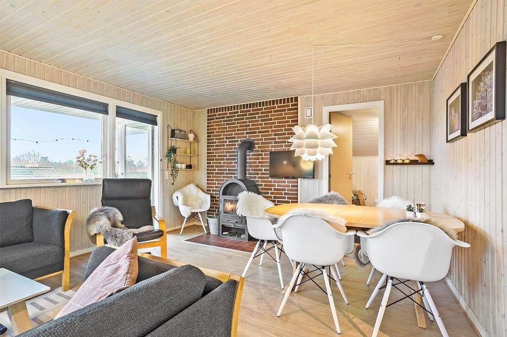 Indenfor mødes du af en lys og hyggelig atmosfære, hvor indretningen inviterer til afslapning og samvær. Sommerhusets rum er holdt i lyse nuancer, som sammen med det naturlige lys skaber en behagelig og imødekommende stemning. Brændeovnen danner et naturligt samlingspunkt, især på køligere dage, hvor flammernes knitren og den blide varme indbyder til ro, en god bog eller lange samtaler over en kop kaffe. Opholdsrummet hænger naturligt sammen og gør det let at være sammen – hvad enten I laver mad, spiller spil eller bare nyder hinandens selskab. Wellness-delen sætter prikken over i’et med både spa og sauna, hvor du kan lade skuldrene sænke sig og give dig hen til ren afslapning efter en dag fuld af oplevelser. Her er rammerne skabt til at trække stikket og nyde ferien i dit eget tempo.