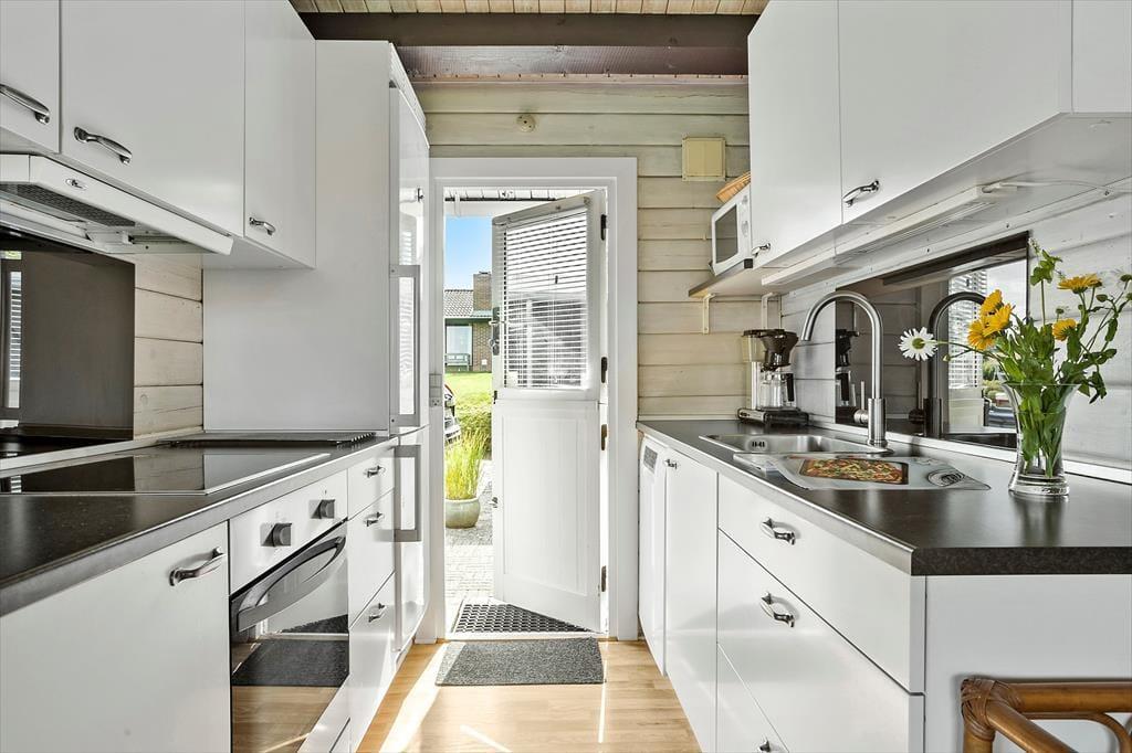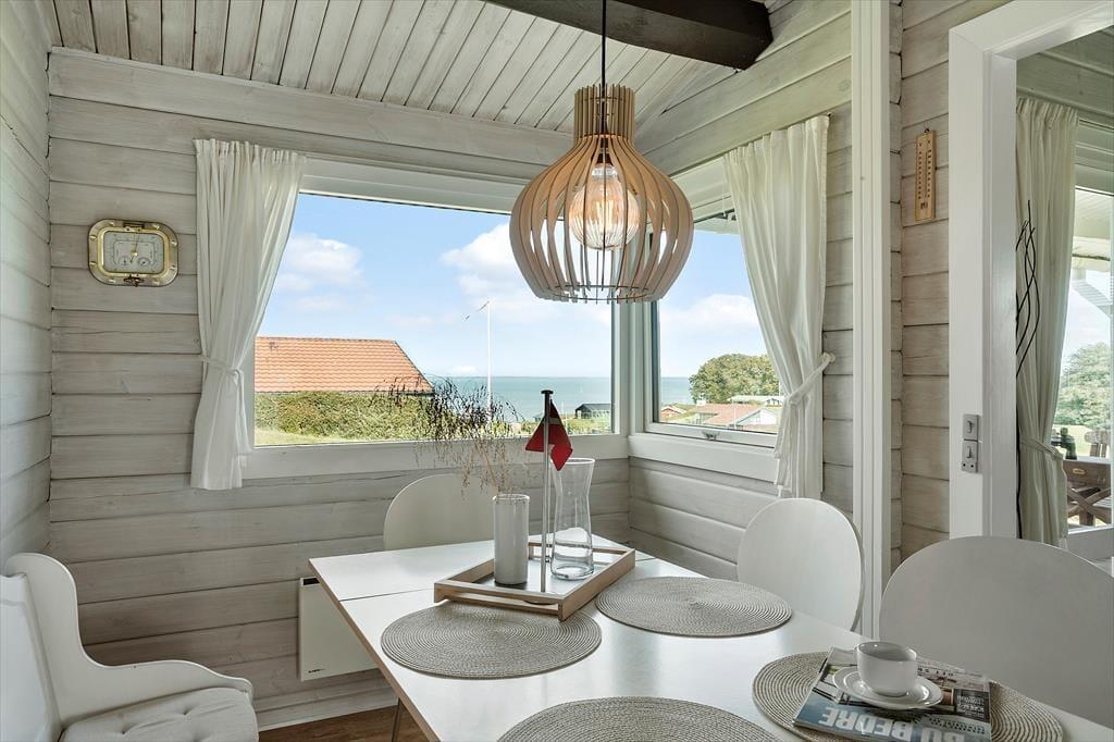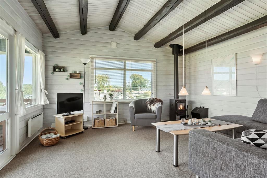 Indenfor i huset bliver du straks mødt af en lys og rummelig atmosfære. Her er der plads til at koble af, nyde samværet og lade batterierne op. De store vinduer giver et skønt lysindfald og sikrer, at du konstant kan nyde panoramaudsigten over det grønne landskab og det glitrende vand i det fjerne. Det åbne køkken og stuen ligger i naturlig forlængelse af hinanden, så familien kan samles om madlavningen, brætspil eller hyggesnakke i sofaen, mens bålet knitrer i brændeovnen. Når natten falder på, kan du trække dig tilbage til et af de dejlige værelser og nyde en rolig nats søvn, så du er frisk til nye oplevelser dagen efter.