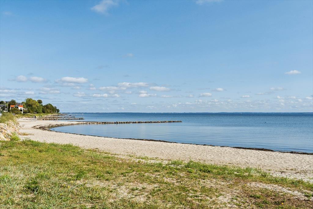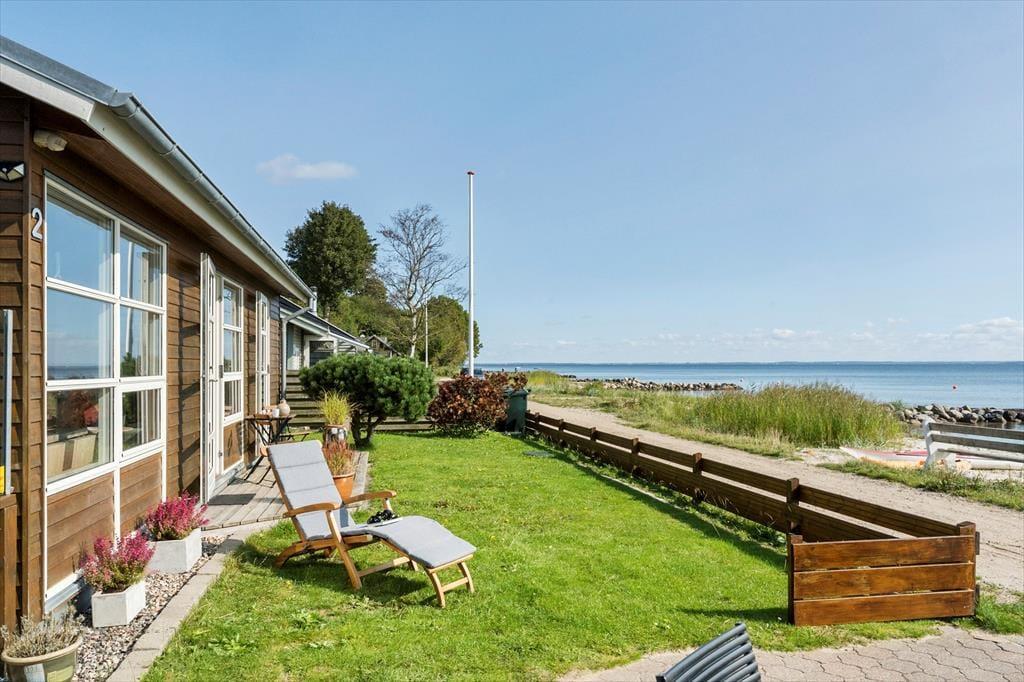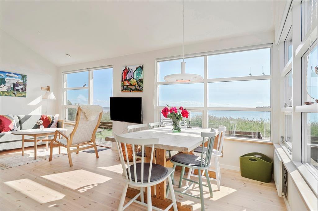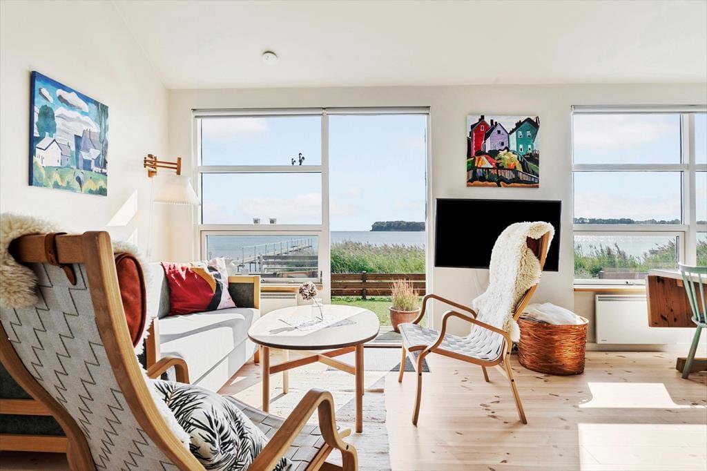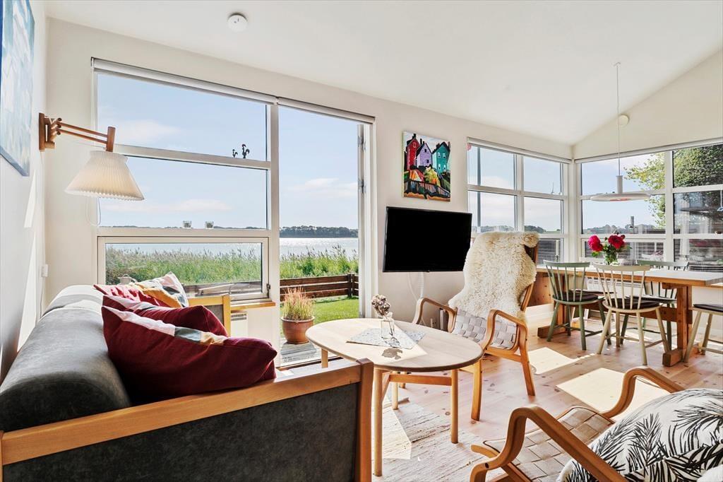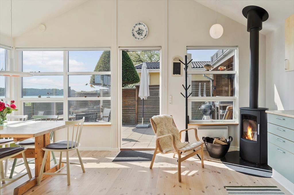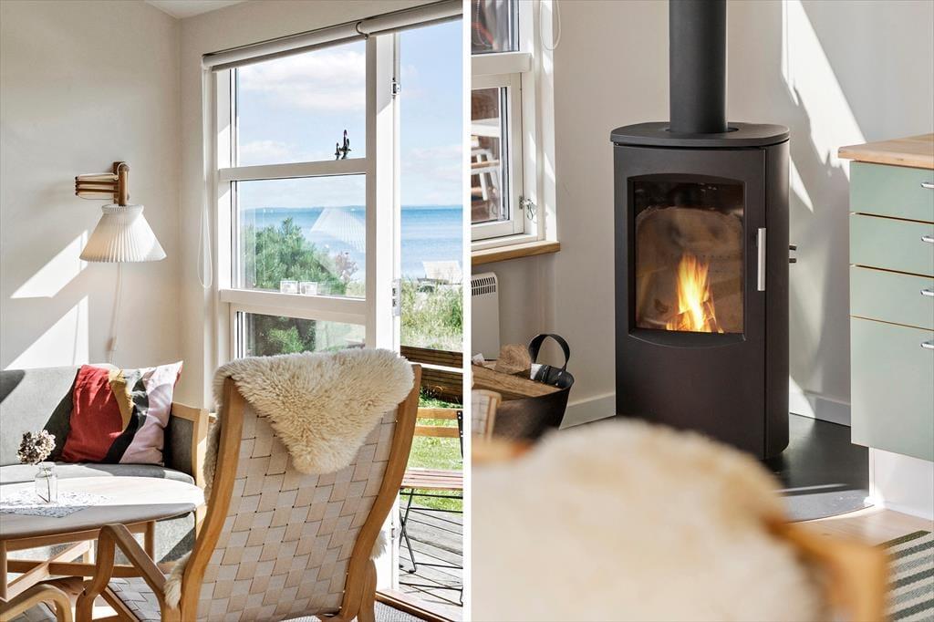 Det arkitekttegnede strandhus er lyst og smagfuldt indrettet i enkel nordisk stil med trægulve, hyggelig brændeovn og loft til kip. De store sydøst vendte glaspartier mod vandet sikrer et ganske særligt lysindfald i det rummelige køkken/opholdsrum og giver uforstyrret panoramaudsigt ud over Lillebælt mod øerne Fyn, Brandsø og Bogø. De to soveværelser er udstyret med dobbeltsenge (140x200 cm), og i stuen findes en ekstra sovesofa. Stort garderobeskab i det ene soveværelse. Fra såvel stue som begge soveværelser er der glasdøre direkte ud i det fri.