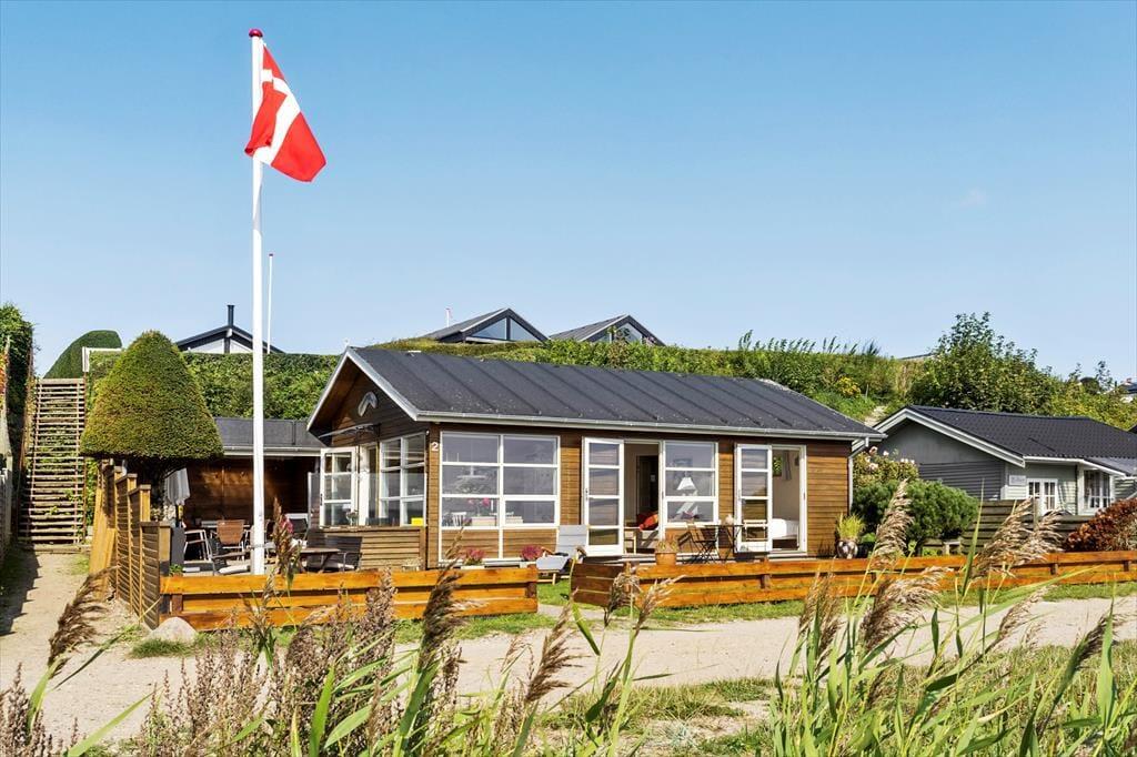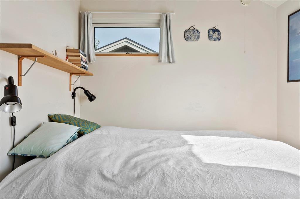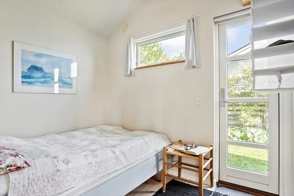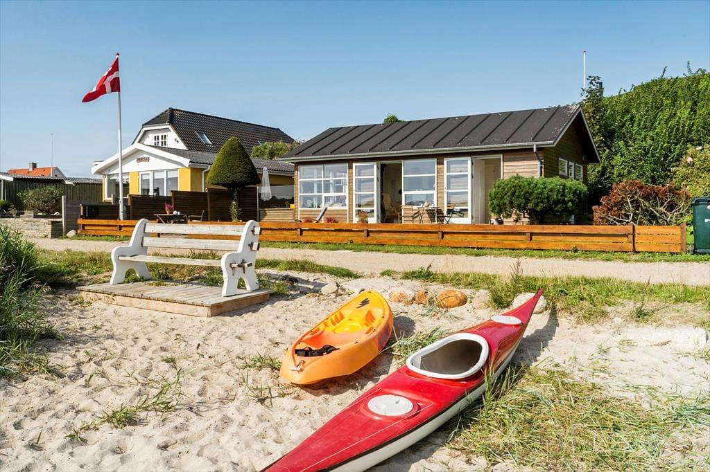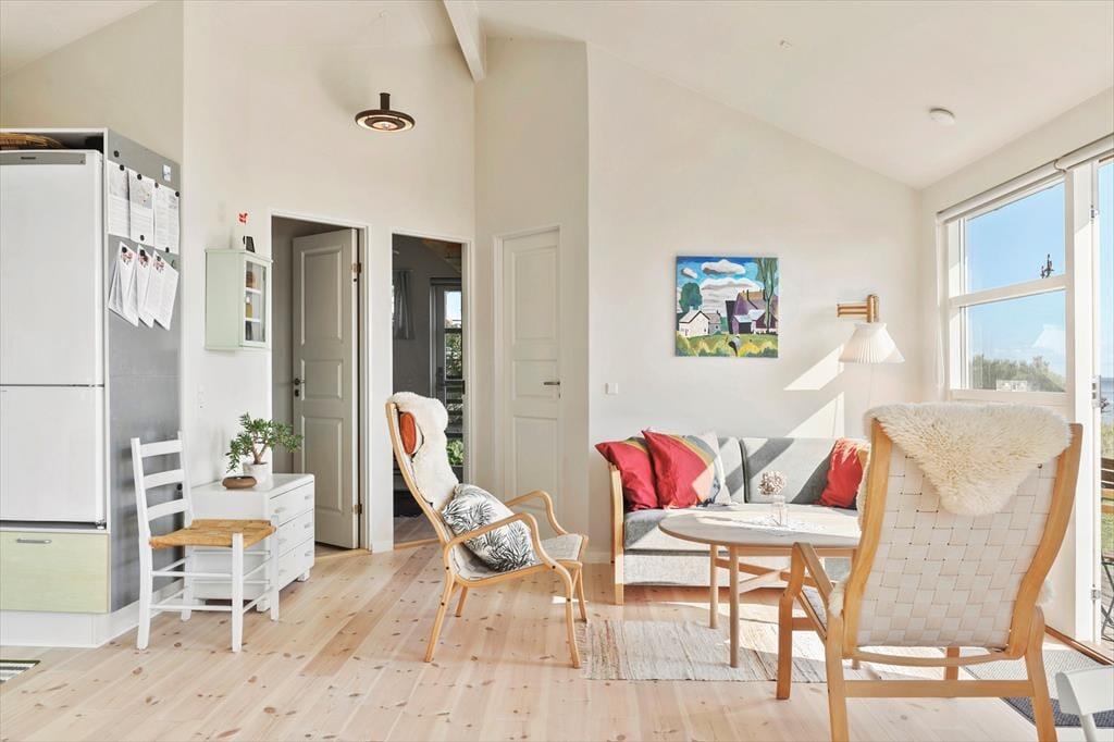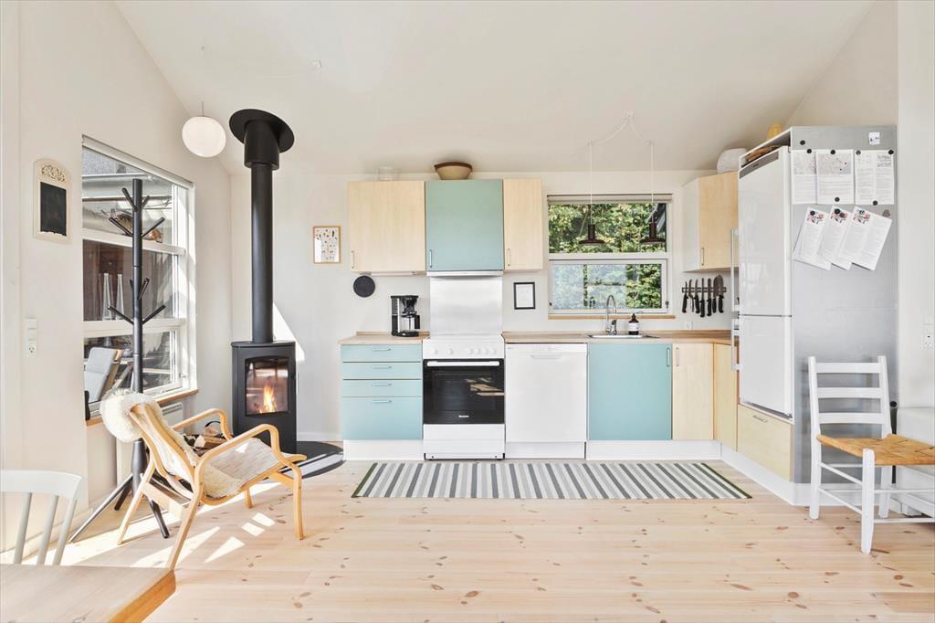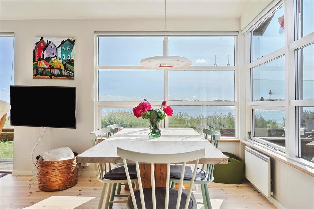 Det arkitekttegnede strandhus er lyst og smagfuldt indrettet i enkel nordisk stil med trægulve, hyggelig brændeovn og loft til kip. De store sydøst vendte glaspartier mod vandet sikrer et ganske særligt lysindfald i det rummelige køkken/opholdsrum og giver uforstyrret panoramaudsigt ud over Lillebælt mod øerne Fyn, Brandsø og Bogø. De to soveværelser er udstyret med dobbeltsenge (140x200 cm), og i stuen findes en ekstra sovesofa. Stort garderobeskab i det ene soveværelse. Fra såvel stue som begge soveværelser er der glasdøre direkte ud i det fri.