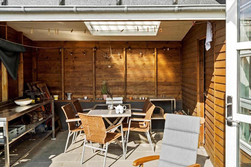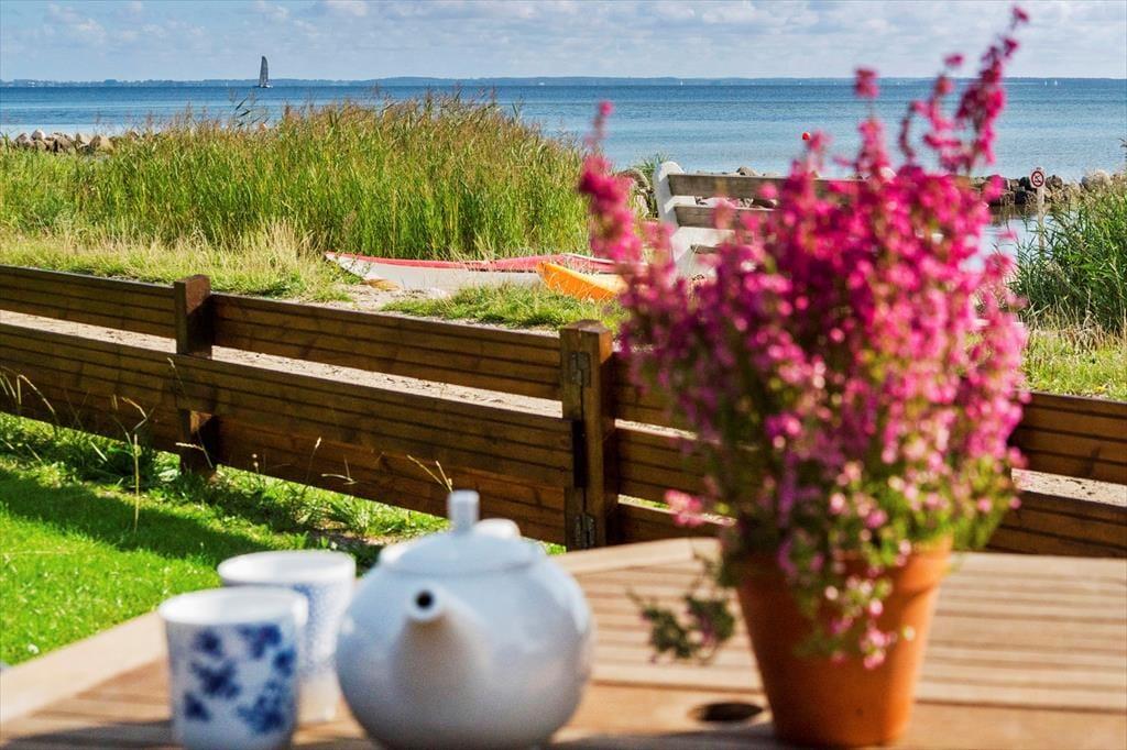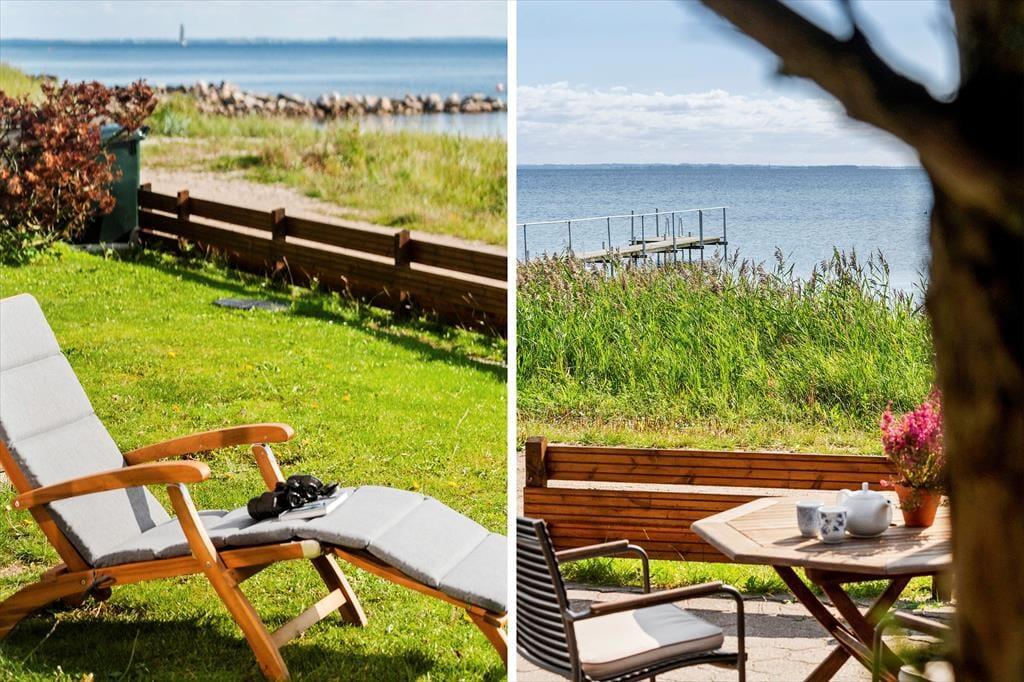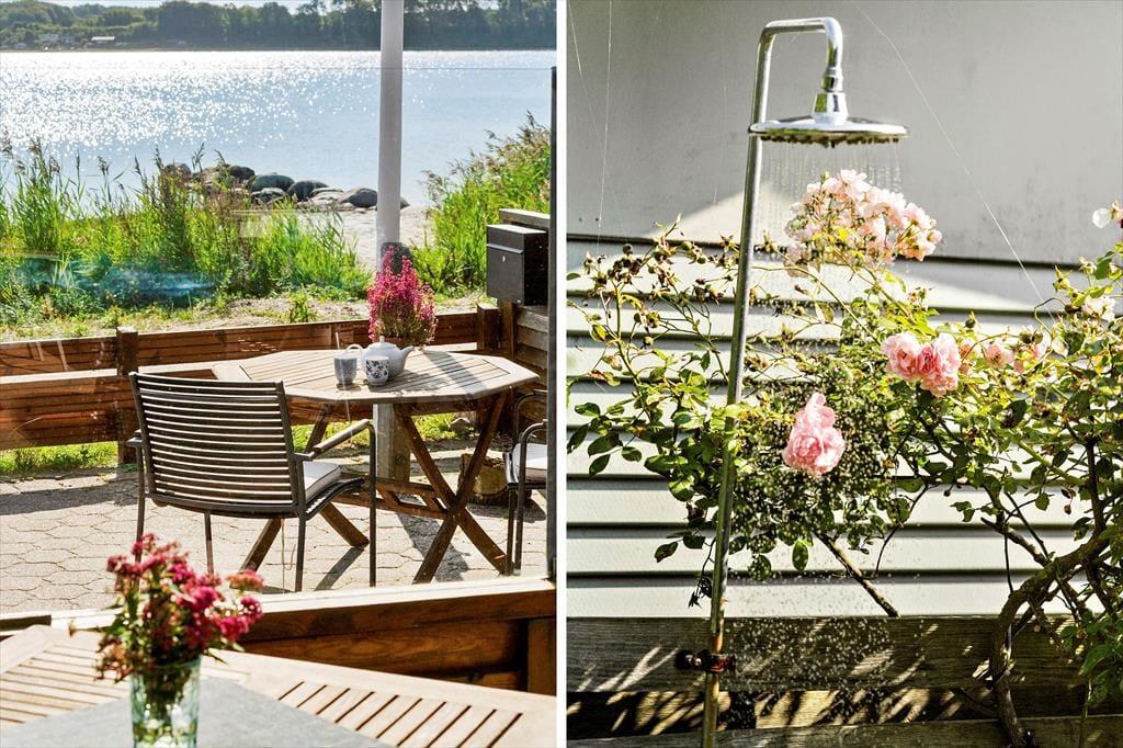 Morgenkaffen kan ofte nydes ved det lille cafébord på træterrassen foran huset, mens den store, delvist overdækkede udsigtsterrasse mod sydvest med flere haveborde indbyder til fælles måltider. Huset ligger fredeligt i læ neden for skrænten, og grill, parasoller, gode liggestole og afskærmede hyggekroge udvider de udendørs muligheder. Hejlsminde Bugt er et populært sejlerparadis med perfekte forhold for windsurfing, kajak og paddleboard, en sit-on-top-kajak og en ældre havkajak står til rådighed for husets gæster (på eget ansvar). Ikke mindst børn vil sætte pris på den fine sandstrand og den offentlige badebro foran huset, og efter en strandtur kan saltvand og sand skylles af under udebruseren.