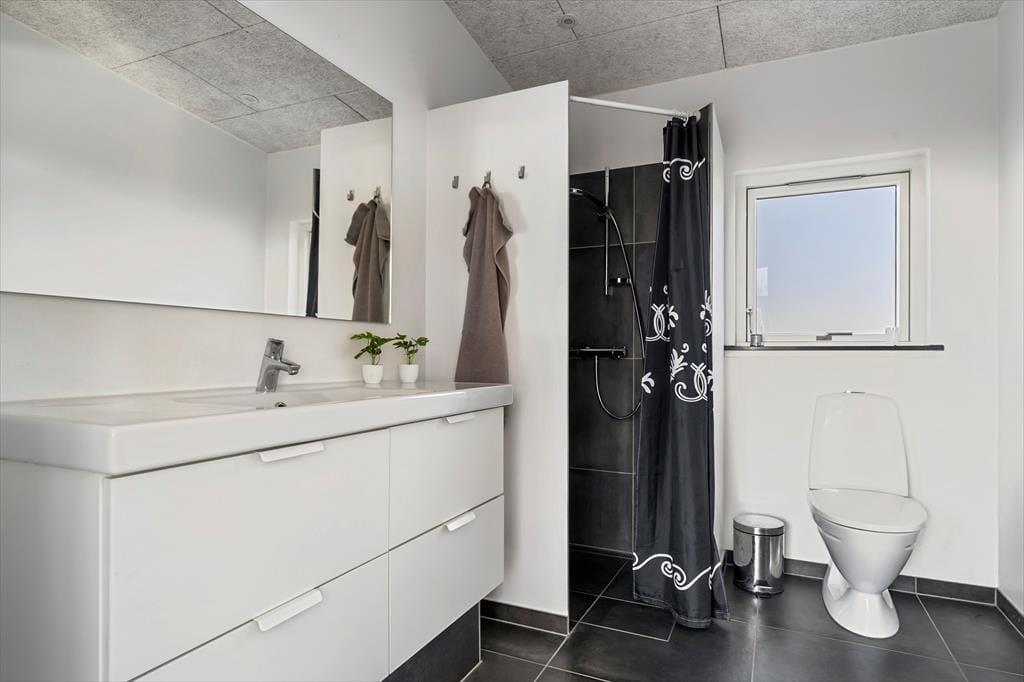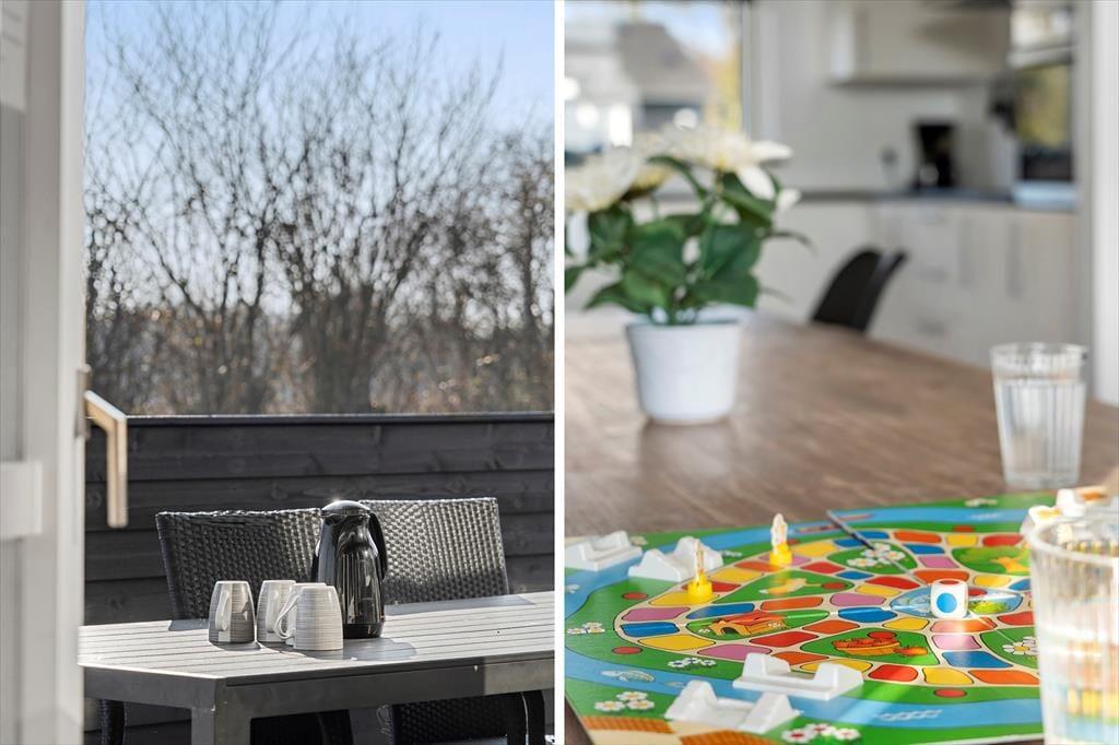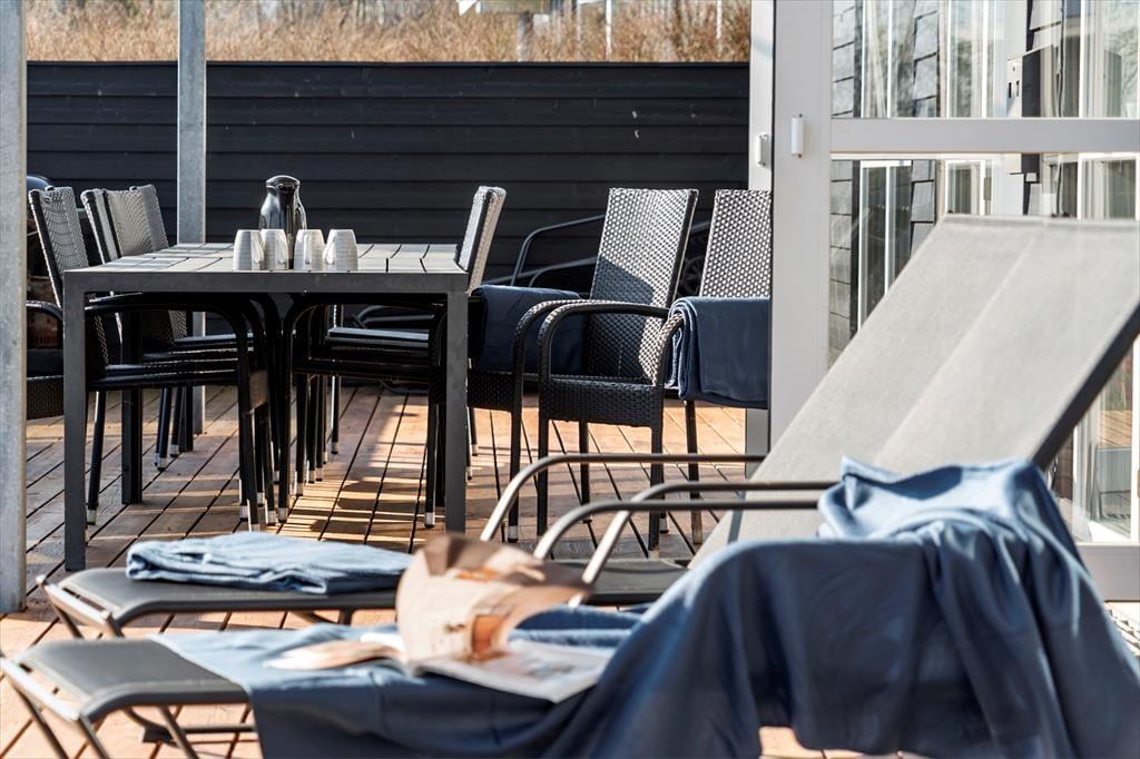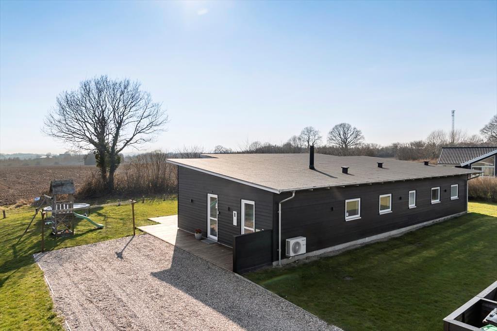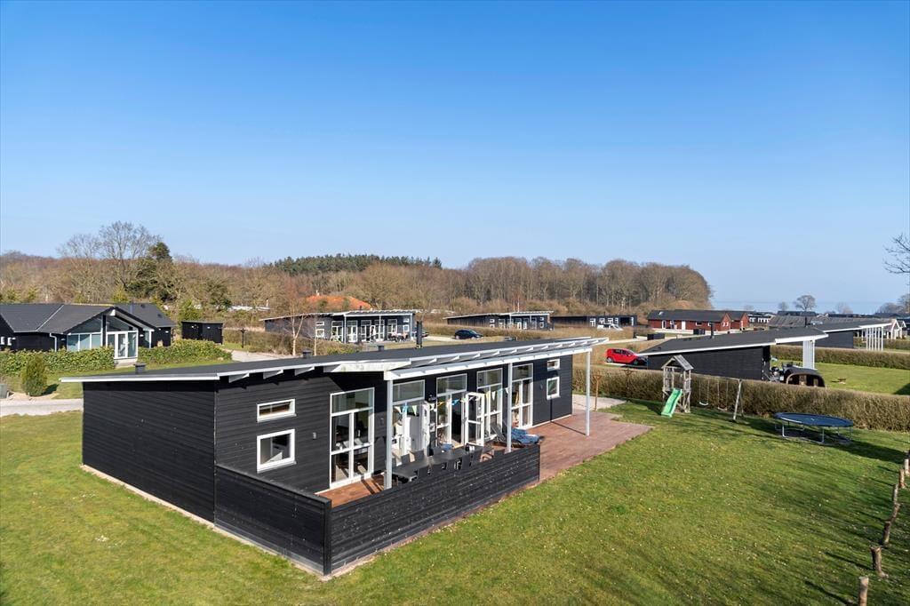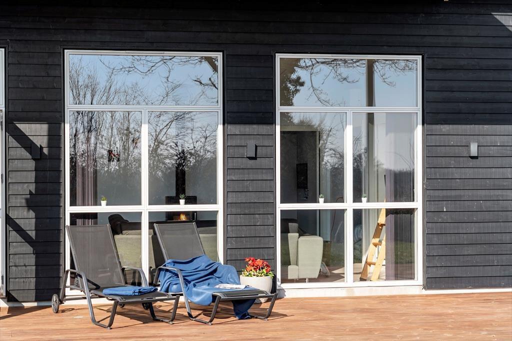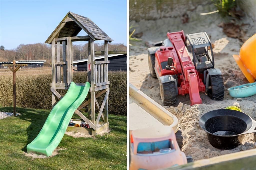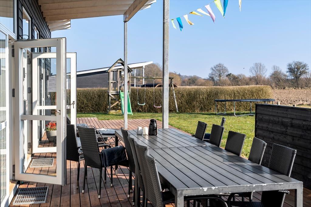 Sommerhuset har en stor, overdækket terrasse, hvor du kan nyde den friske luft og udsigten til de naturskønne omgivelser. Her kan du starte dagen med en kop kaffe, mens solen stiger op over landskabet, eller afslutte aftenen med en hyggelig middag under åben himmel. Børnene vil elske de mange legemuligheder i haven, hvor både trampolin og legetårn indbyder til sjov og udforskning. Imens kan de voksne slappe af i komfortable havemøbler og nyde den rolige atmosfære.