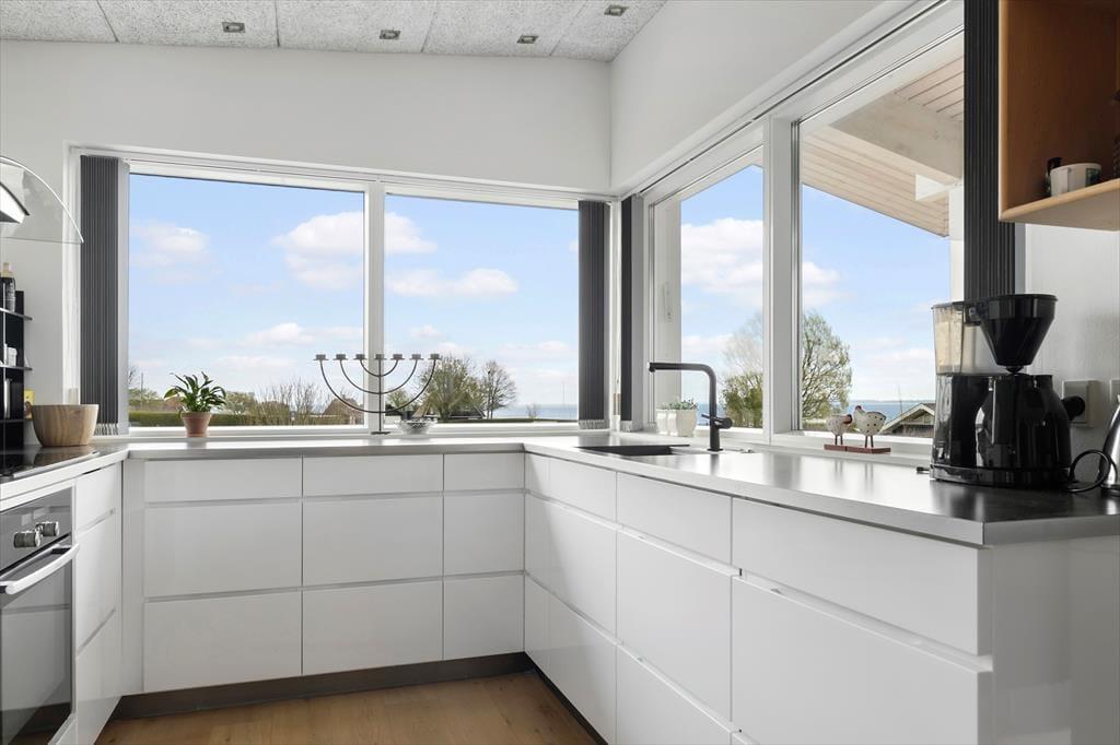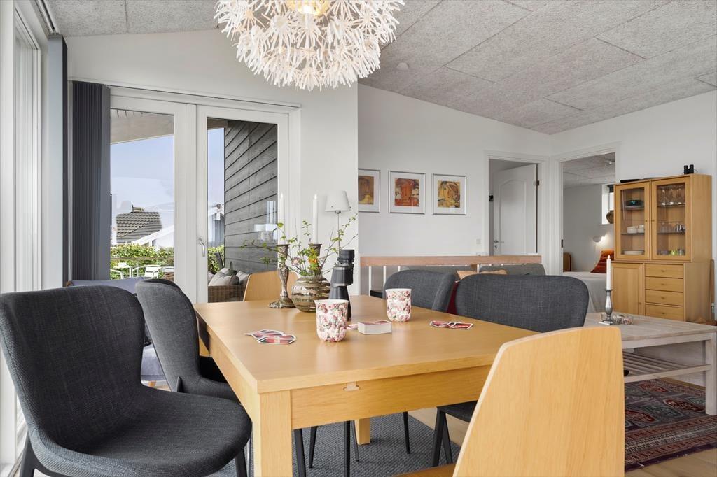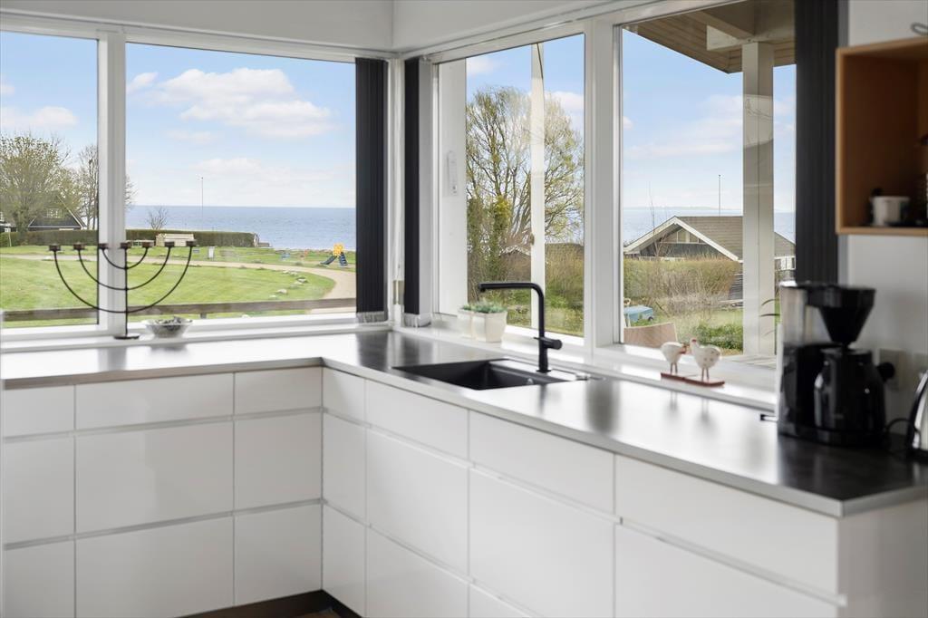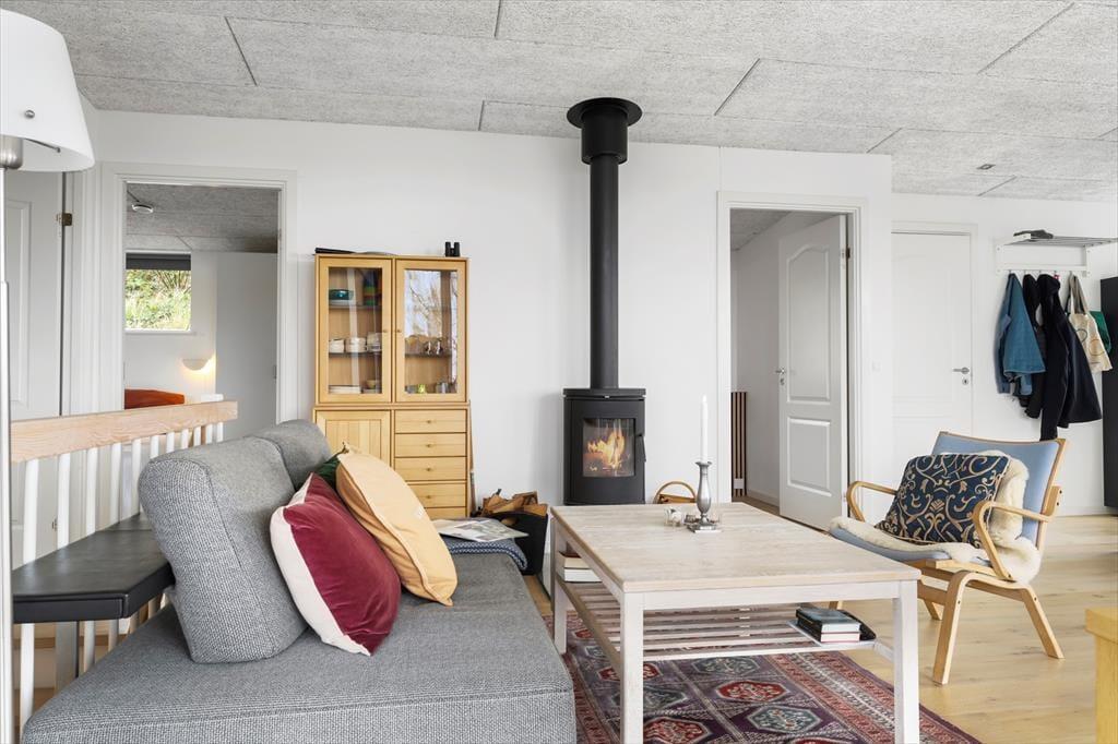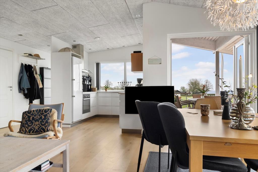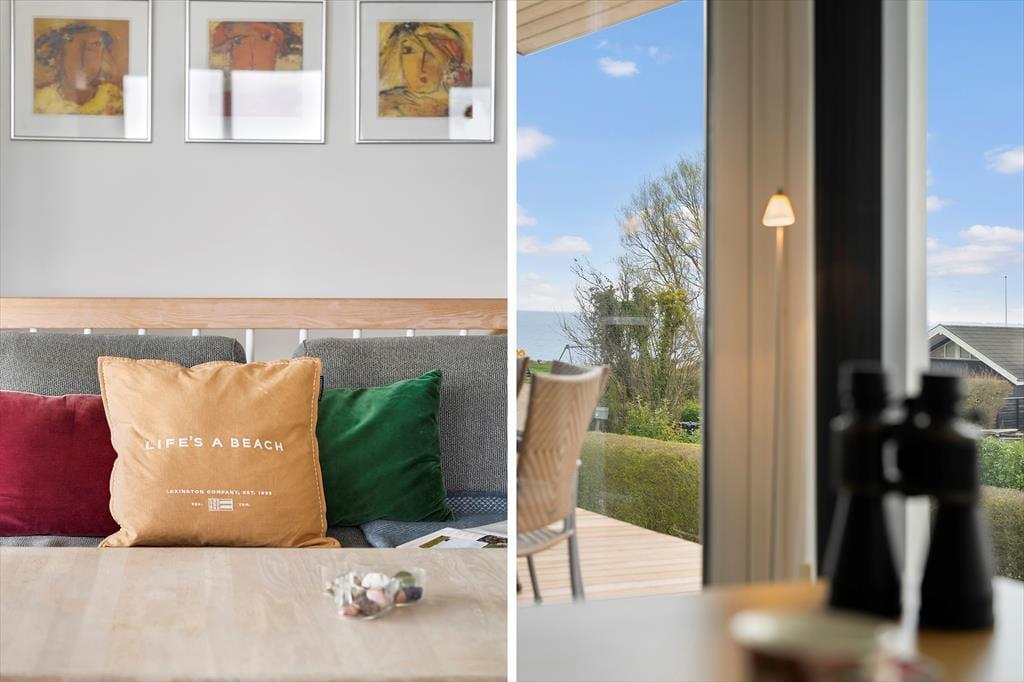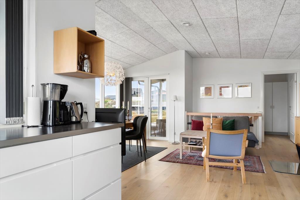 Allerede når du træder ind i sommerhuset, mærker du den lette og luftige stemning, der præger hele huset. Det lyse interiør, de store vinduespartier og det åbne opholdsrum giver en skøn fornemmelse af frihed og ferie ro, mens det moderne køkken og den hyggelige stue inviterer til fælles, stunder og nærvær. Fra stuen har du fri udsigt til himmel og hav, og du kan følge dagens skiftende lysindfald fra første parket. Det rummelige badeværelse byder på lidt ekstra hverdagsluksus i form af en sauna – perfekt til at varme kroppen op efter en frisk gåtur ved vandet. Huset er indrettet med fokus på både æstetik og funktionalitet, så det bliver nemt at føle sig hjemme fra første øjeblik.