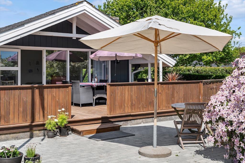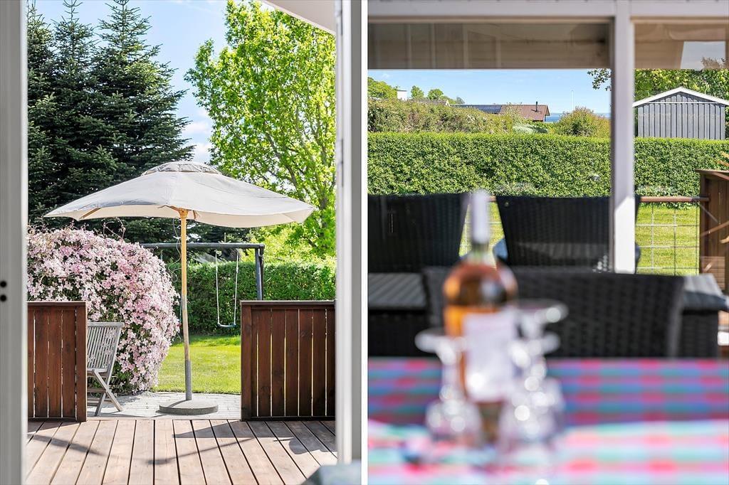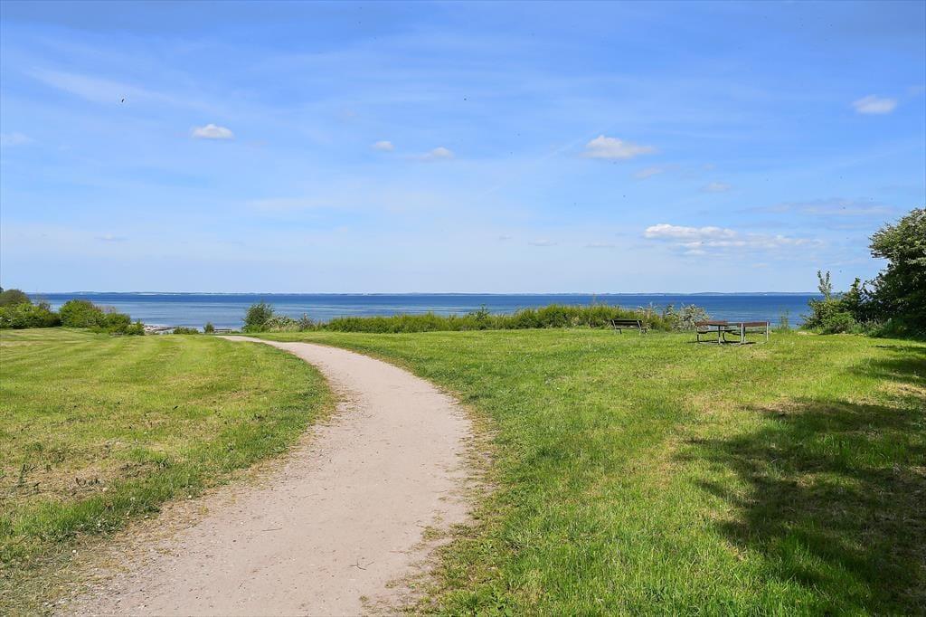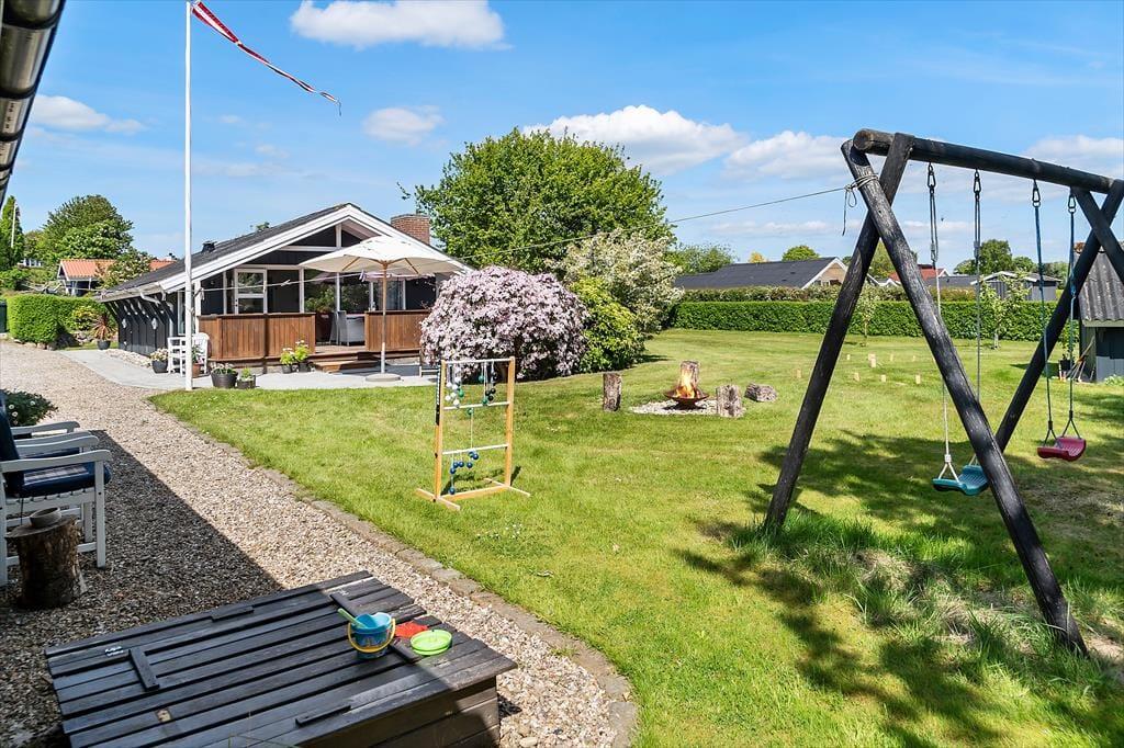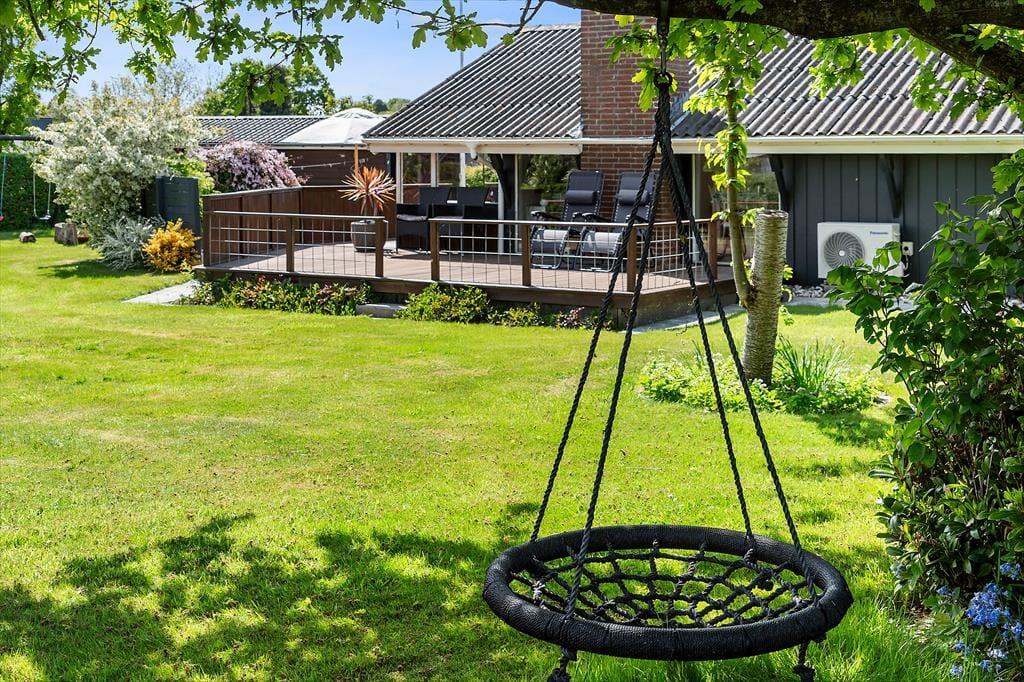 Udendørs venter flere skønne terrasser – én med kig til vandet og én overdækket, som er perfekt til lange sommeraftener i læ for dug og dugdråber. Her kan du tænde op i grillen, læne dig tilbage og lade feriefreden sænke sig. Haven er børnevenlig og grøn, med både gynge og sandkasse, som indbyder de mindste til leg under åben himmel. Omgivelserne er rolige og naturskønne, og da huset ligger for enden af en blind vej, er her næsten ingen trafik – kun fuglesang og vinden i træerne som baggrundsmusik. Det er et sted, hvor man automatisk sætter tempoet ned og nyder de små, enkle øjeblikke.