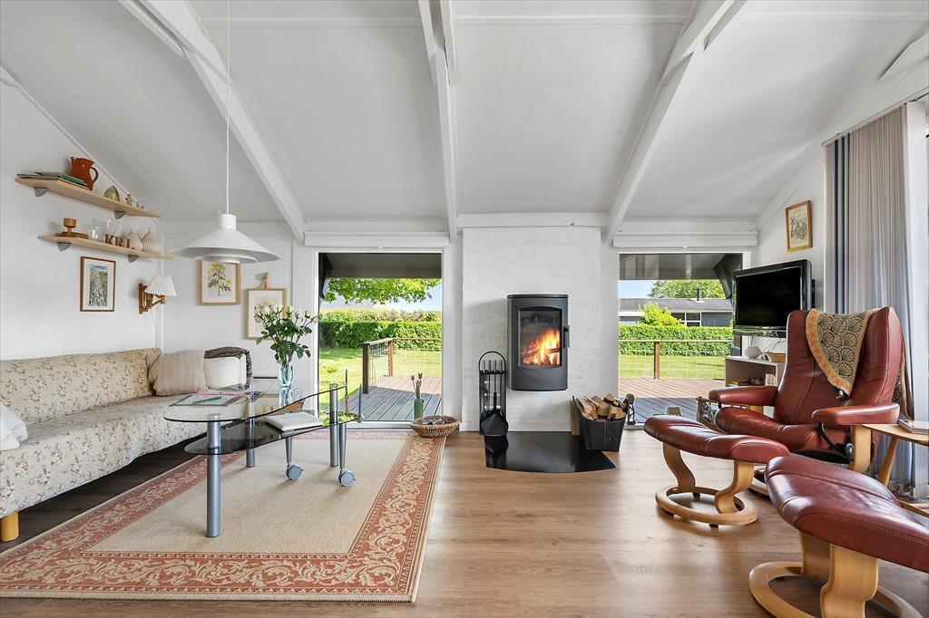 Når du træder ind i sommerhuset på Humlevænget, bliver du mødt af en lys og venlig atmosfære med loft til kip, der giver en skøn rumfornemmelse og luft omkring dig. Huset emmer af klassisk sommerhushygge og danner en indbydende ramme om feriedagene – uanset årstid. Det åbne opholdsrum samler stue, spiseplads og køkken i ét, så der er plads til fællesskab og nærvær. Her kan du nyde morgenkaffen med udsigt til haven, slappe af med en bog i sofaen eller samles til brætspil, når aftenen falder på. Store vinduespartier trækker lyset ind og binder inde- og udeliv sammen, så du altid har fornemmelsen af at være tæt på naturen.