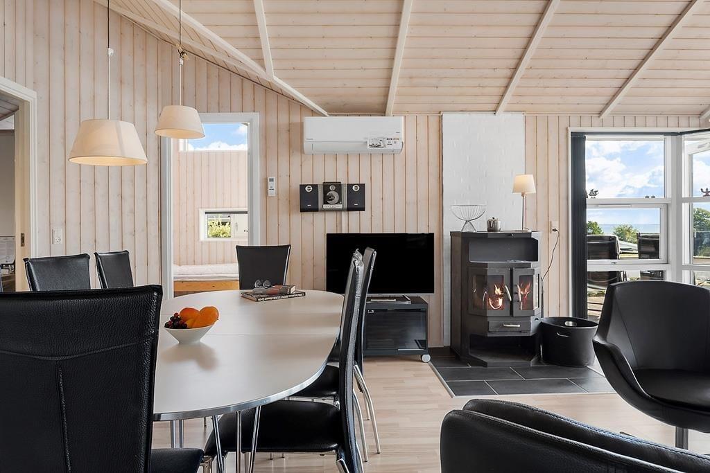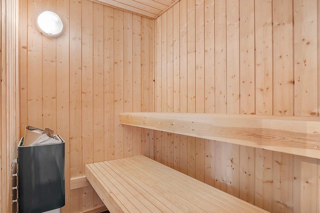 Sommerhuset på Teglgårdvej byder dig indenfor til et lyst og indbydende hjem, hvor stemningen straks føles både afslappet og hjemlig. Det centrale opholdsrum har loft til kip og store vinduespartier, der lader dagslyset strømme ind og skaber en åben og luftig atmosfære. Herfra er der frit udsyn til haven og de grønne omgivelser – og et glimt af havet i horisonten, der hele tiden minder dig om, hvor tæt du er på kysten. Det velindrettede køkken ligger i åben forbindelse med stuen og danner rammen om både madlavning og hyggeligt samvær, hvad enten det er morgenkaffe i ro og mag eller middagssnakke med familien. Sommerhuset har to badeværelser, hvor det ene forkæler dig med både sauna og spabad – perfekt til de kølige aftener, hvor du har brug for at slappe helt af og lade op.