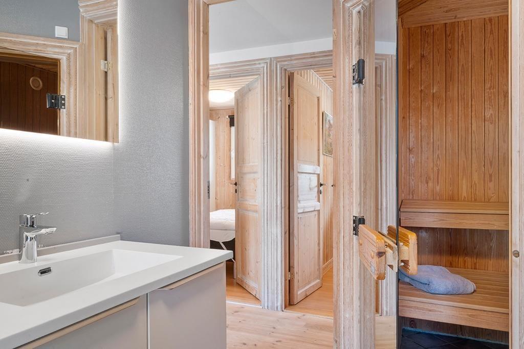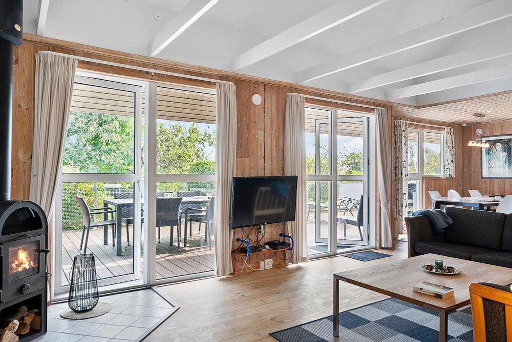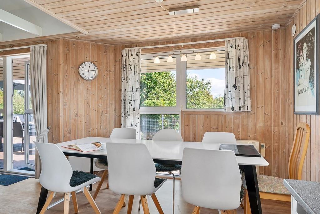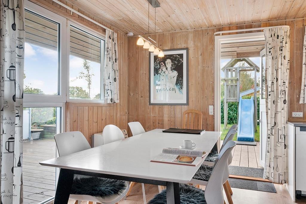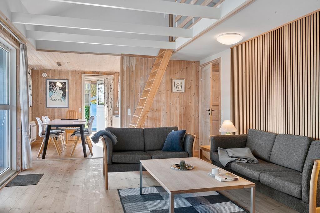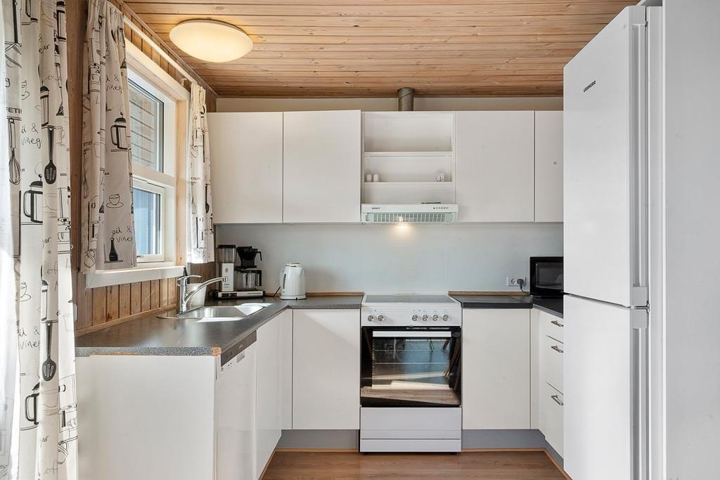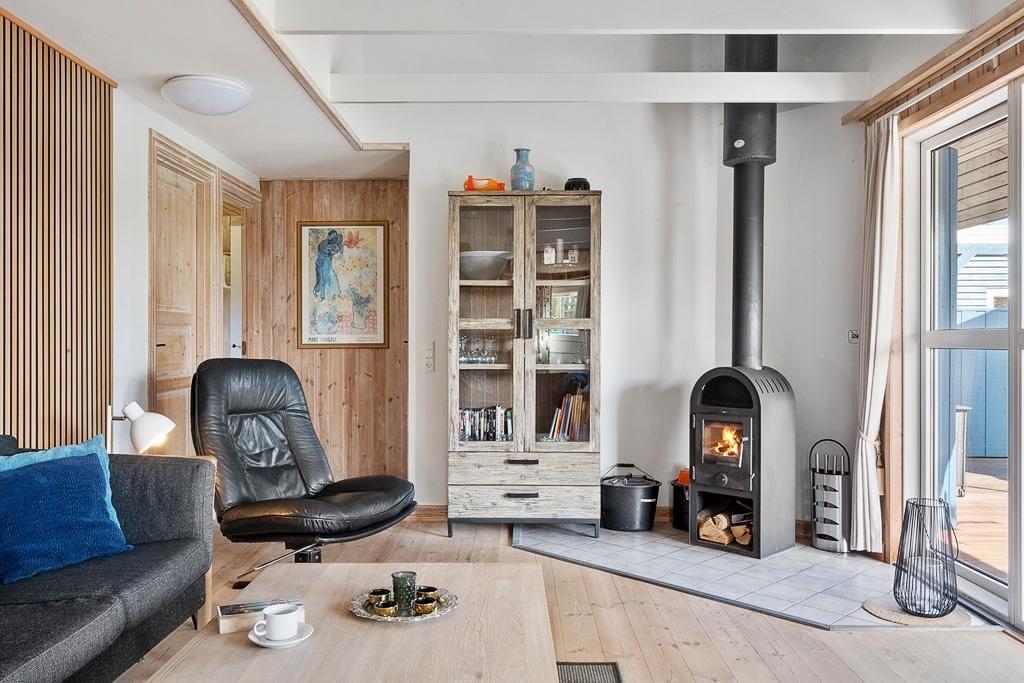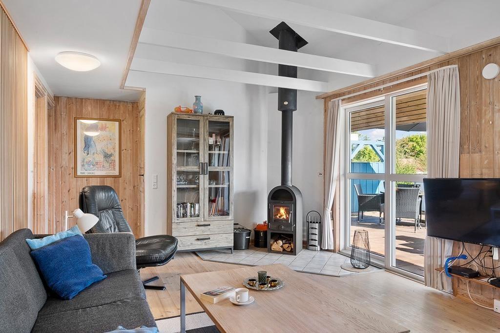Indenfor mødes du af en lys og hyggelig atmosfære, der straks får skuldrene til at sænke sig. Husets indretning er enkel og hjemlig, så du hurtigt føler dig godt tilpas. I stuen kan du samles med familien foran den knitrende brændeovn, der spreder varme og ægte sommerhushygge, mens lyset strømmer ind gennem vinduerne. Det åbne køkken-alrum skaber de perfekte rammer for fælles måltider, brætspil og lange samtaler, der fortsætter langt ud på aftenen. Badeværelset byder på wellness i form af både sauna og spabad – en skøn måde at slutte dagen af på, hvad enten du har været ude at bade i havet eller på tur i området.