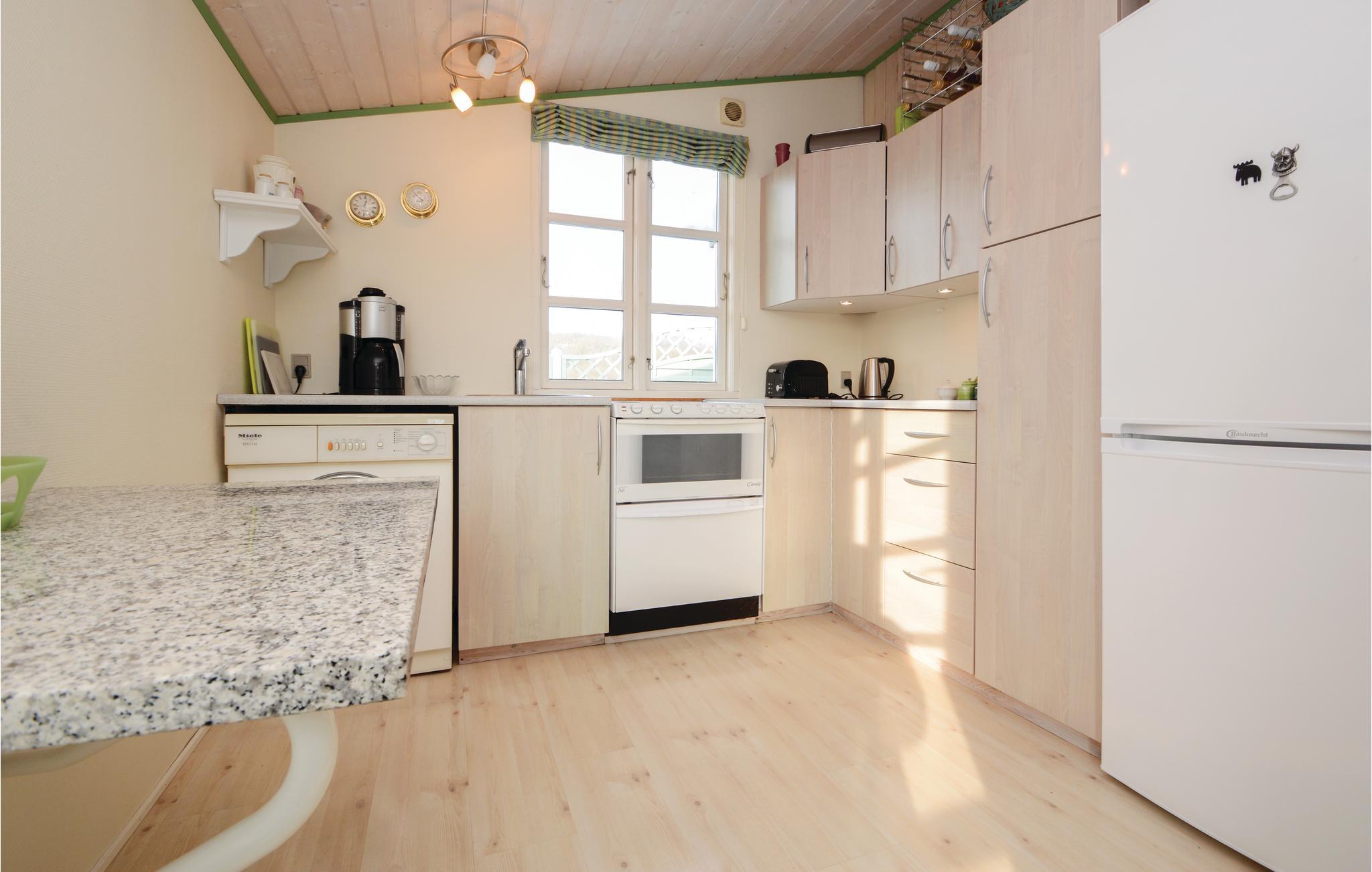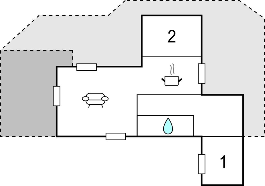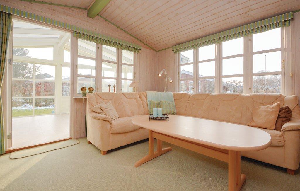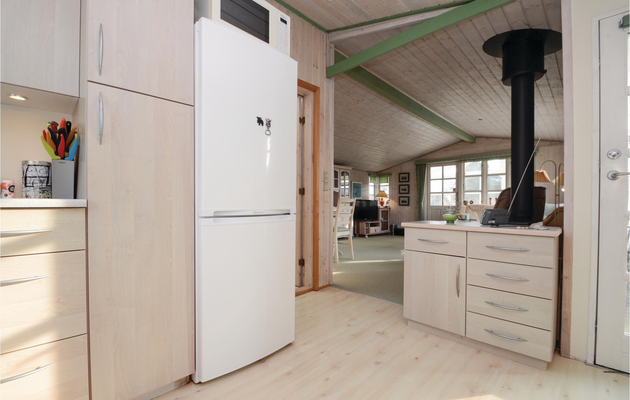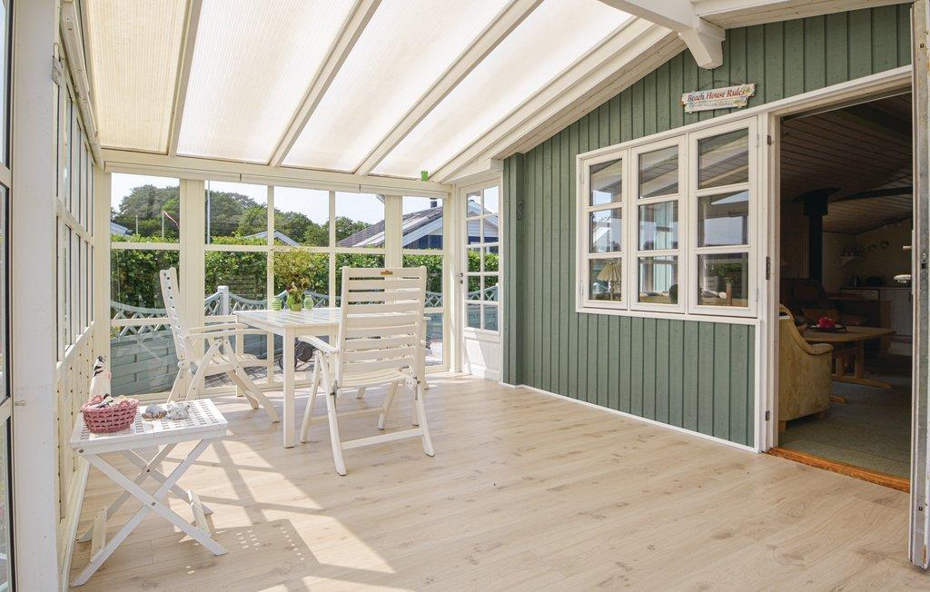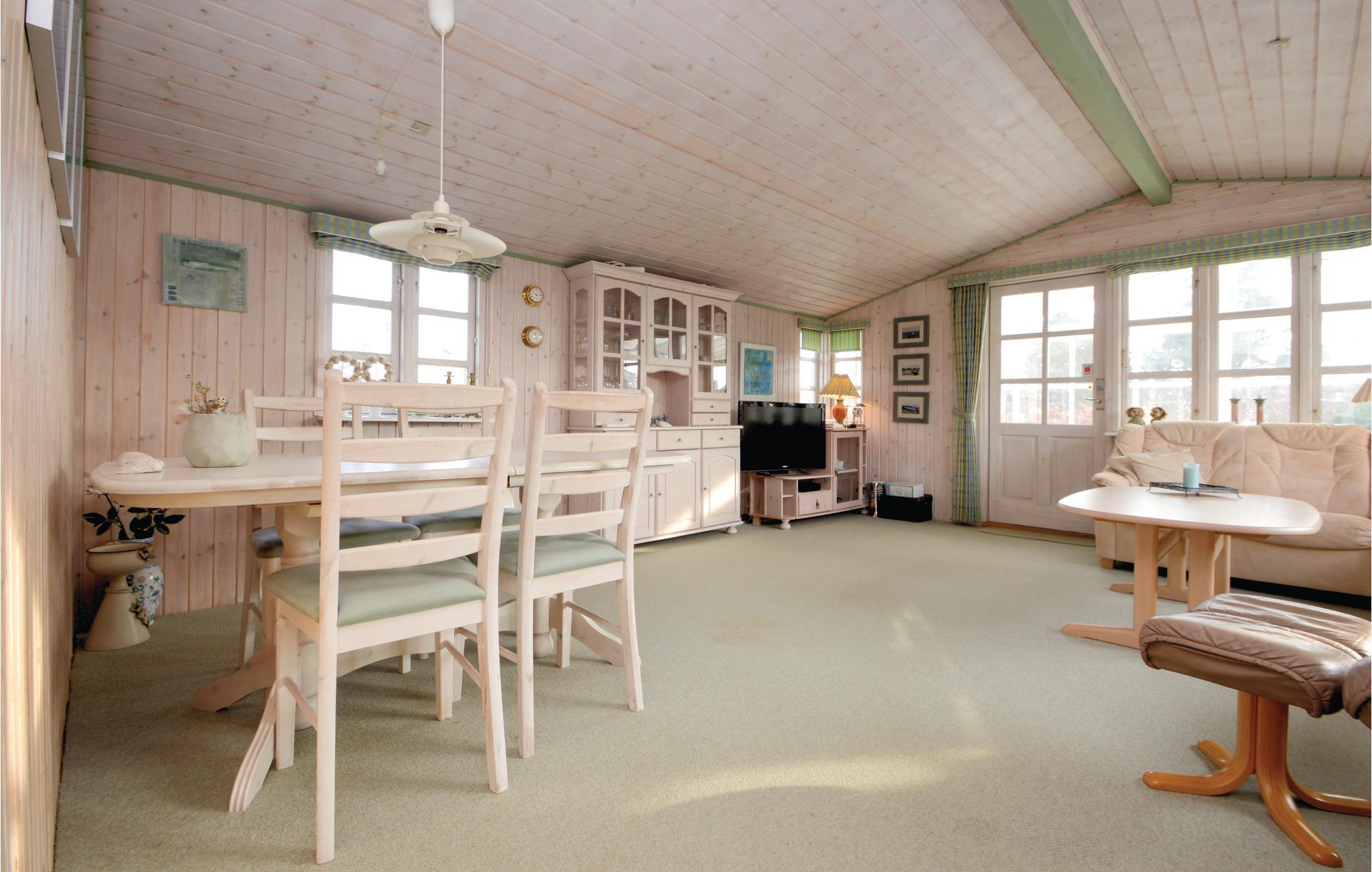 I huset er der en stor lys stue med brændeovn samt varmepumpe til billig opvarmning samt køkkenafdeling, herfra er der adgang til to gode separate soverum. Derudover et godt badeværelse med brus. Det bliver sikkert i den store og lyse udestue I vil opholde jer det meste af tiden, her kan I nyde de lyse sommeraftener og kan åbne skydedørene og få frisk luft, hvis det bliver for varmt. Fra udestuen er der direkte udgang til en meget stor terrasse med både sol og skygge.