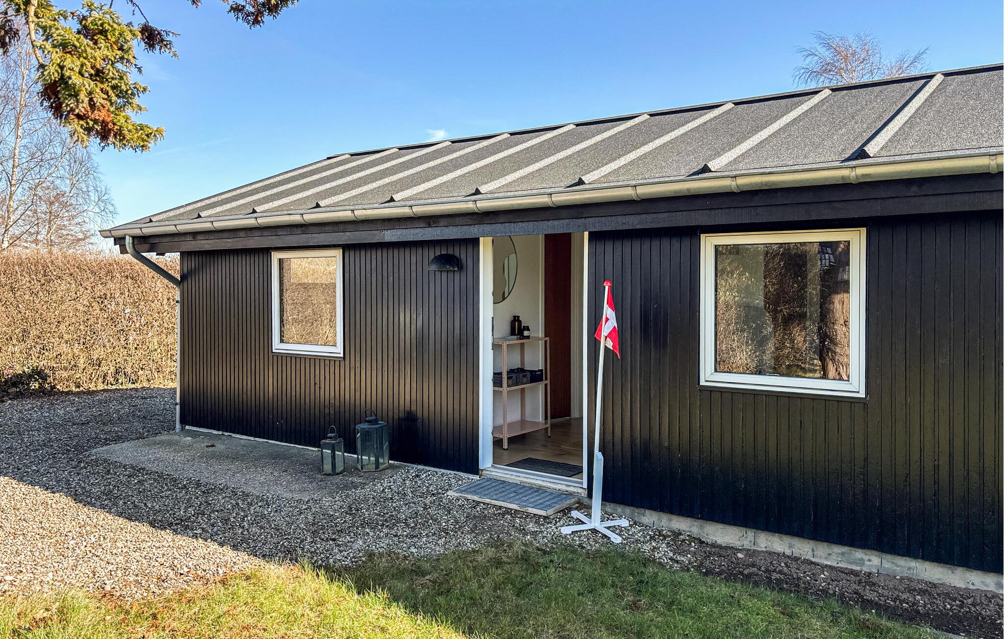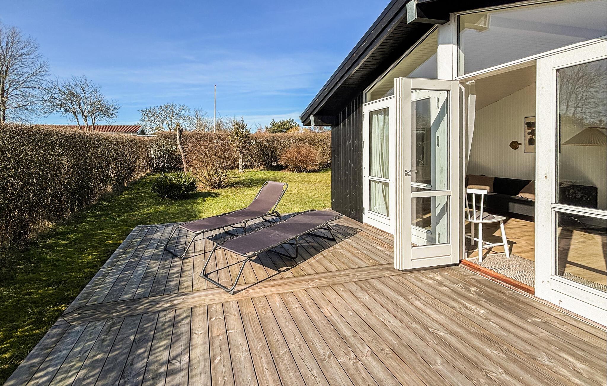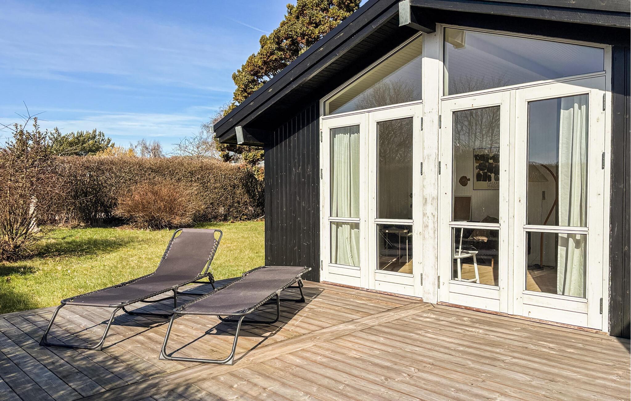 Nyd en fredelig ferie i et lyst træhus med stor terrasse og bålplads nær Hejsager Strand.
