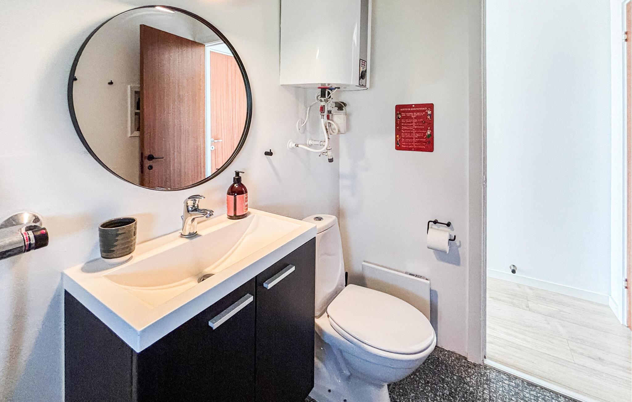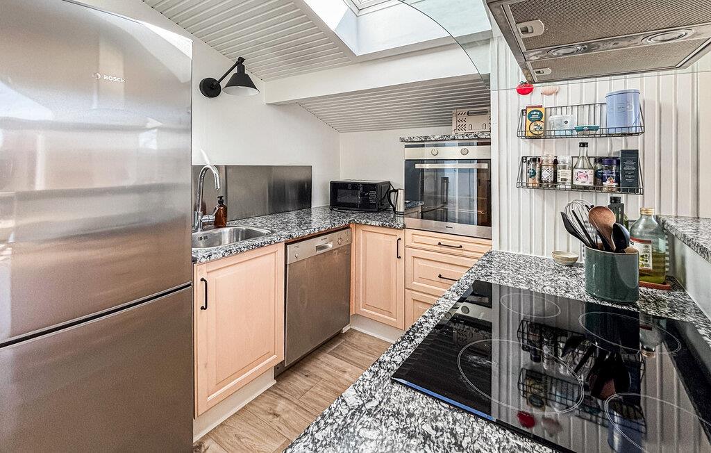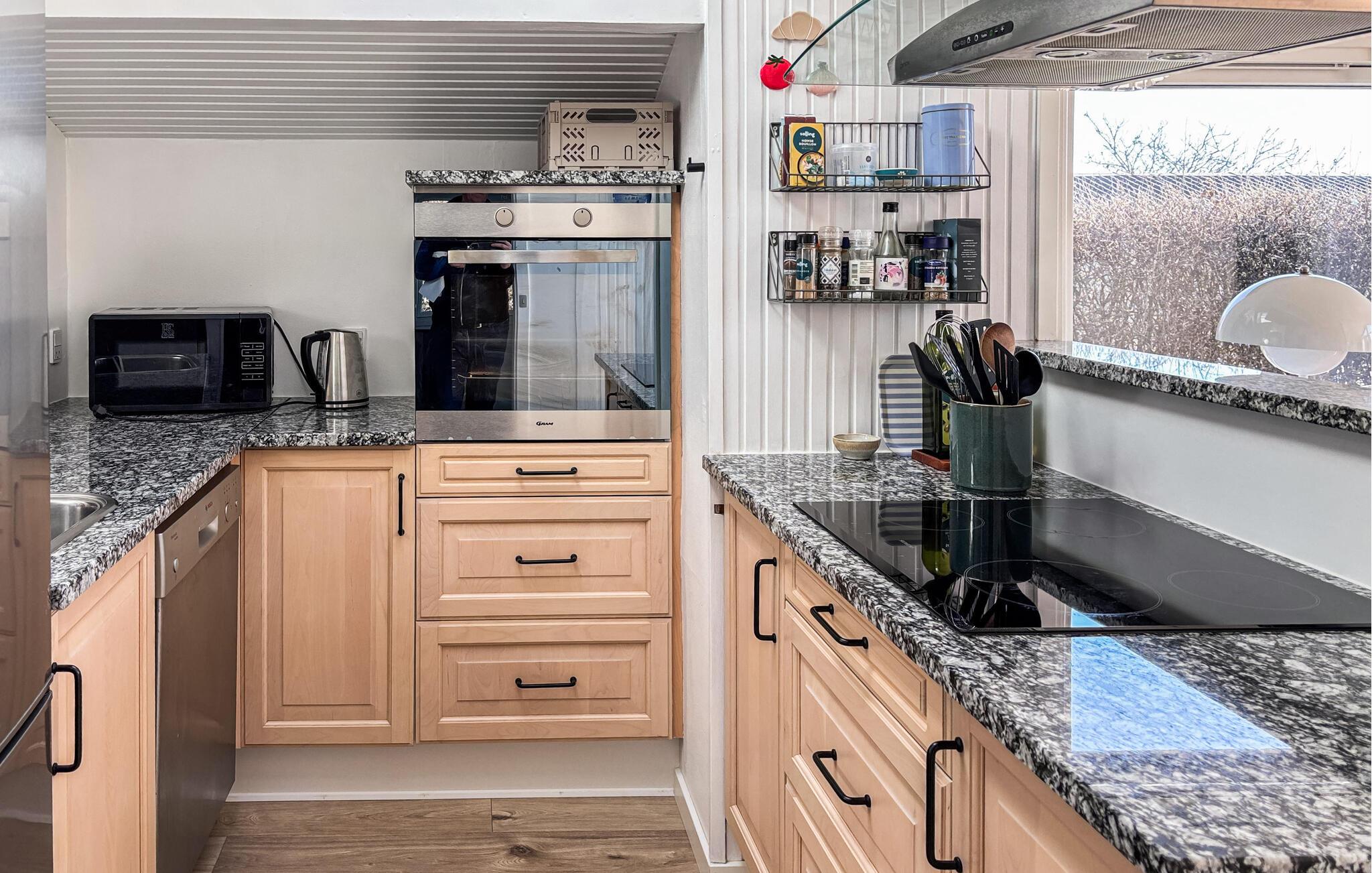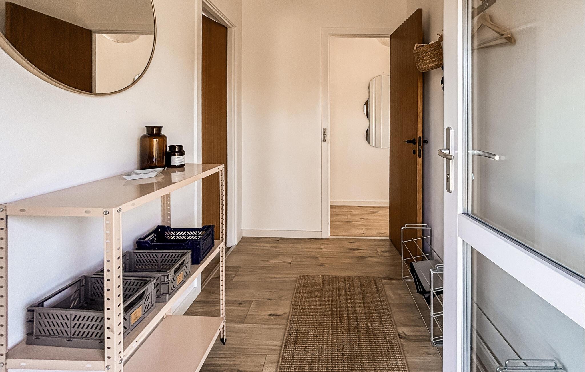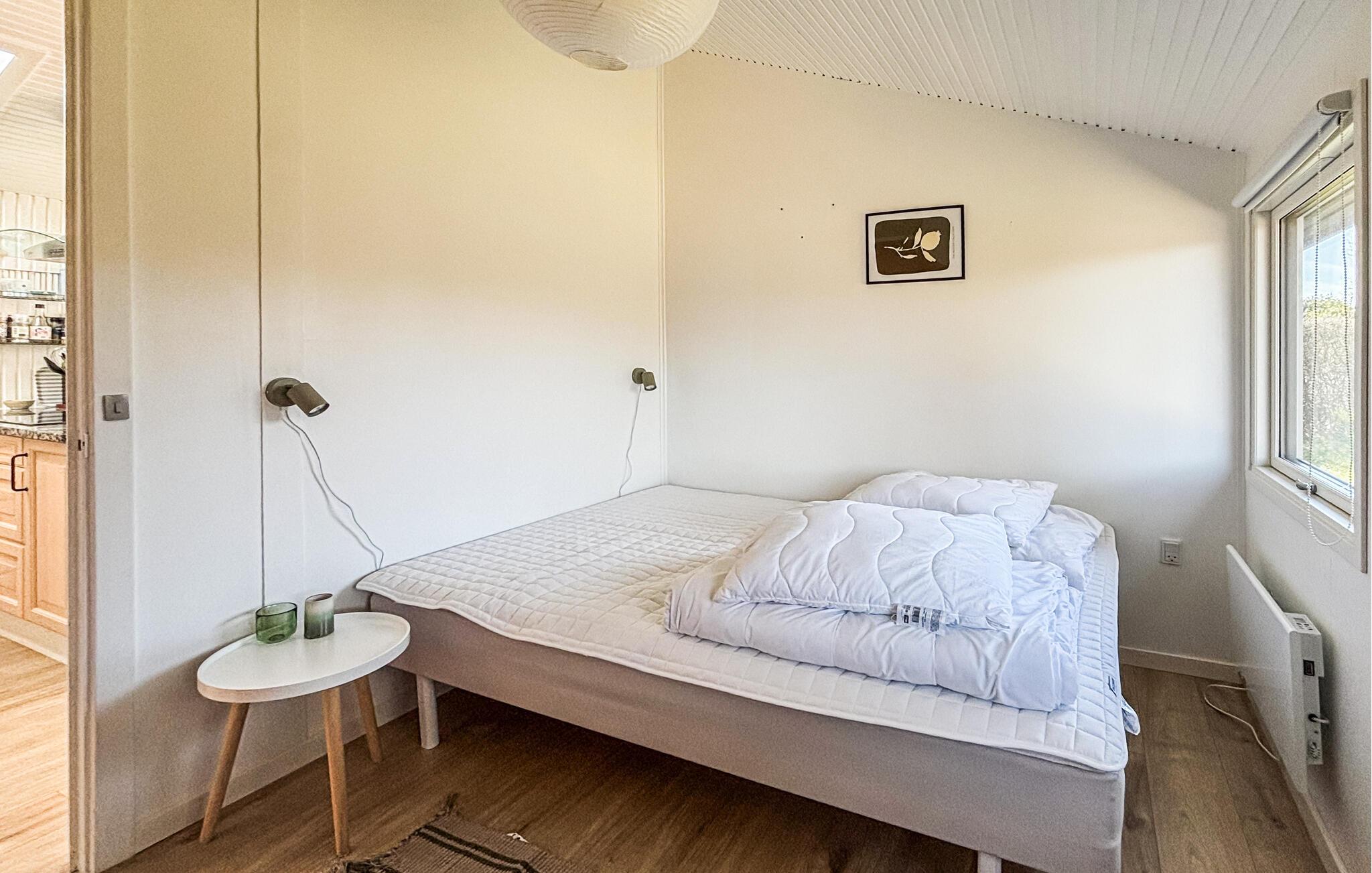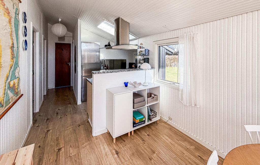 Træd ind i den lyse opholdsstue og nyd det indbydende, rene design. Store vinduer og lyse træpaneler skaber en behagelig atmosfære. Sæt jer godt til rette i sofaen og lad blikket vandre udenfor. Brug spiseområdet med direkte adgang til terrassen til fælles måltider. Det åbne køkken er kompakt og funktionelt og tilbyder alt, hvad I behøver for at tilberede jeres måltider.