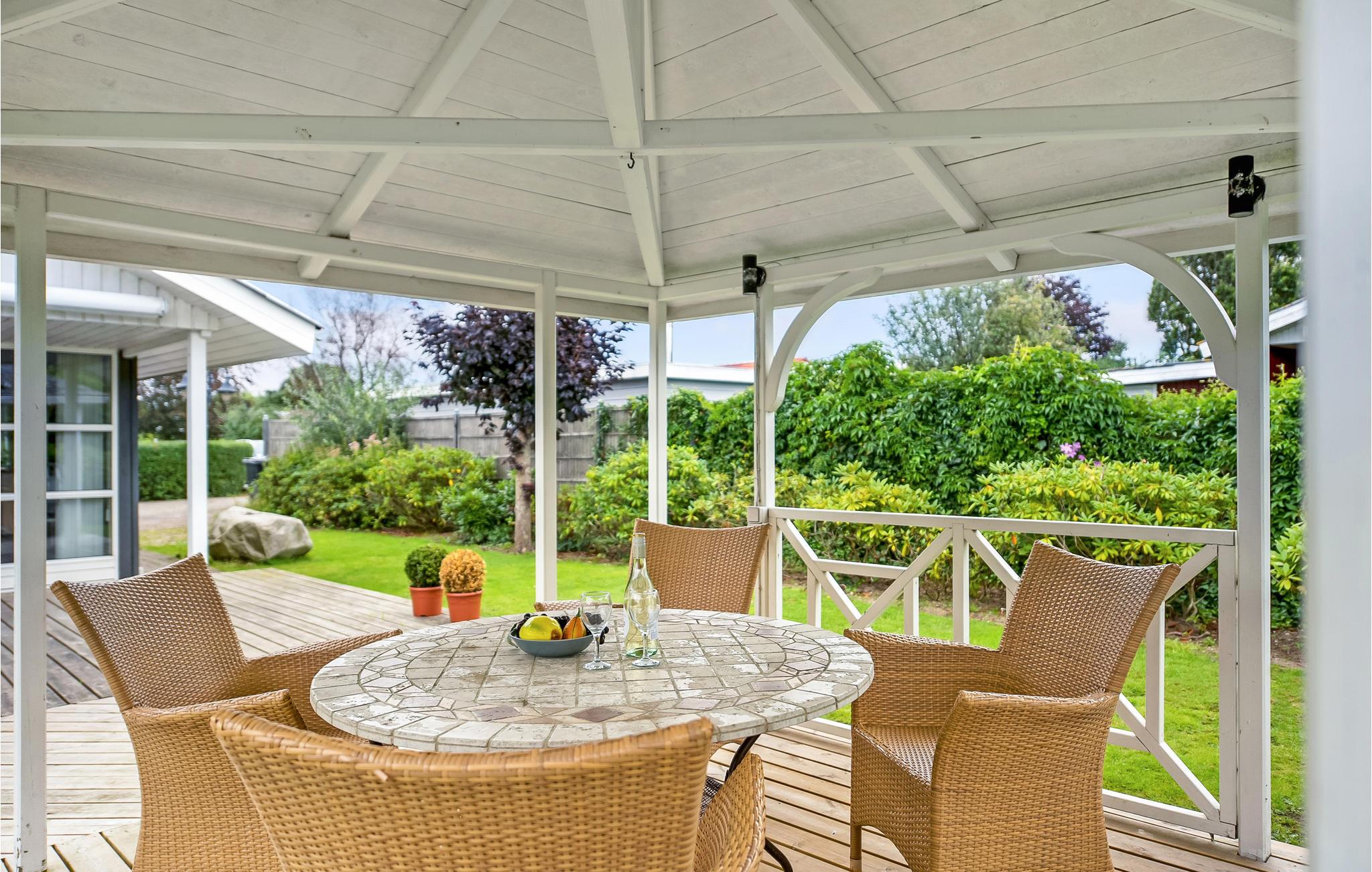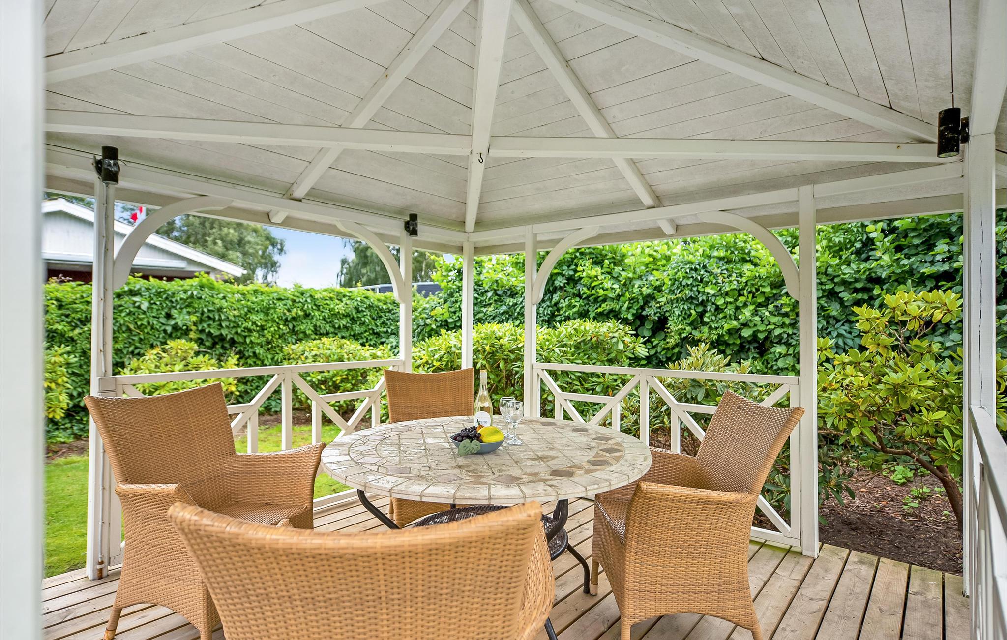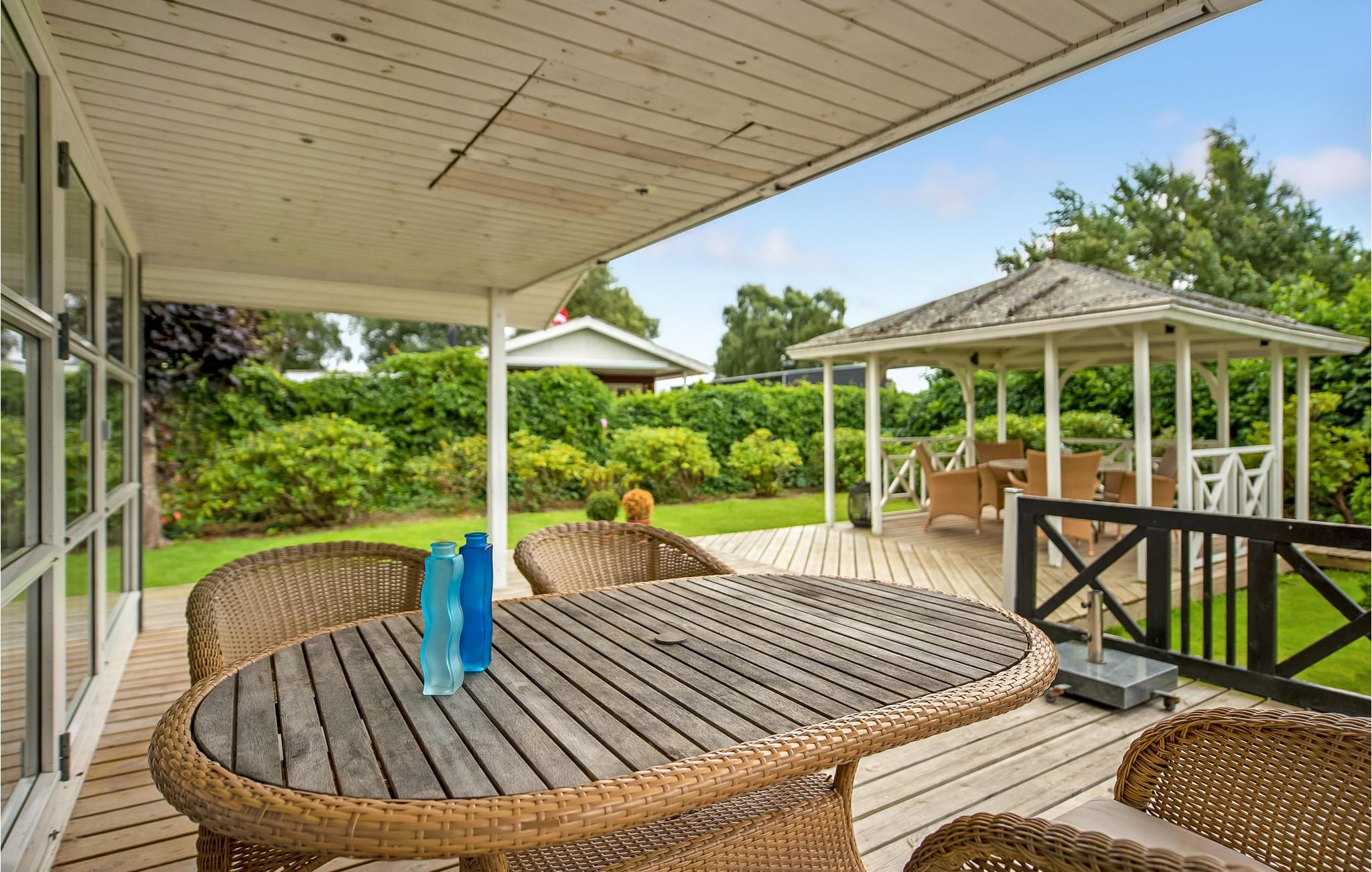 Udenfor venter både åbne og overdækkede sydvendte terrasser med udsigt over haven. Derudover byder haven på to smukke pavilloner, der er bygget som en forlængelse af træterrassen. Havemøblerne og grillen gør det let at nyde feriens måltider udendørs. Derudover venter det smukke vildmarksbad, som I frit kan bruge.