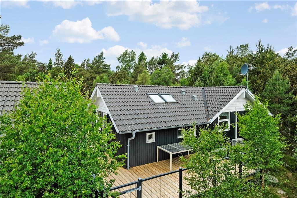 Den store grund er delvist indhegnet og dermed meget hundevenlig, og på alle sider har I en skøn udsigt til den omgivende natur. Sommerhuset har flere gode terrasser; åbne, hvor I kan nyde solens stråler og tilberede lækre måltider på grillen, og en overdækket del, som ligger i forlængelse af stuen og derfor er god til de lange og lune aftener.