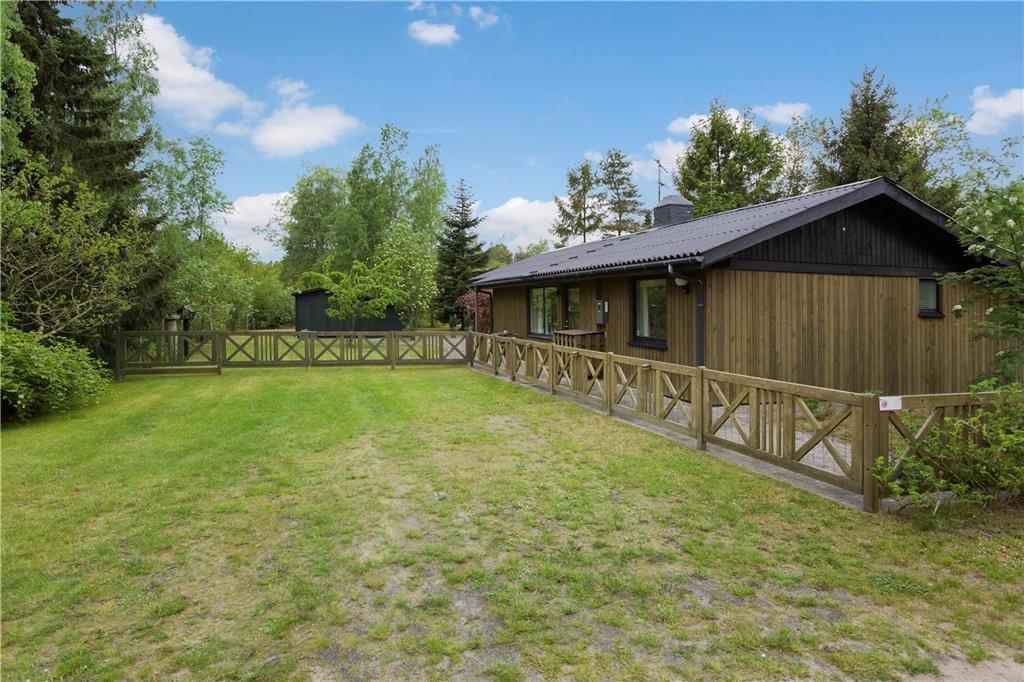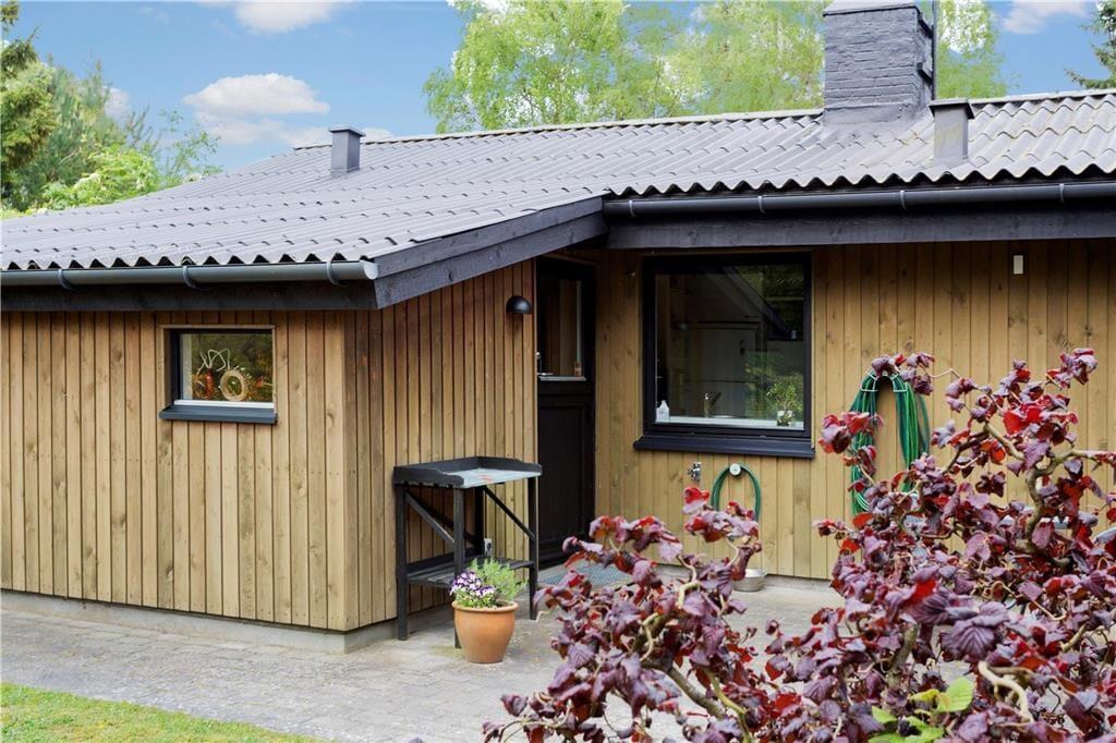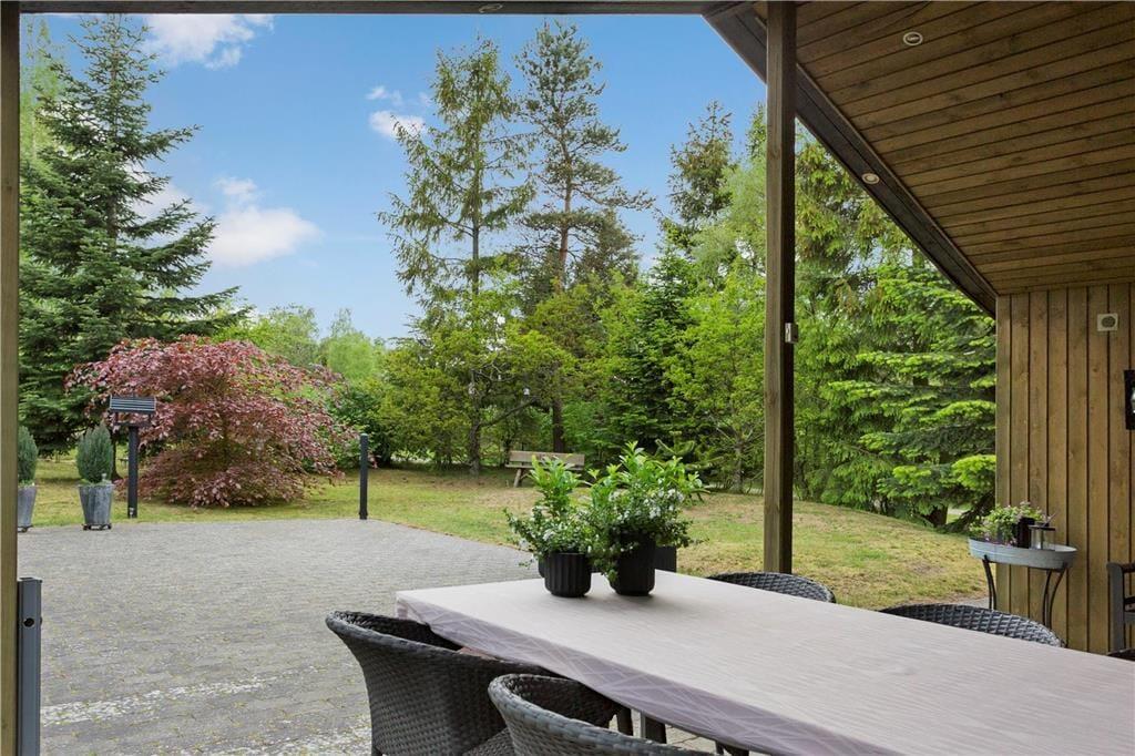Er vejret nærmere til solbadning frem for sofahygge, kan I åbne havedøren og træde direkte ud på den overdækkede terrasse. Herfra breder der sig et fliseareal hele vejen rundt om huset, så der er flere solkroge og opholdspladser med havemøbler at vælge imellem. Haven er hyggeligt anlagt med græsplæne og varieret beplantning – og de vilde dyr må også synes om stedet, for det kan ske, at et dådyr eller et par fasaner kommer på visit.