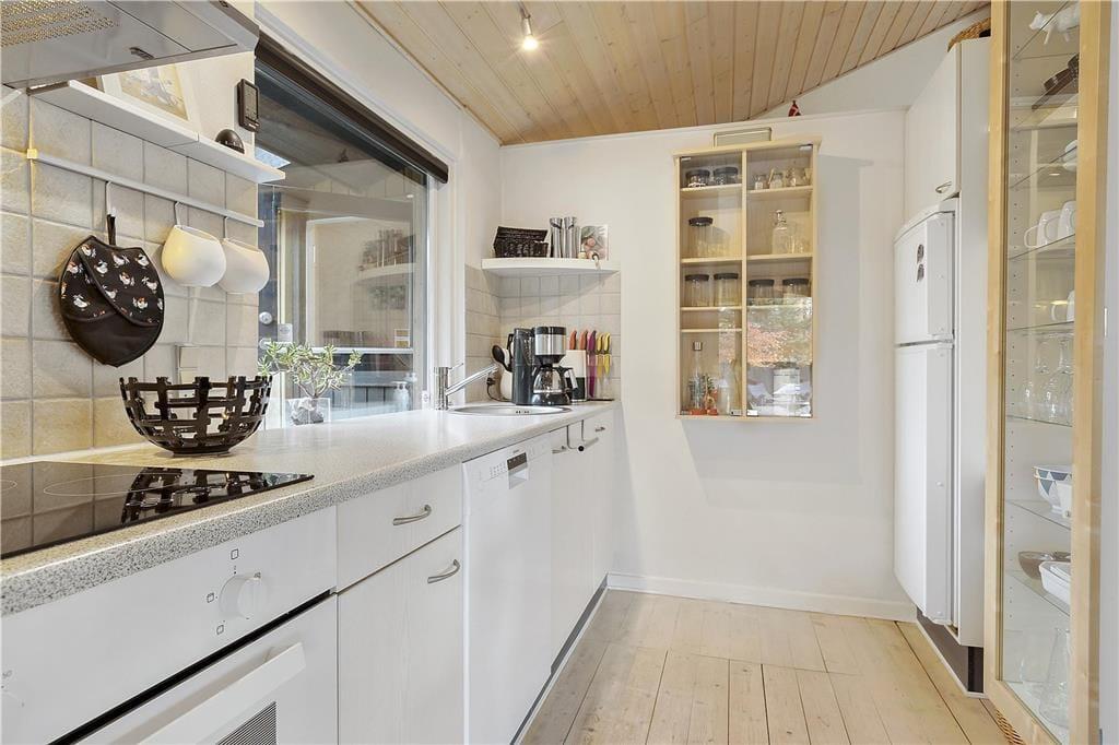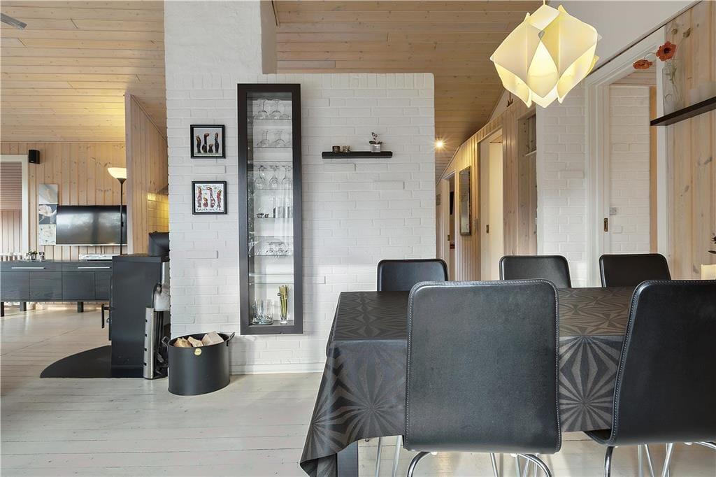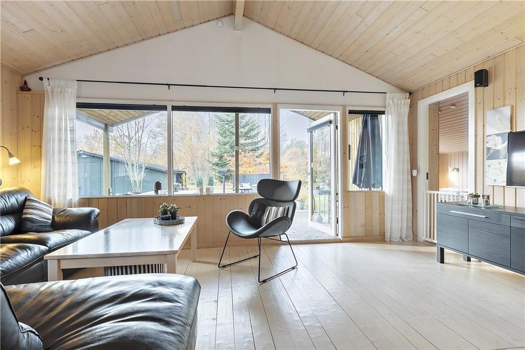 Huset, som er et klassisk sommerhus med træbeklædning både ind- og udvendigt, er opført i 1967. I 2010 blev det grundigt renoveret, og det har derfor en lys og moderne indretning med pænt interiør. Planløsningen er god med tre soveværelser, der ligger i hvert sit hjørne af huset. To af værelserne er hver især indrettet med to enkeltmandssenge, og det sidste værelse er udstyret med en sovesofa til to personer. Et pænt badeværelse med muret bruseniche er her også foruden en hyggelig stue, som er integreret med køkkenet. Den åbne forbindelse betyder, at I får glæde af brændeovnens varme, uanset om I forbereder aftensmaden eller om I slænger jer i sofaafdelingen med en god film på fladskærmen.